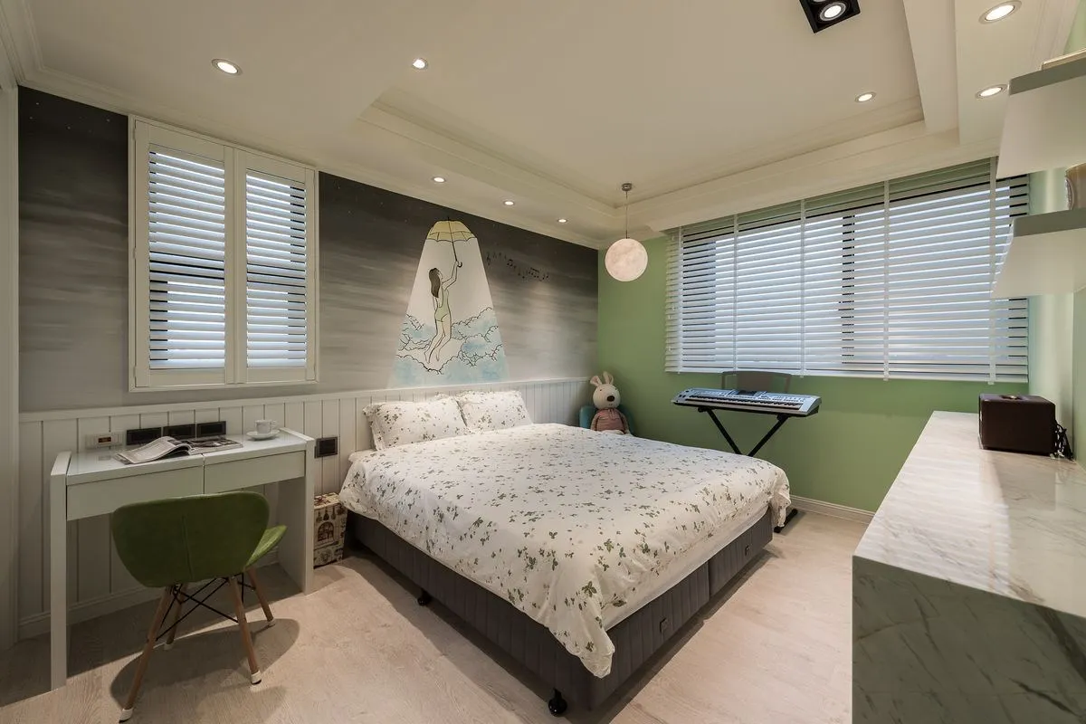 另一處則來到女兒房間,將活力色彩襯以潔淨純白,太過制式的材質或圖案無法使她滿意,特別邀請了專業彩繪師替圖案細膩勾勒修飾,完成了以「夜空中最亮的心」為題的掛畫,也成為整間臥室的焦點所在。各人各色的私領域空間,延續了這處大宅最開始鍾意的文化底蘊,在東西交融的生活場景中,漫延開展無限可能。
