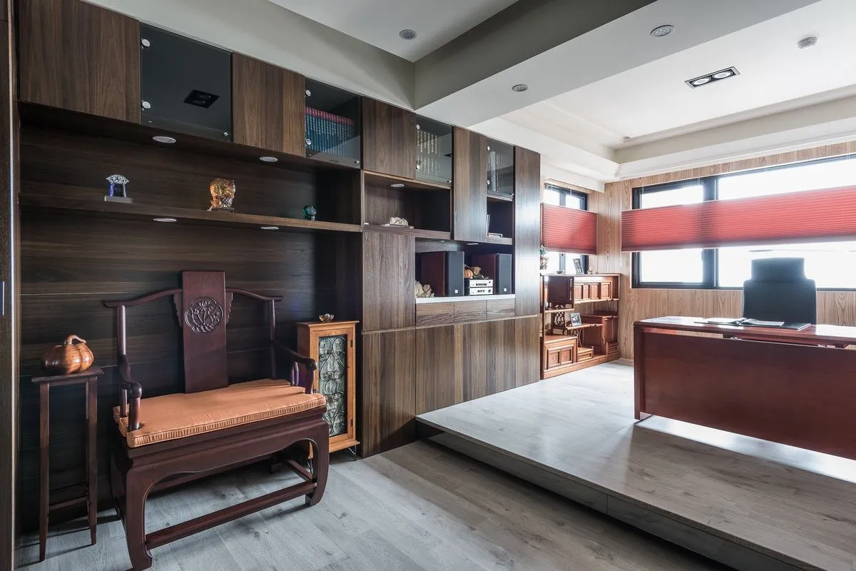 原來建物格局為四房,扣除臥室空間後僅剩一間狹小的書房,屋主若需辦公時則稍顯壓迫,故設計師將原有隔間破壞,透過拉門及隱藏門加以修飾處理,使空間更為寬敞大器。另外也利用架高設計,配搭上中國風家飾,及主題式壁紙形塑成一方頗具新東方風格的場域。