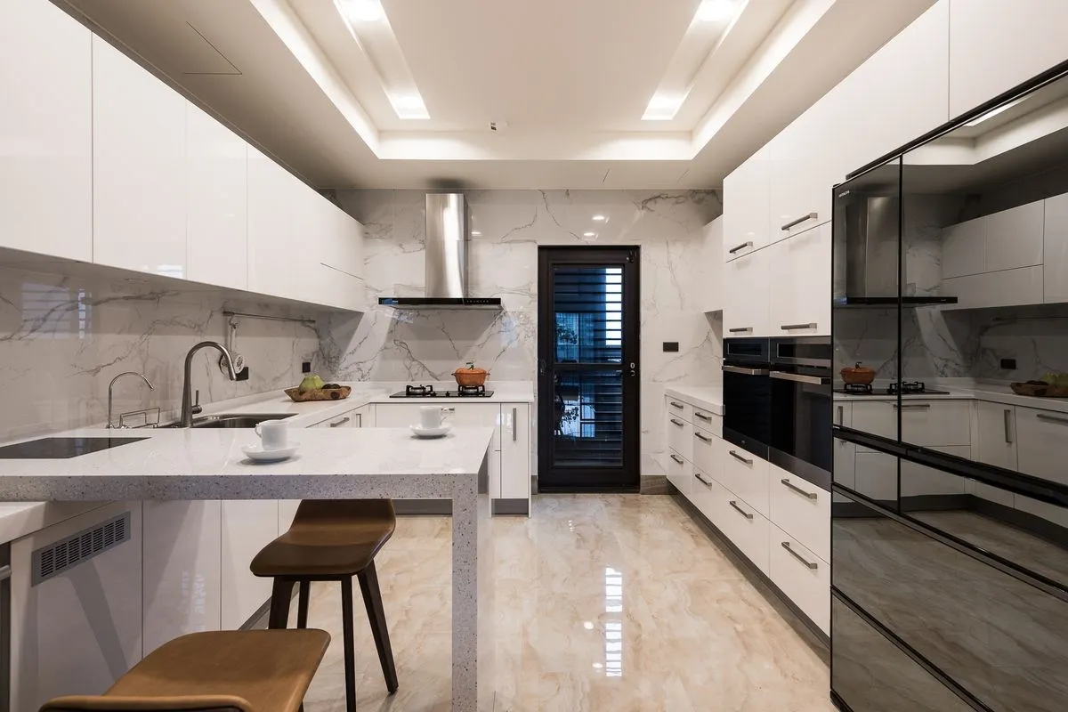 一扇玻璃拉門將廚房及用餐區分割開來,以純白為基底,利用各式不同花紋的大理石堆砌出空間,磁磚具方便清理的材質特性,選為廚房的材料則是美觀與實用性並存的考量。