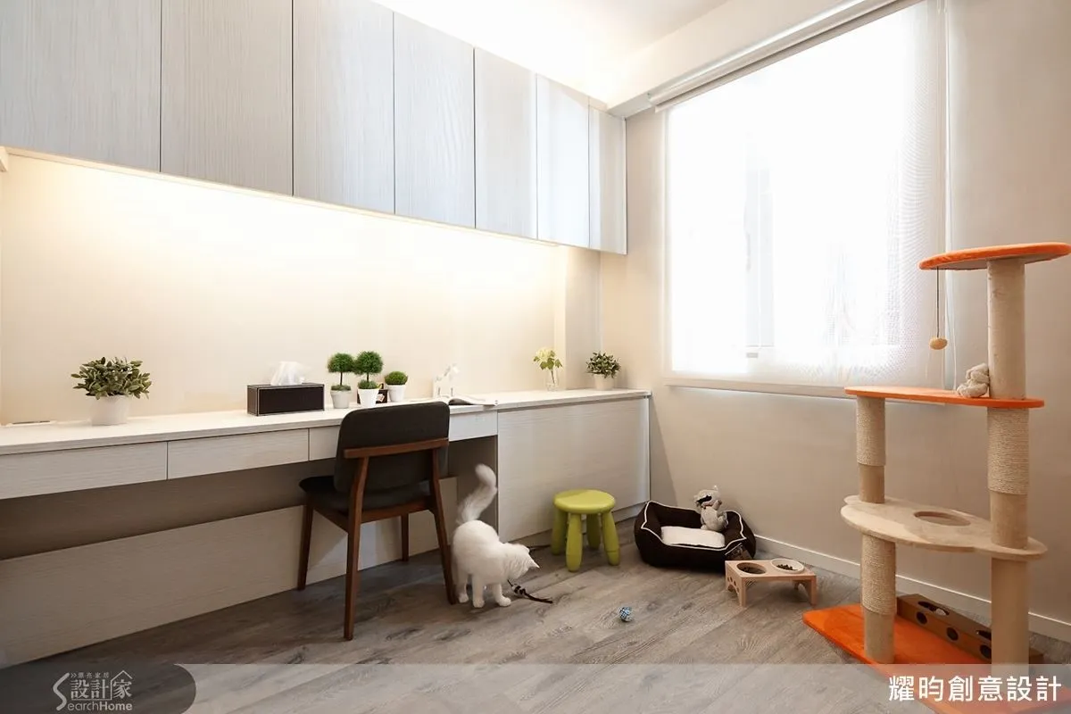 除了主臥以外的第二個房間,是首購族最能利用的空間。設計師考量家會隨著使用時間與人口增加的成長需求,以複合式機能讓它成為百變空間。貼著牆面設置書櫃與書桌,增加收納,卻保留最大的空間,擺上一張沙發床,就是舒適客房;暫時的留白,放上跳檯,就成了貓咪的遊戲室。說變就變,都是屋主說了算。