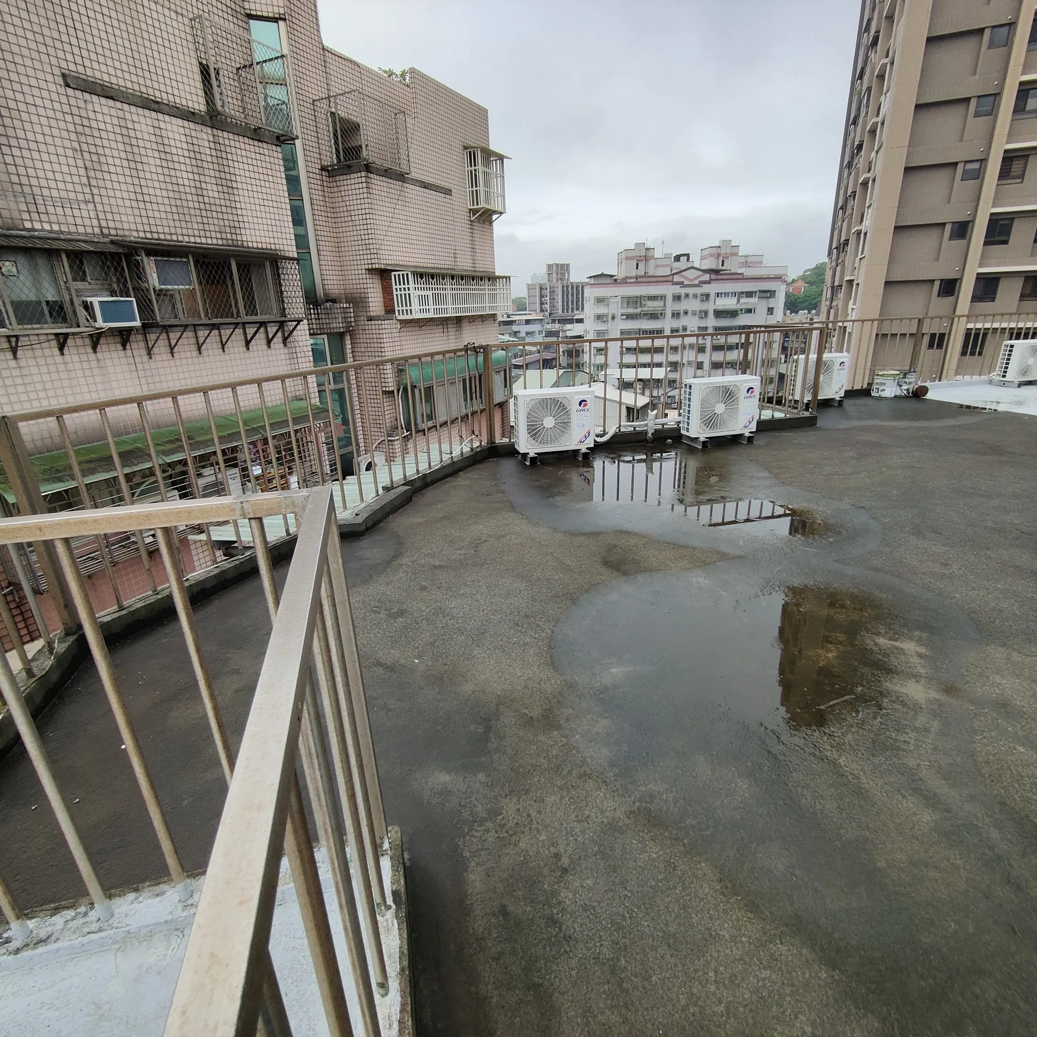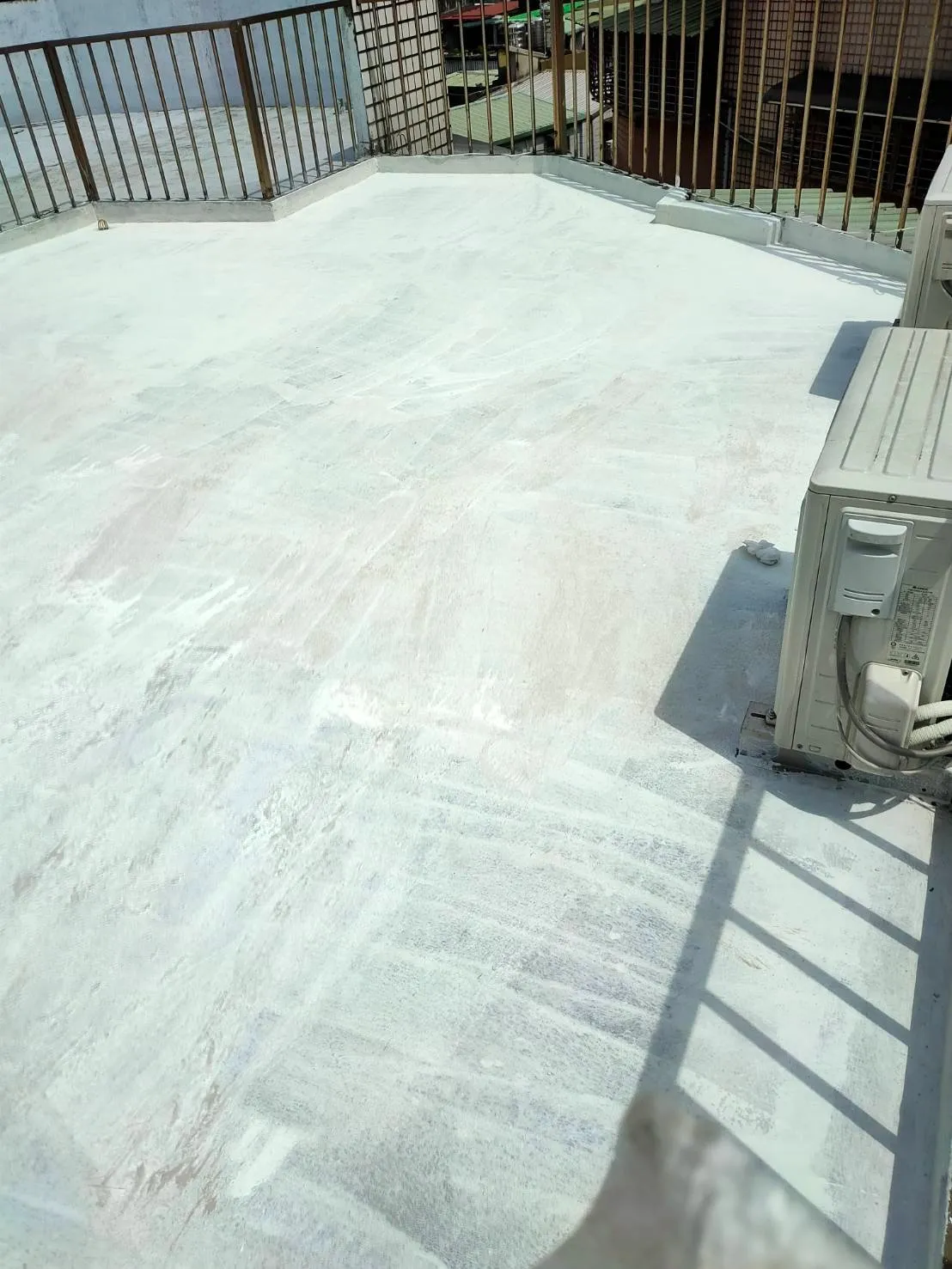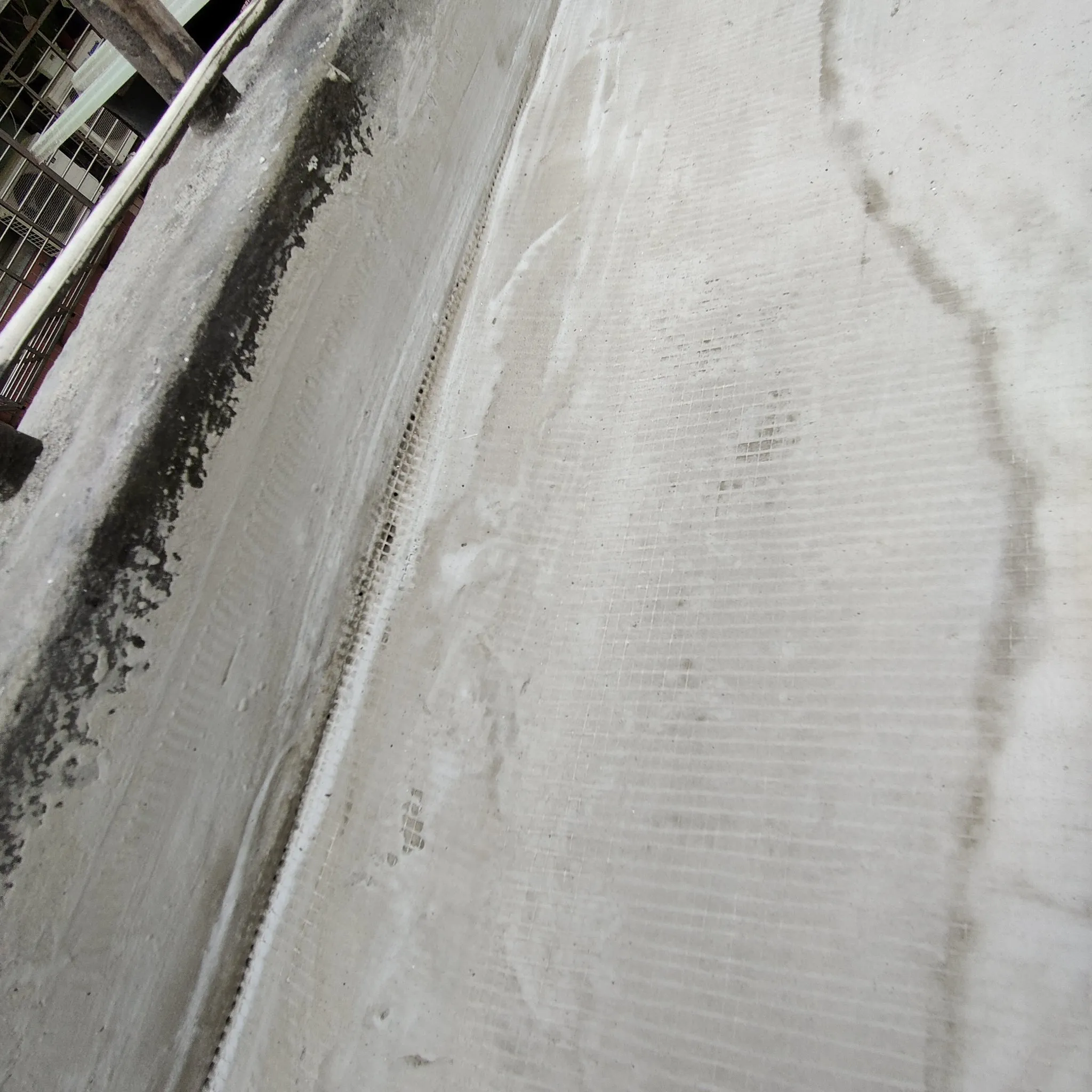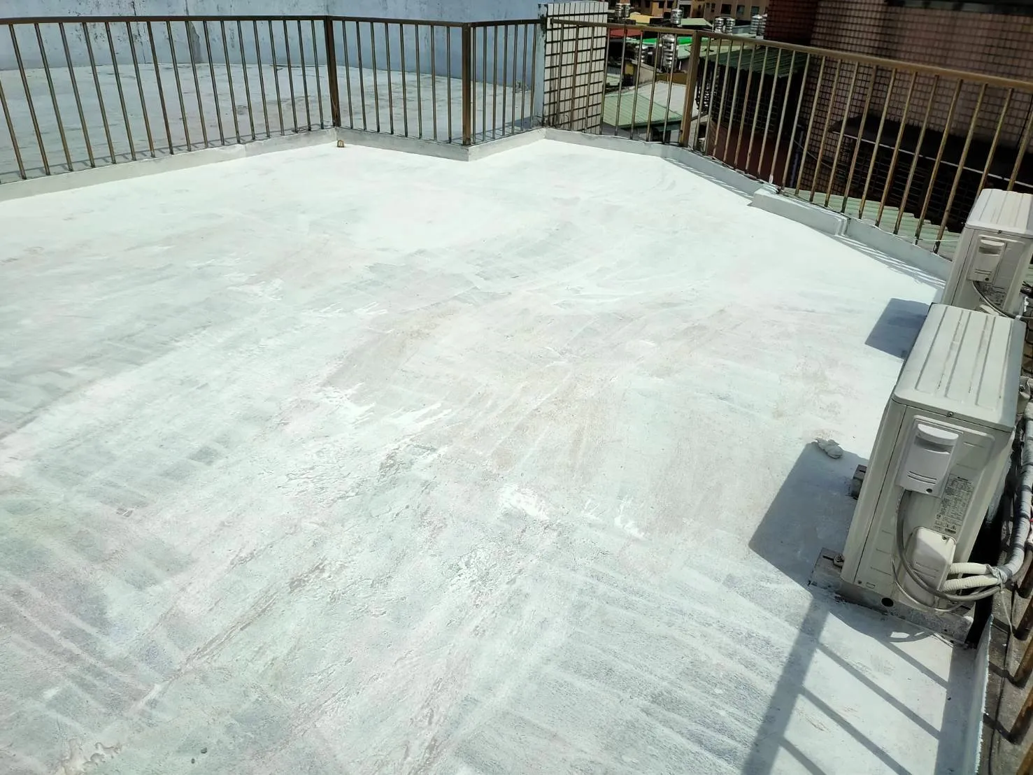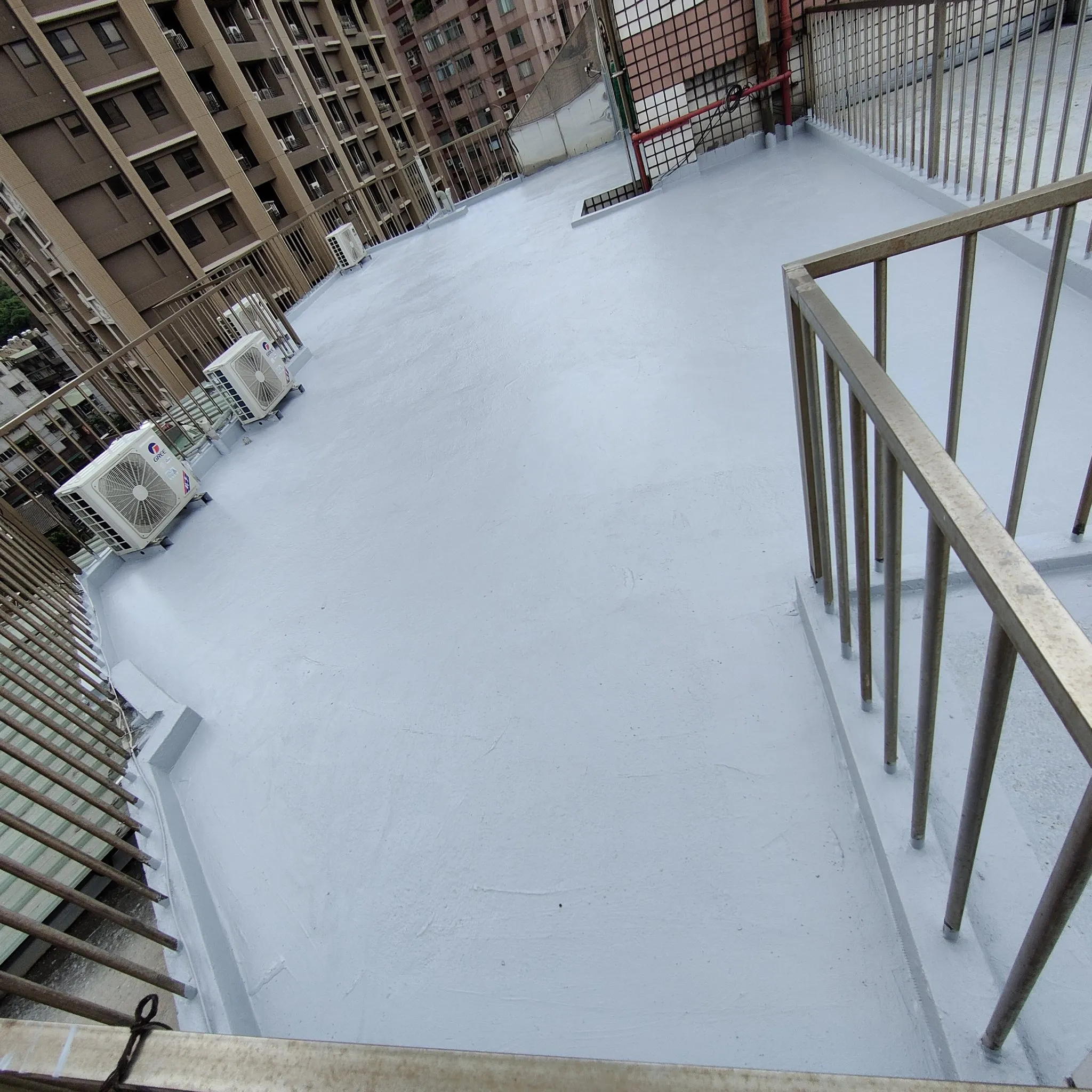 頂樓施工前本公司進場前多次申請外牆施工路權,卻因處為市場出入口及消防通道為由屢次被退件,在無法取得路權的情況下,我們只能從內部用懸空施工架進行外牆高空作業;地面防水工程材料皆為人力接力搬運,完成此任務