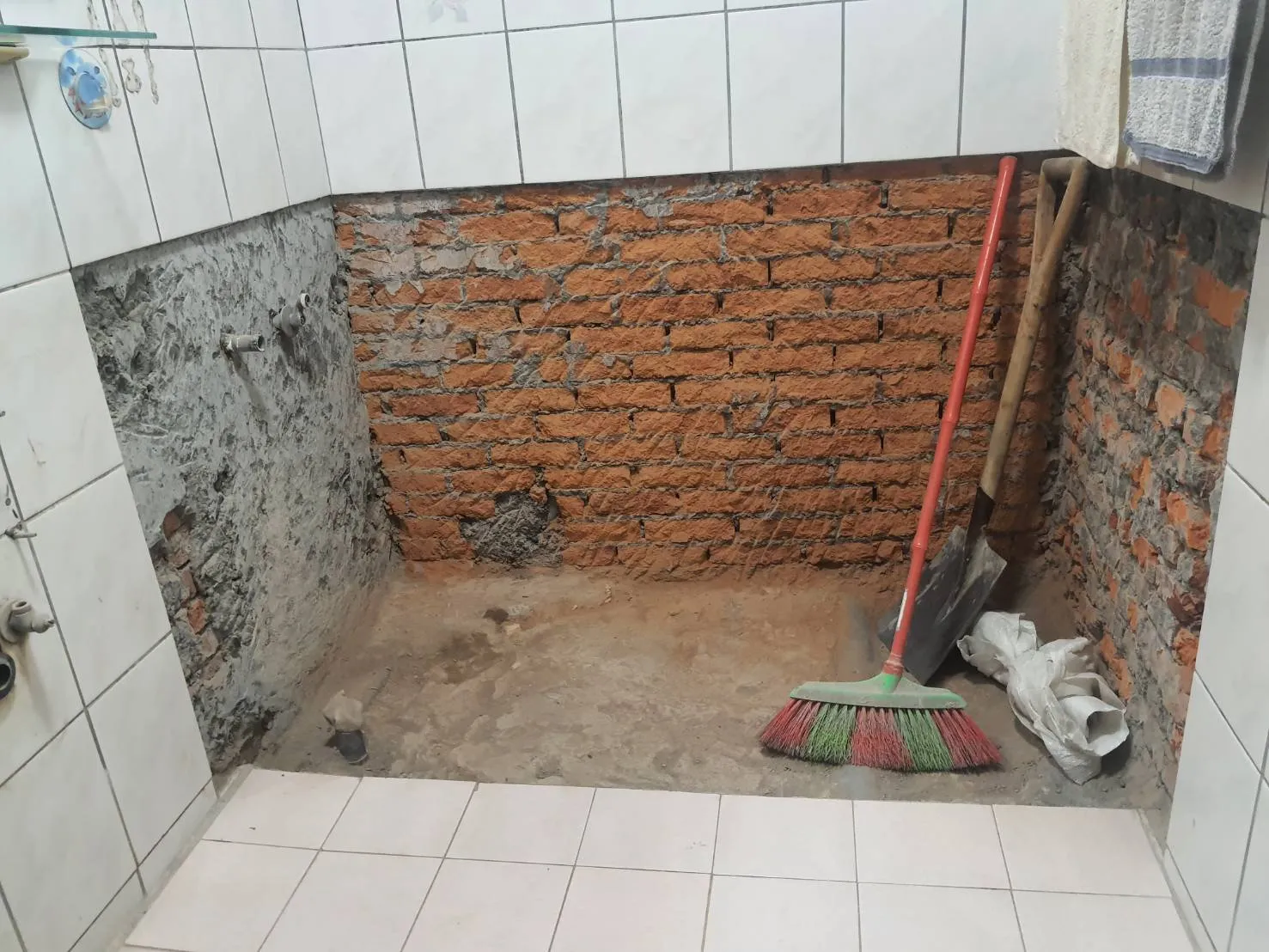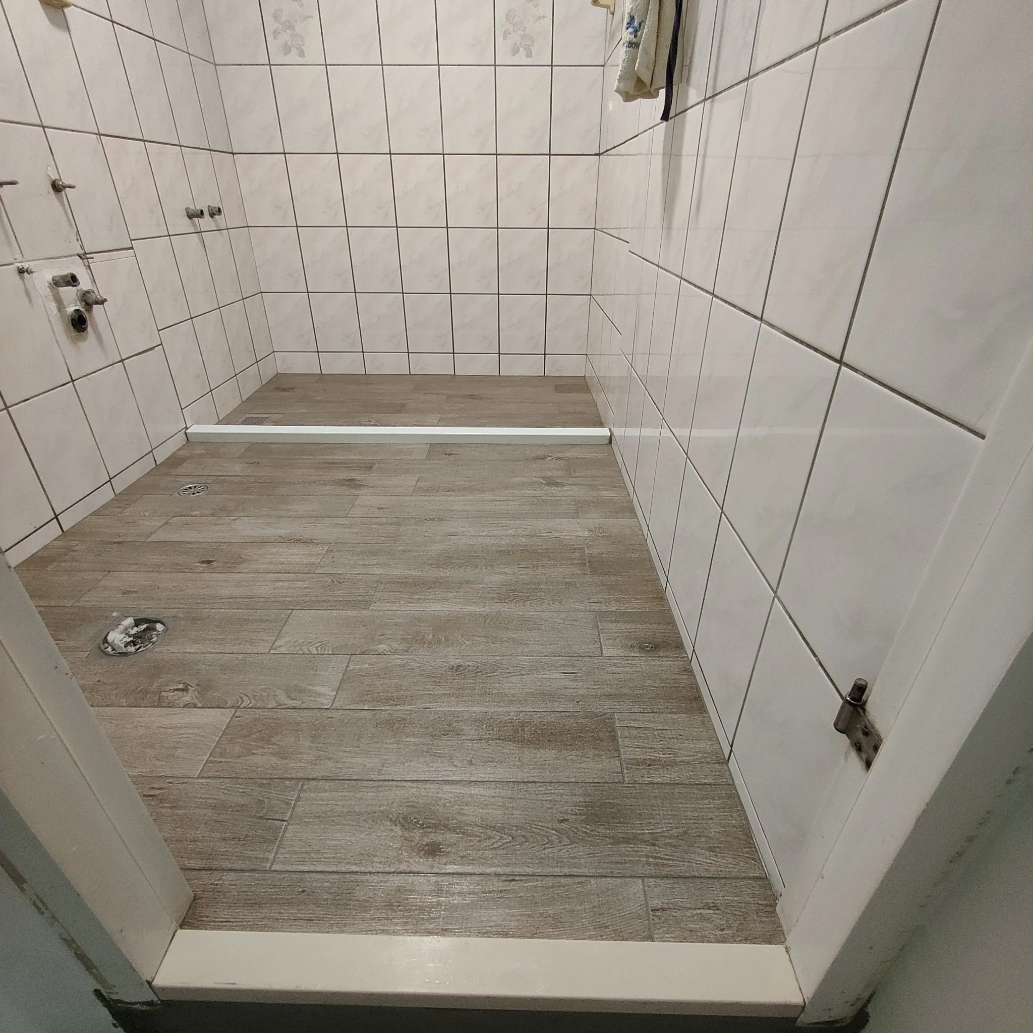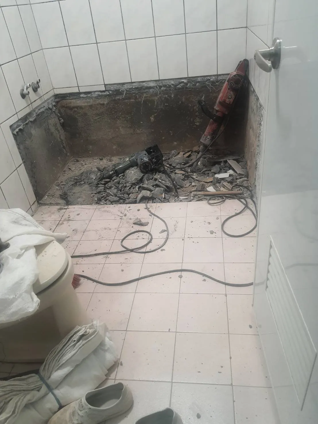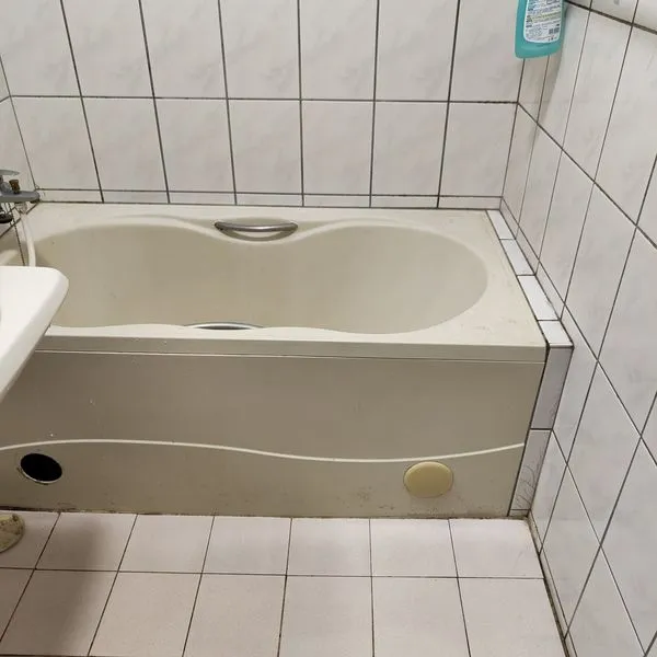 起因業主說明浴缸周邊疑似滲漏製至下方樓層,而造成鄰居生活上不便,經場勘及查修試水後,發現不只浴缸下方滲漏,在早期浴室拓寬範圍中,糞管銜接端有脫管現象,故地面打除後重新配管,才徹底解決漏水問題;雖然工程不大,但舊浴室復原不易,原牆面磁磚20cm*27cm尺寸已經絕版了,本工程以20cm*25cm修復浴缸周邊牆面,磁磚新舊交界處由乾濕分離門片隔開,就沒有對縫的問題了。