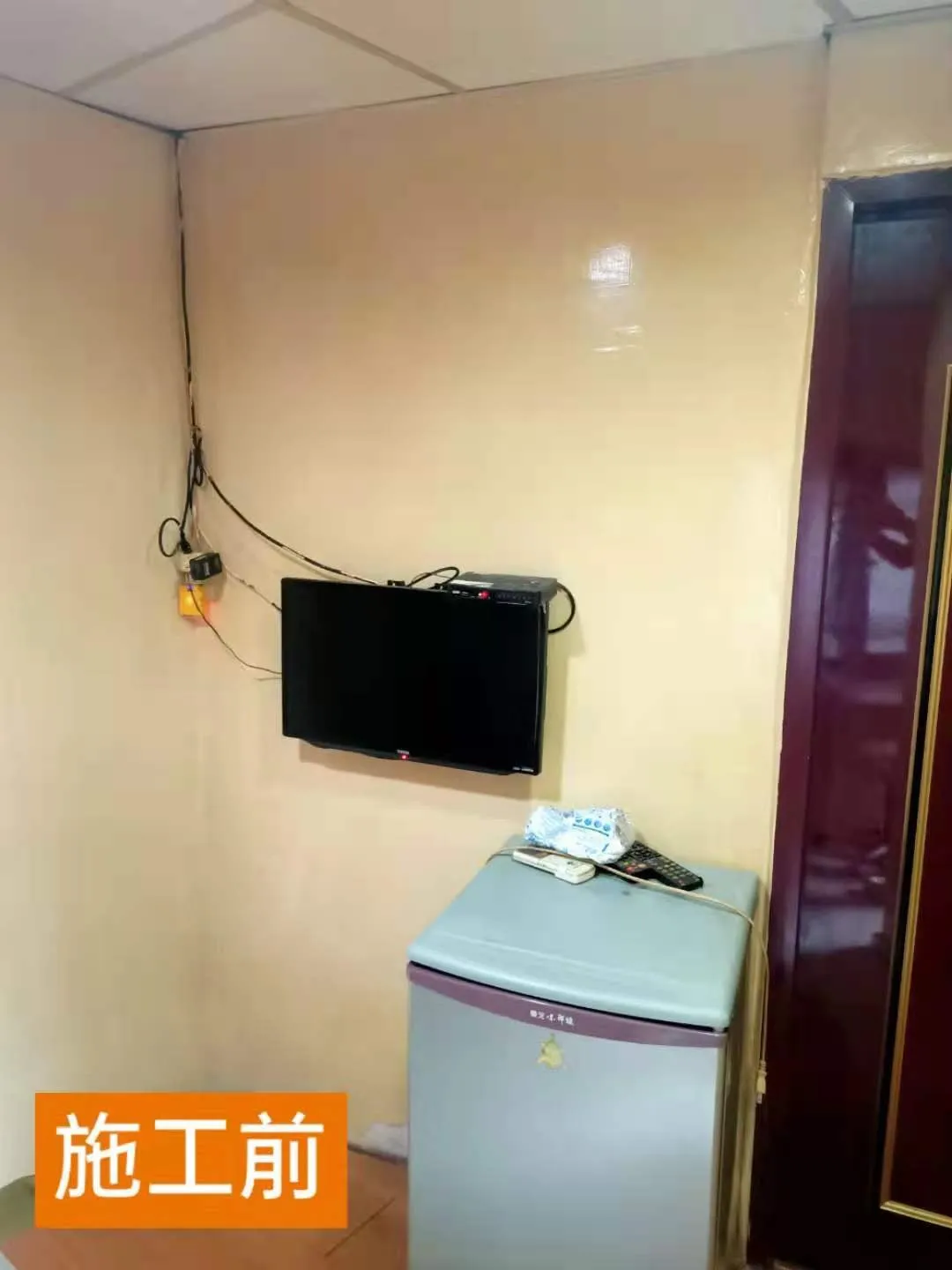 此案開放式的客廳及廚房櫃體面層貼皮已經開始剝落,新櫃體增加尚缺的插座及電視網路出口,原有地坪為舊式30cm*30cm地板局部已破損,進行鋪設免拆式超耐磨防水地板直鋪,落地門則以免拆式工法換新隔音窗,經