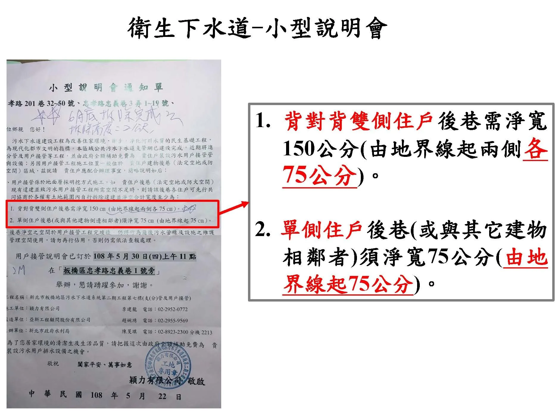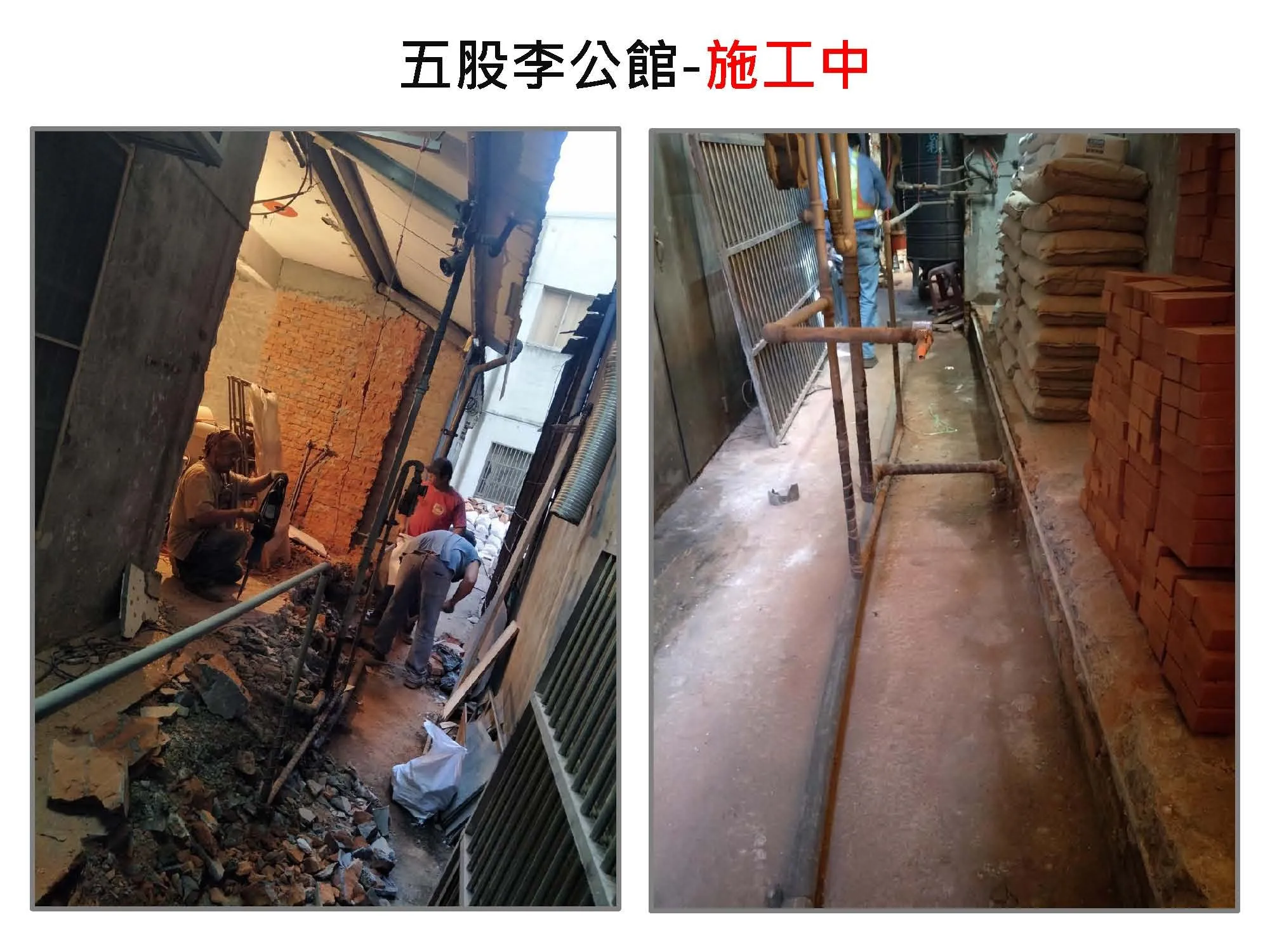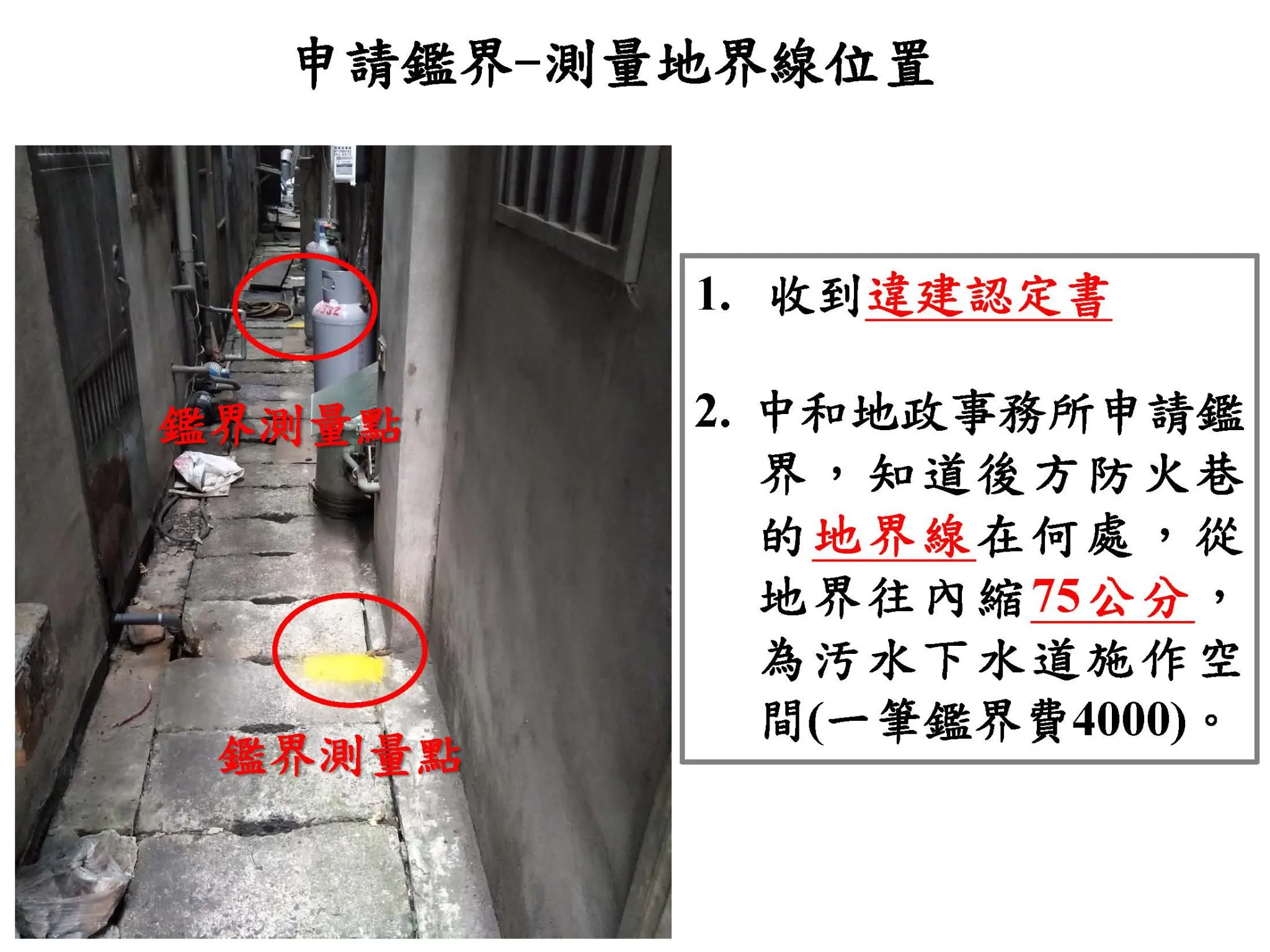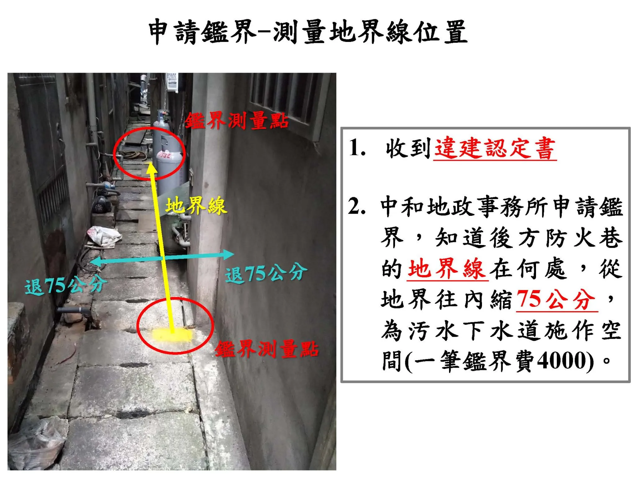 為配合政府污水接管施工,如鑑界範圍必須退縮室內部分空間,配管時建管處會先行排除違建區域進行拆除,多半住戶不想損壞室內原有設施,即先行退縮後並預留排水管及糞管(回流管)至後巷未來下水道配管區域,惟部分早期已有增建部分拆除,需做好完善的支撐再行拆除,才不會延伸後續牆面開裂、漏水等問題。