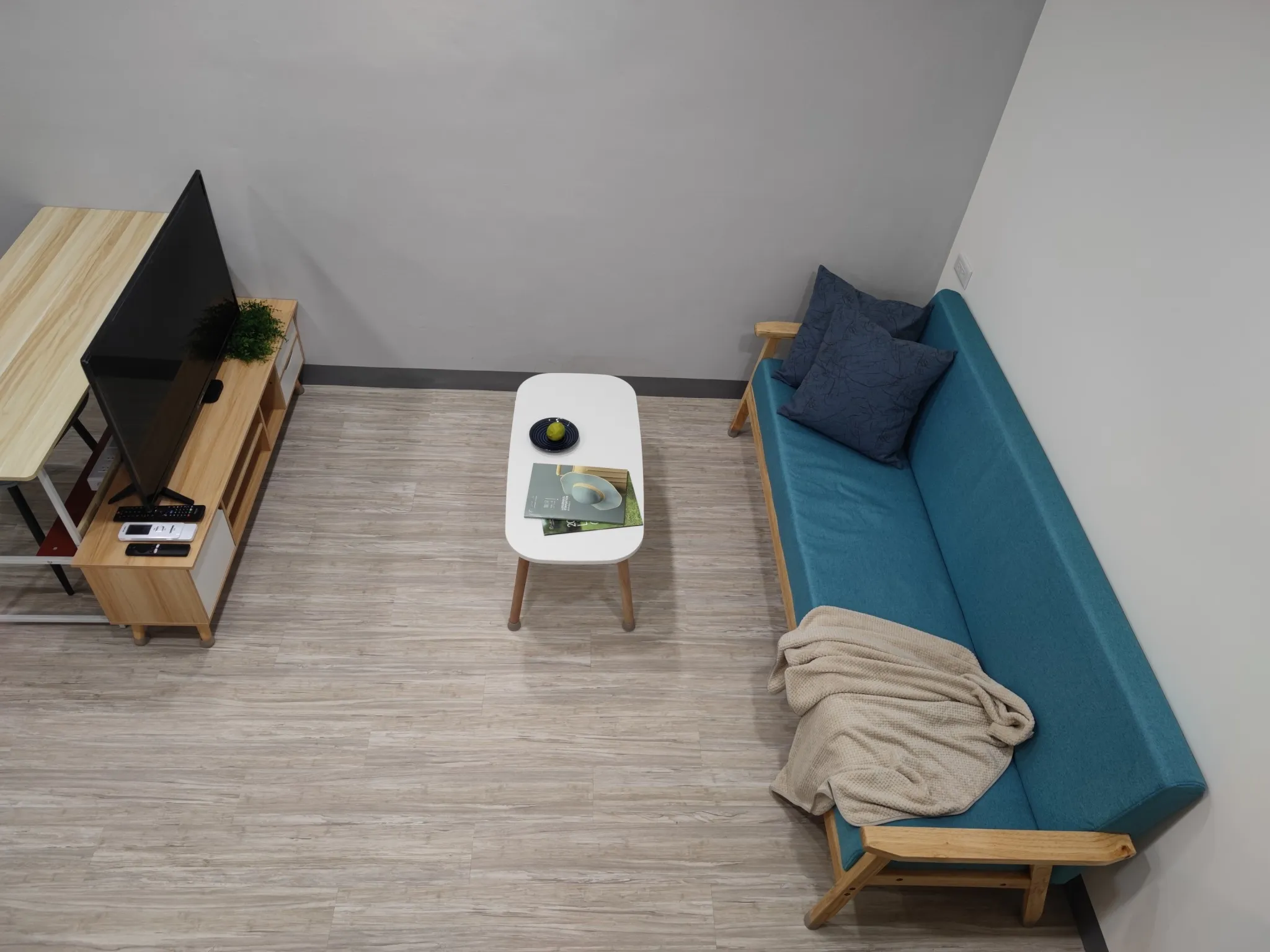 此案開放式的客廳及廚房櫃體面層貼皮已經開始剝落,新櫃體增加尚缺的插座及電視網路出口,原有地坪為舊式30cm*30cm地板局部已破損,進行鋪設免拆式超耐磨防水地板直鋪,落地門則以免拆式工法換新隔音窗,經