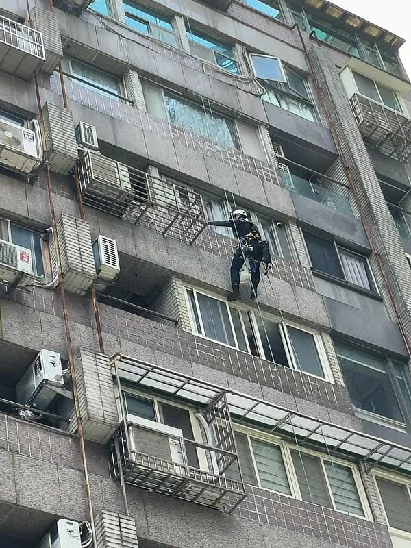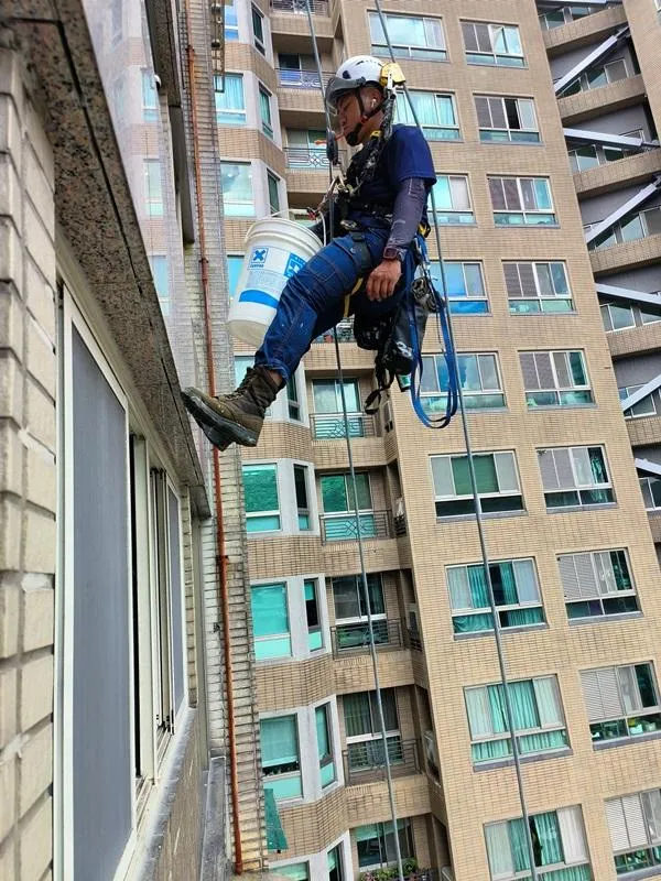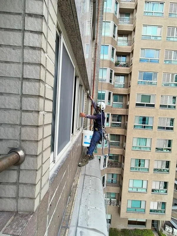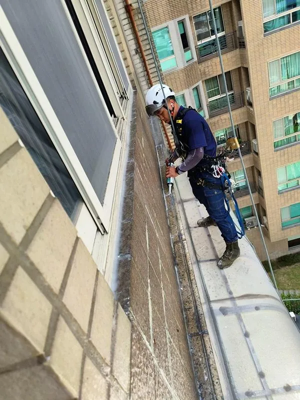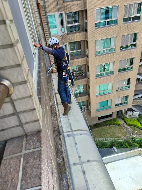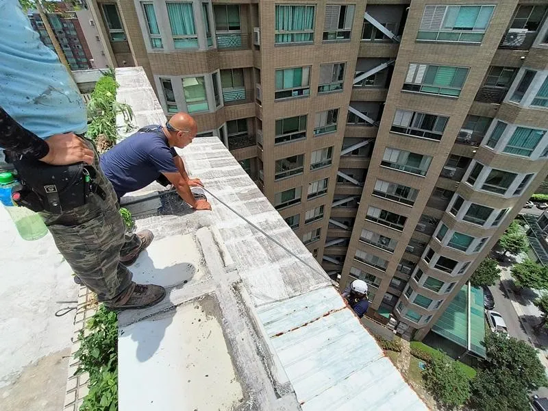 頂樓施工前本公司進場前多次申請外牆施工路權,卻因處為市場出入口及消防通道為由屢次被退件,在無法取得路權的情況下,我們只能從內部用懸空施工架進行外牆高空作業;地面防水工程材料皆為人力接力搬運,完成此任務
