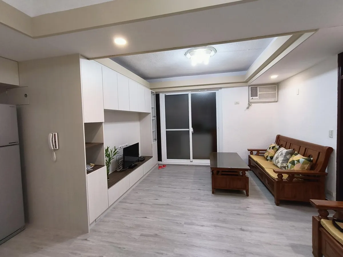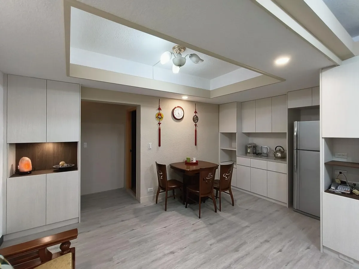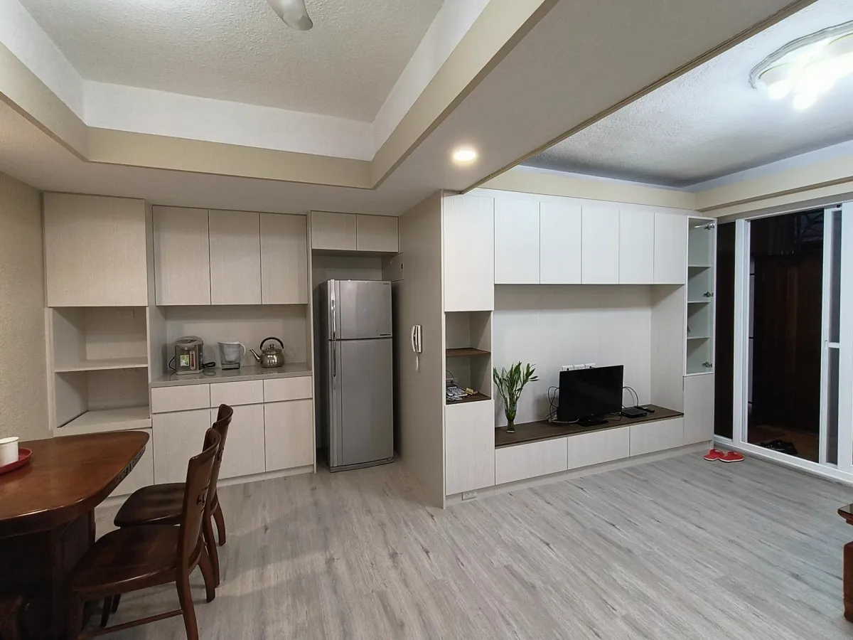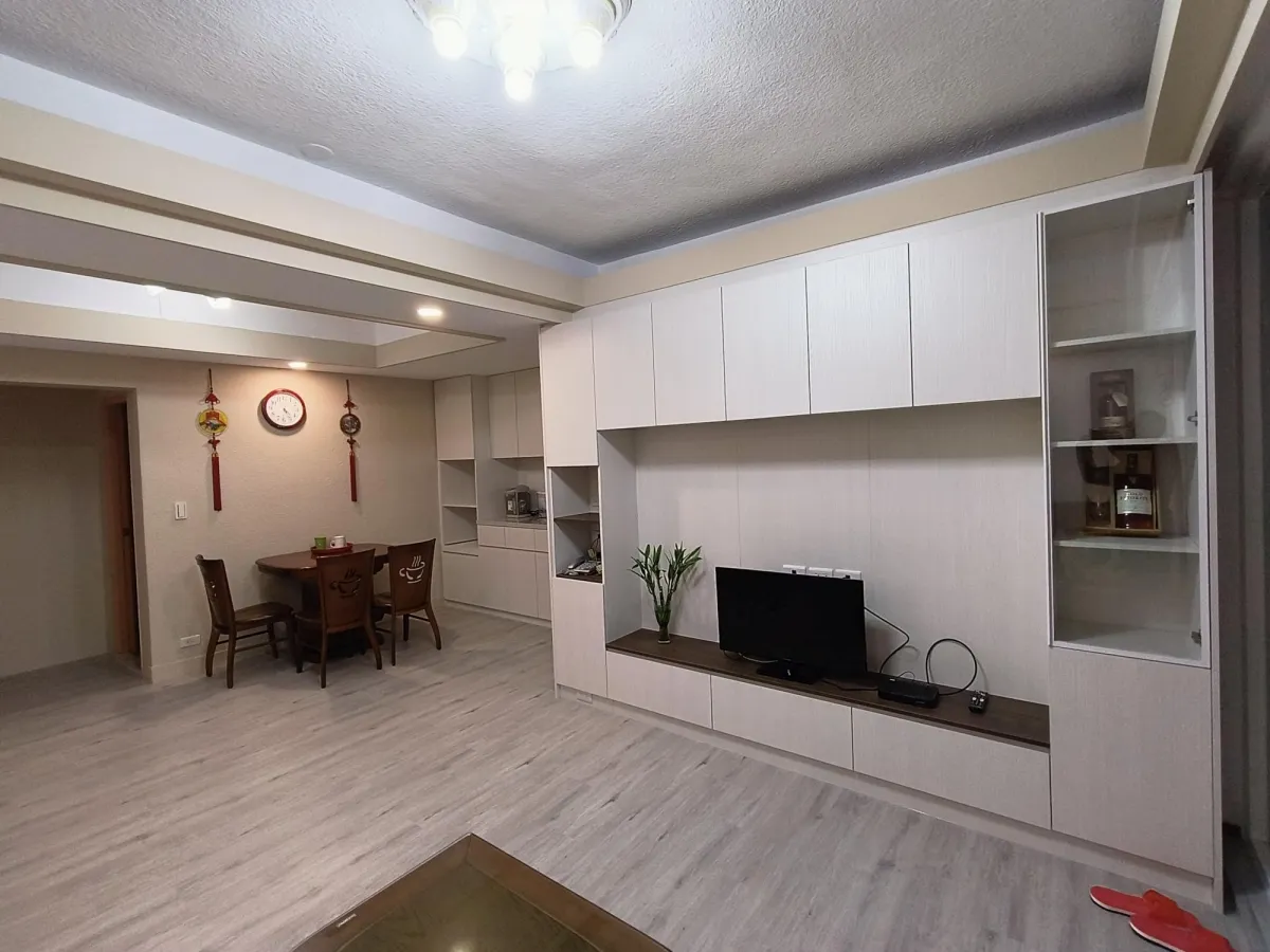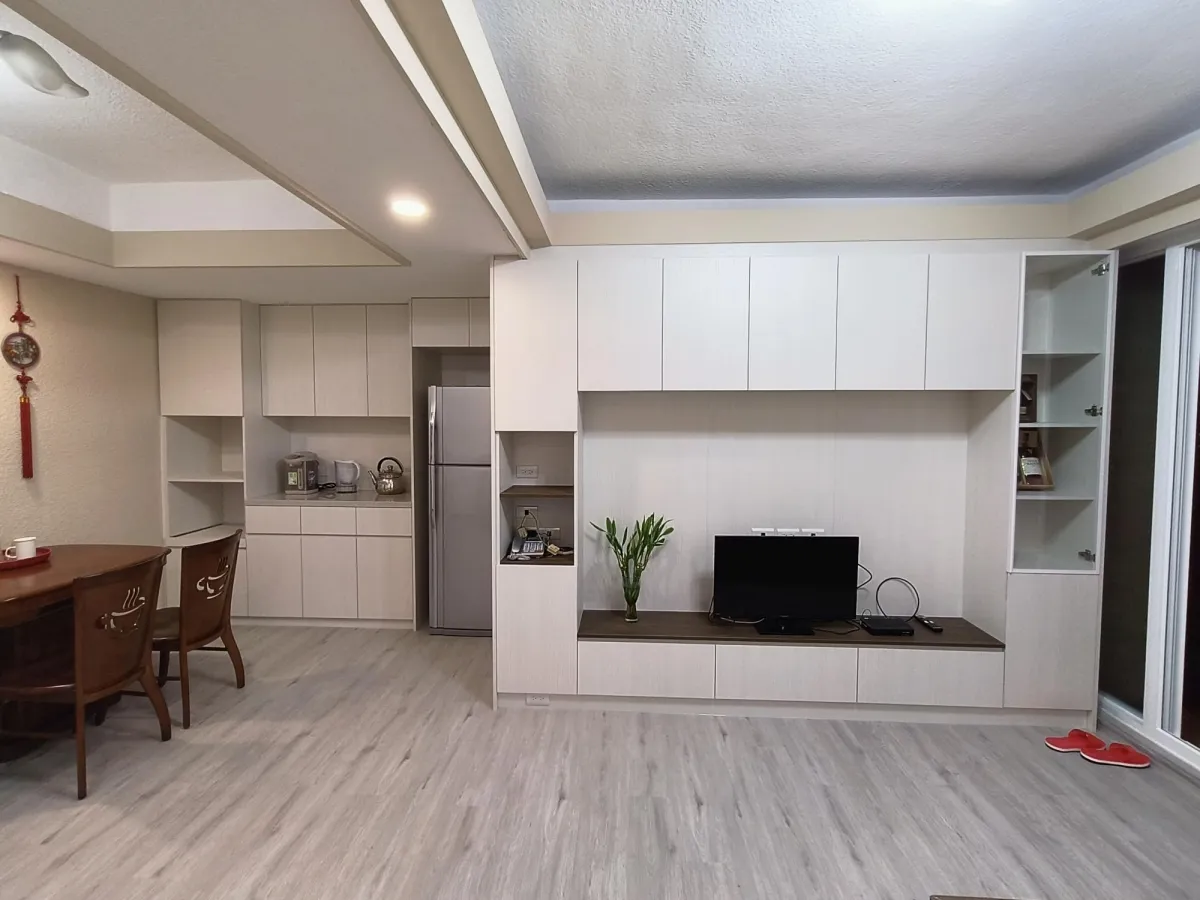此案開放式的客廳及廚房櫃體面層貼皮已經開始剝落,新櫃體增加尚缺的插座及電視網路出口,原有地坪為舊式30cm*30cm地板局部已破損,進行鋪設免拆式超耐磨防水地板直鋪,落地門則以免拆式工法換新隔音窗,經處理後煥然一新。
