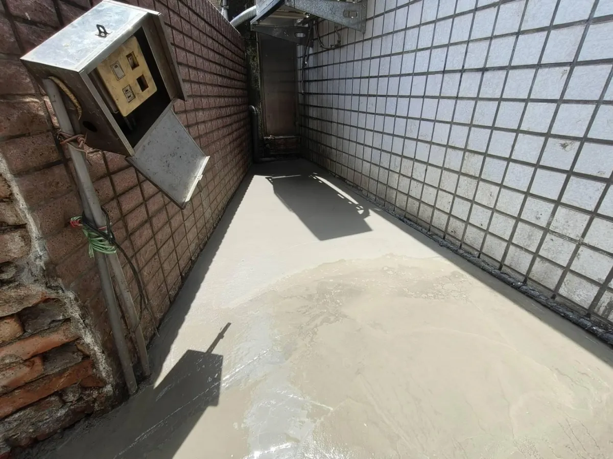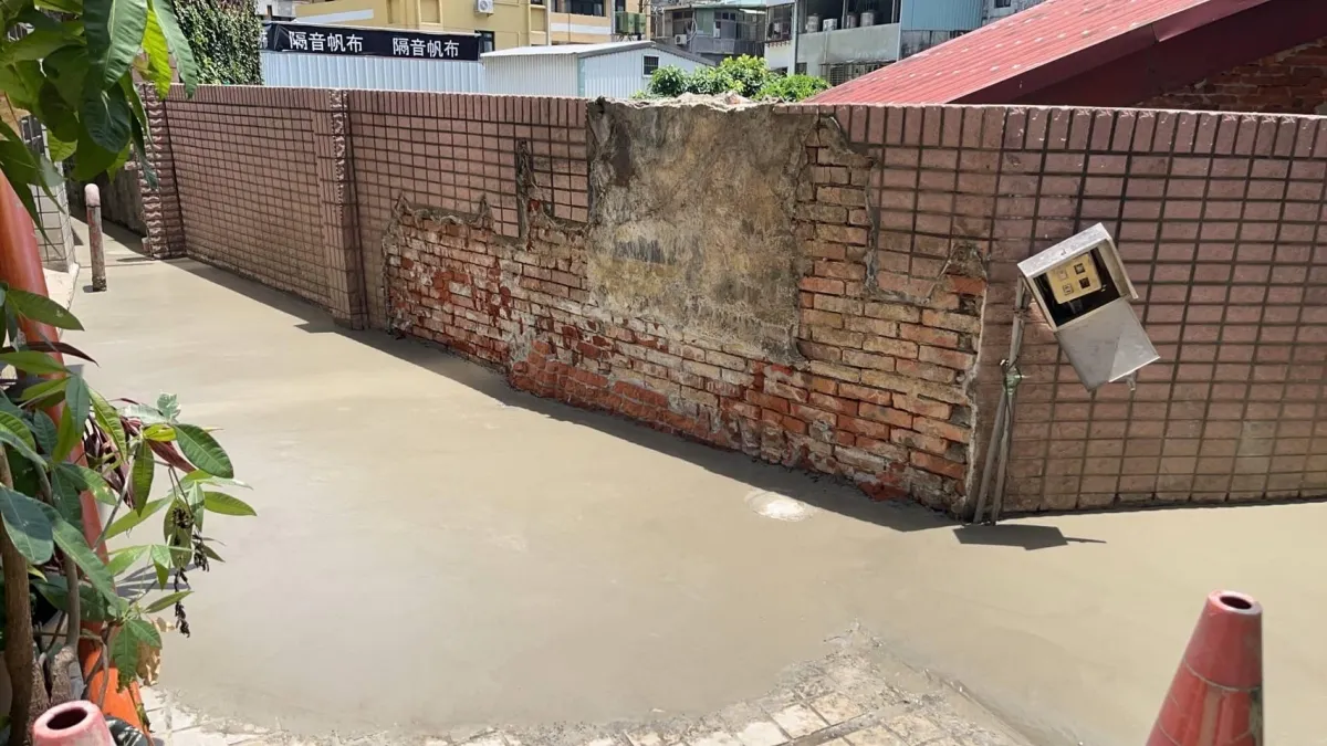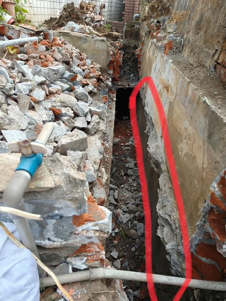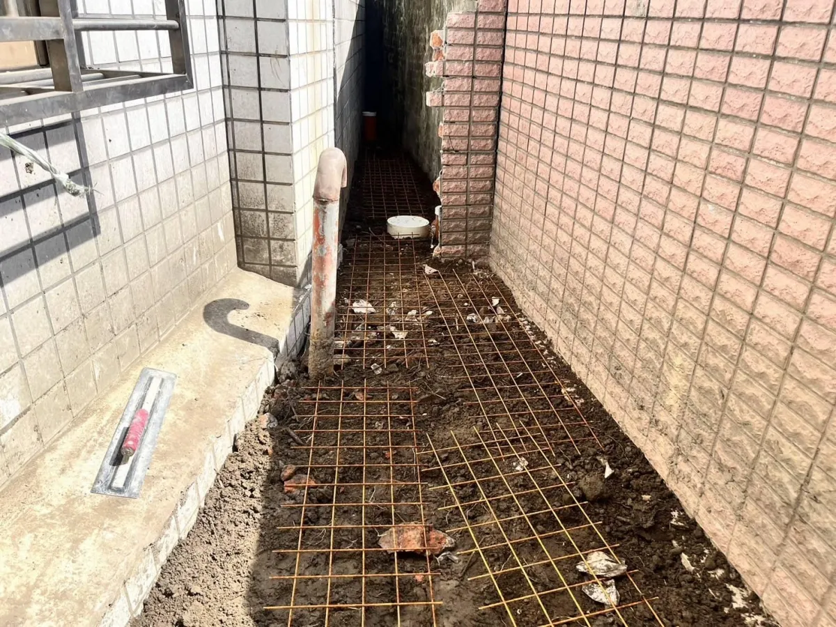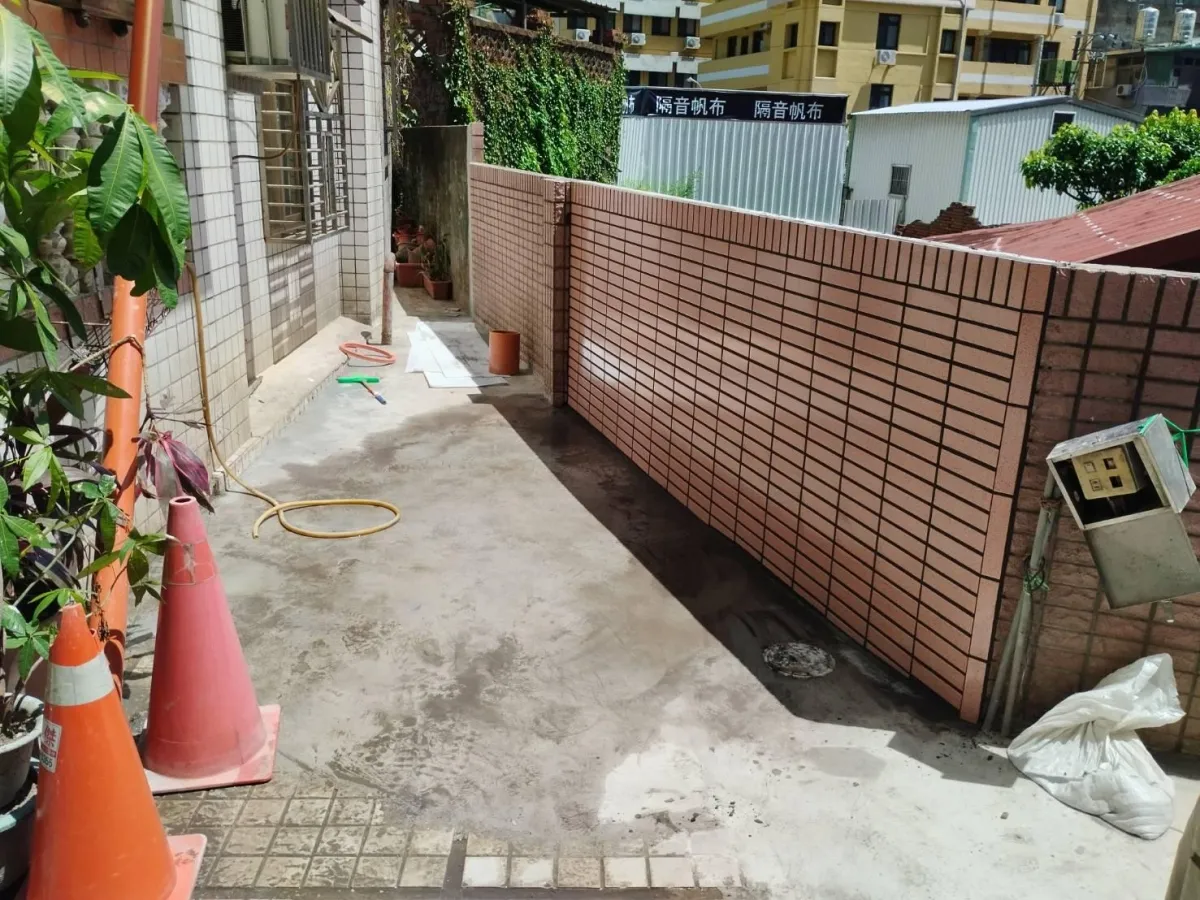 本案工程為狹窄側巷的舊式U型水溝老化,溝底延側牆滲漏至住戶地下室牆面,發生漏水情況已為時八年之久,曾以結構裂縫灌注工法進行止水,仍不見其效。近年來漏水情況加劇嚴重,如經大雨來臨時,地下室就須以面盆接水