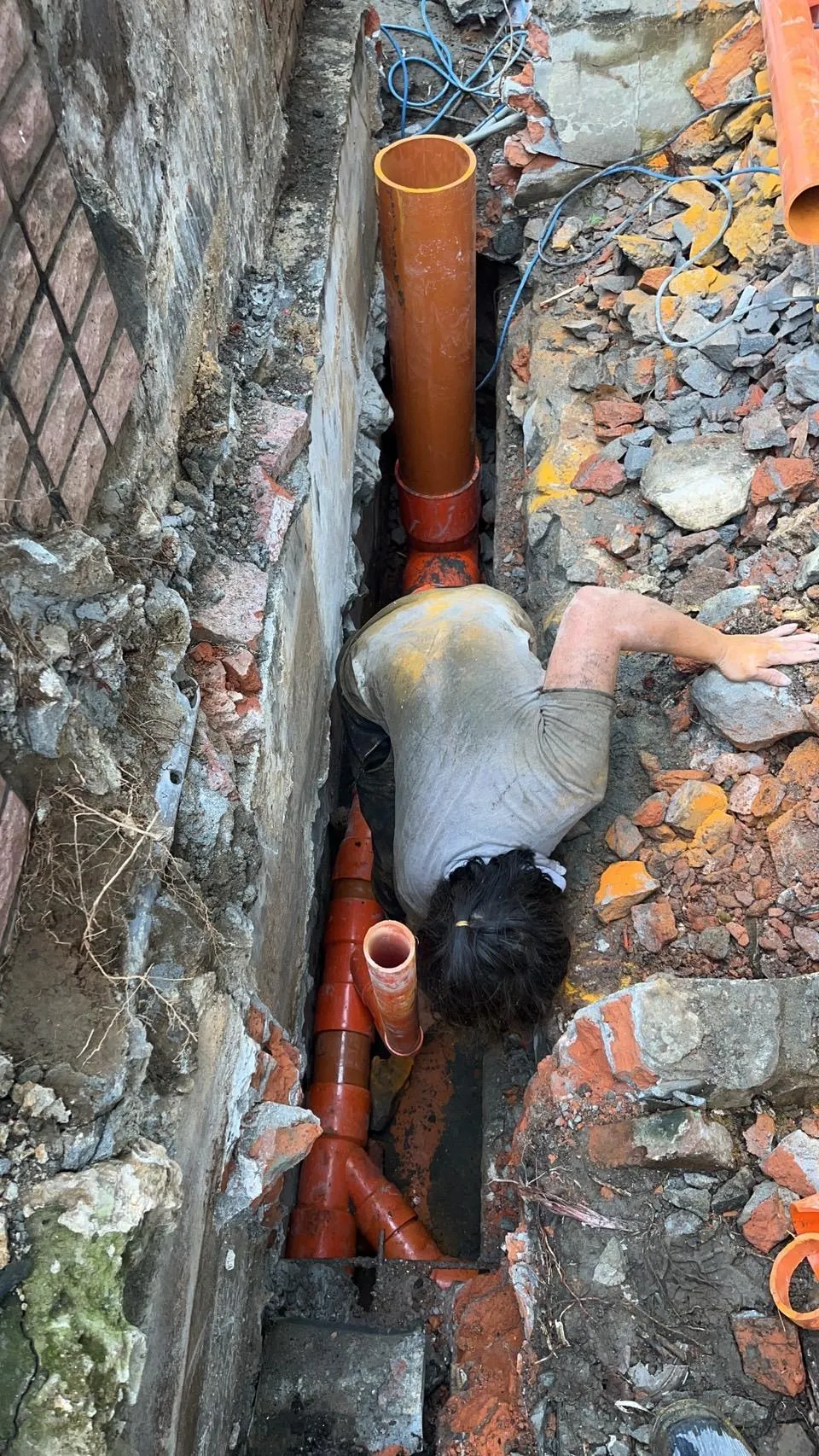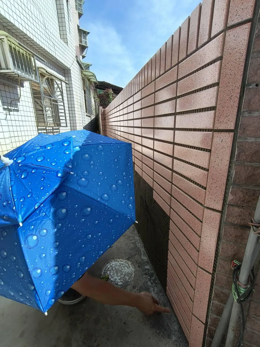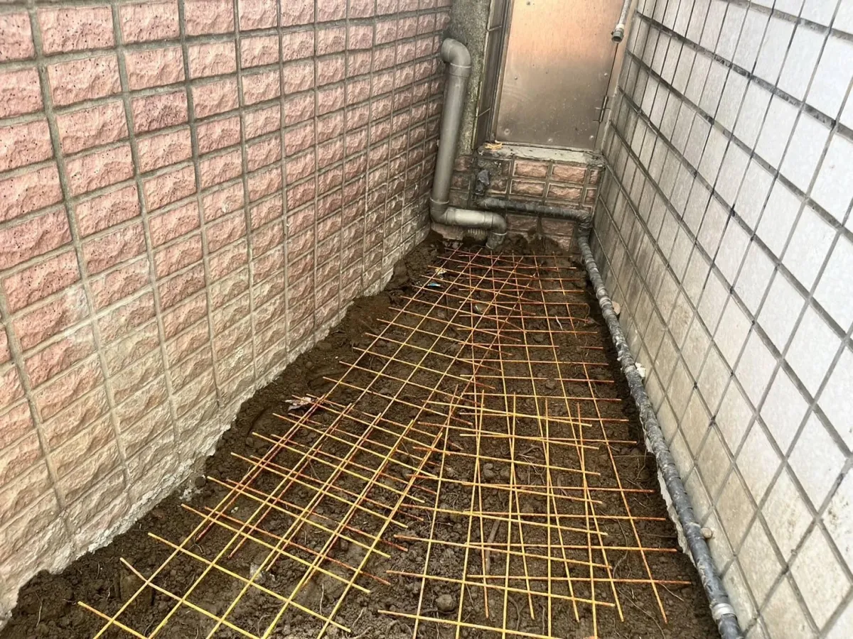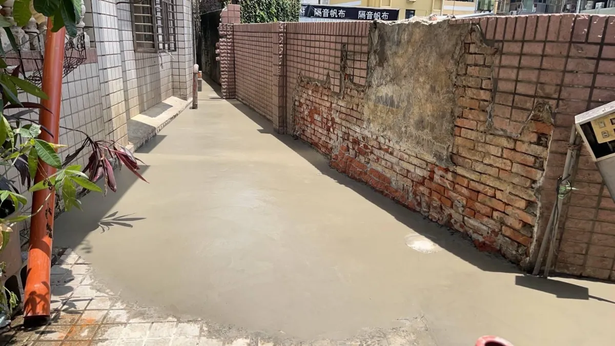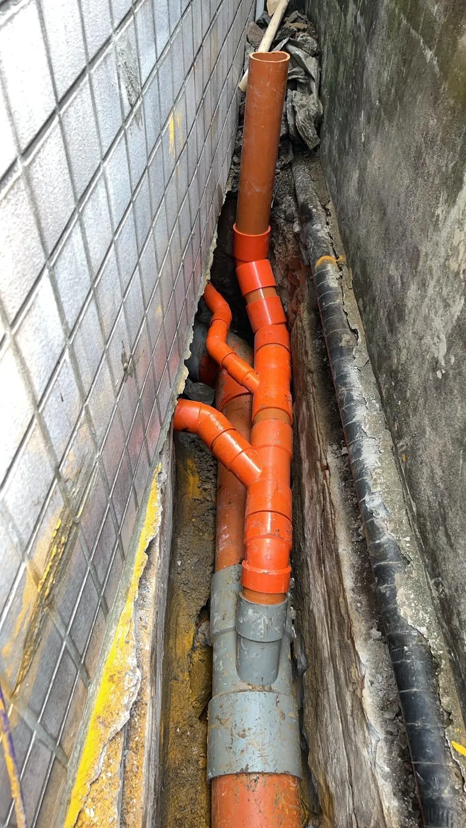 本案工程為狹窄側巷的舊式U型水溝老化,溝底延側牆滲漏至住戶地下室牆面,發生漏水情況已為時八年之久,曾以結構裂縫灌注工法進行止水,仍不見其效。近年來漏水情況加劇嚴重,如經大雨來臨時,地下室就須以面盆接水