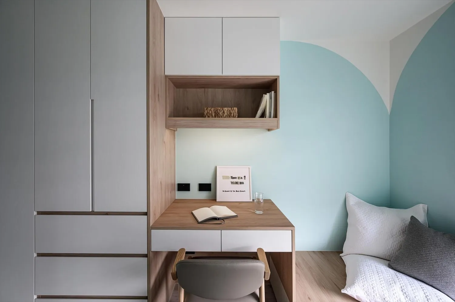 由於室內空間較小,使用系統櫃將衣櫃、書桌、床架連在一起,並透過同色系的搭配方式,營造出空間的一致性,為了不讓牆面過於單調,使用淺色的油漆加上圓弧的設計,營造出清新活潑感。