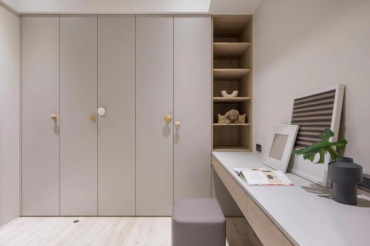 運用系統櫃充分使用空間,在牆面做出整片的收納櫃,並以系統櫃做出懸空的書桌,讓小朋友不論是 6 歲還是 22 歲都可以充分使用這個空間,不需要再做調整。