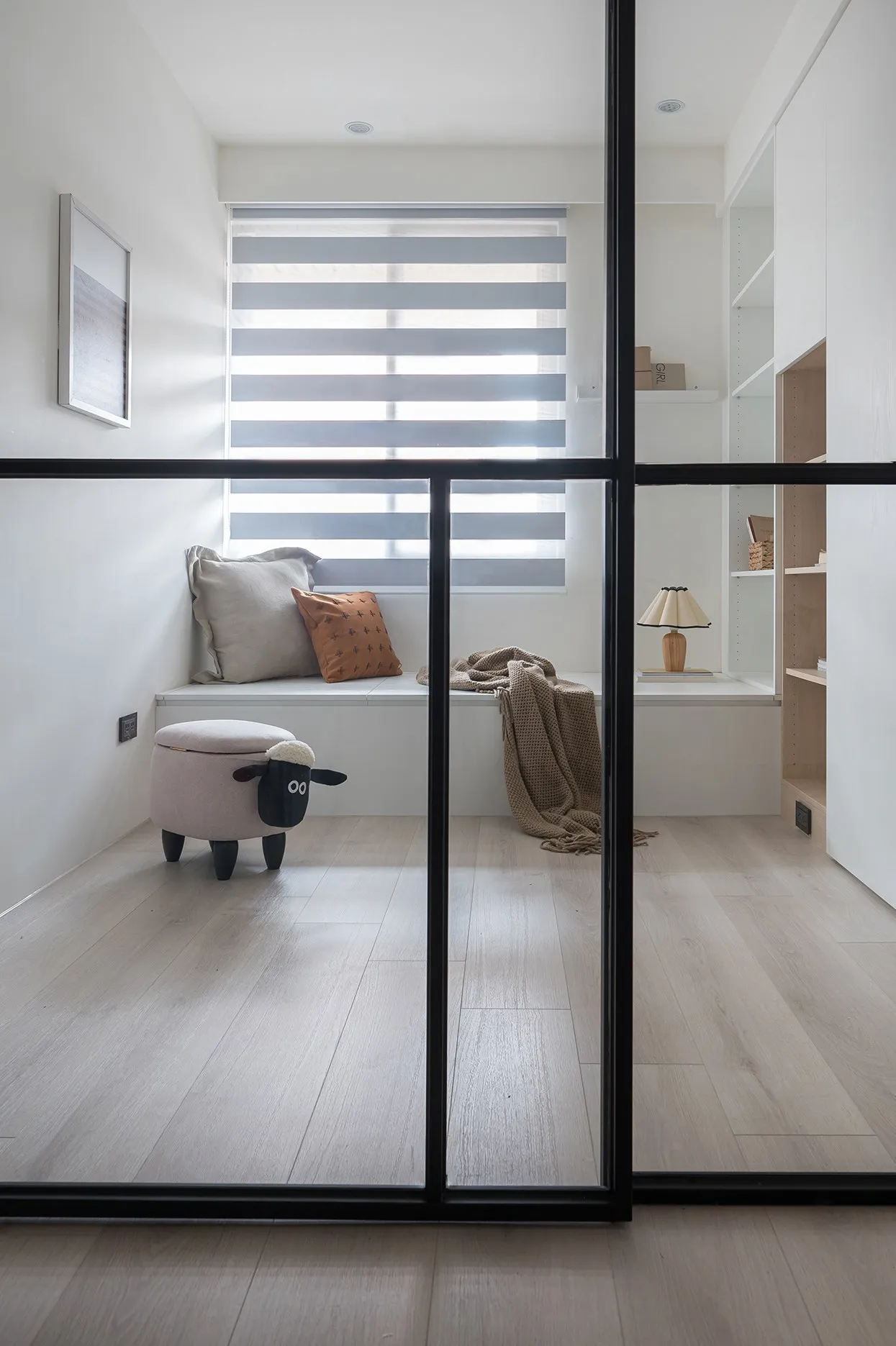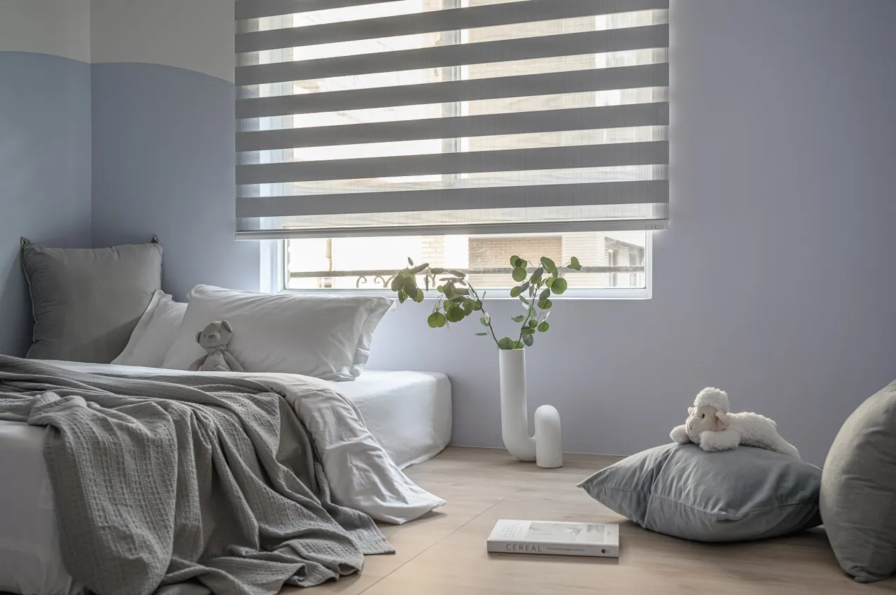 使用天然的布料營造出自然的氛圍,加上大面積的自然採光,營造出北歐的自然氛圍,最後透過窗簾的可愛圖案來增加童趣感,未來小朋友長大時,只要更換窗簾即可。