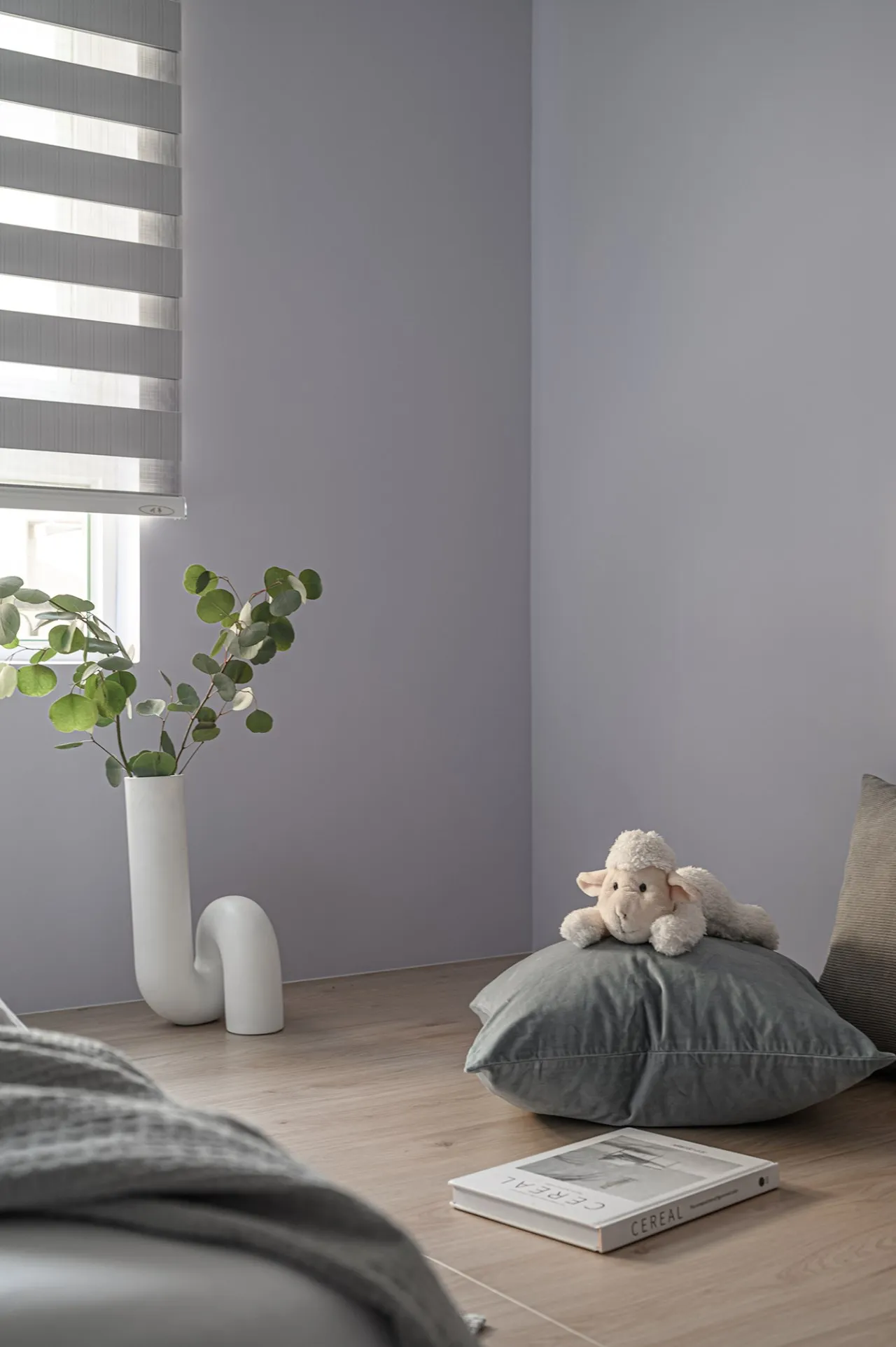 在軟裝設計上,使用具有設計感的白色花盆和綠色植物,再加上可愛布偶,可以大大增加北歐風的視覺感受。