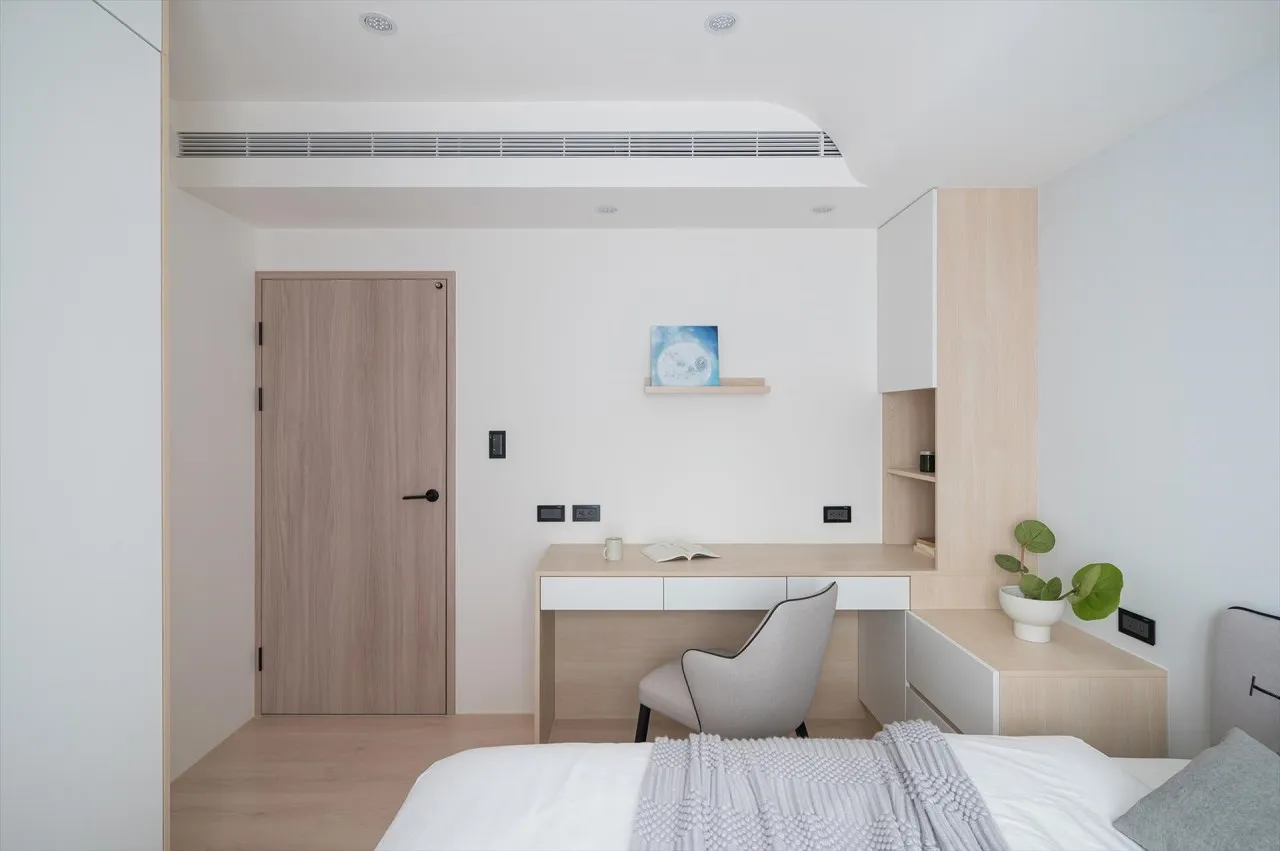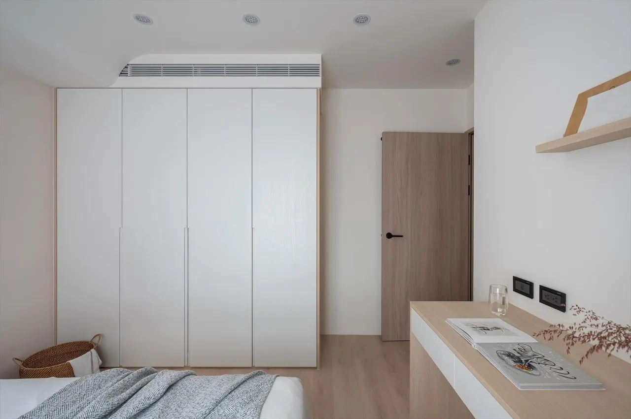 牆面的系統櫃與空調出風口設計成一致的寬度,並且配色也有一致性,可以讓視覺感受較為和諧,天花板則是以圓弧的設計來營造出和諧的線條感。