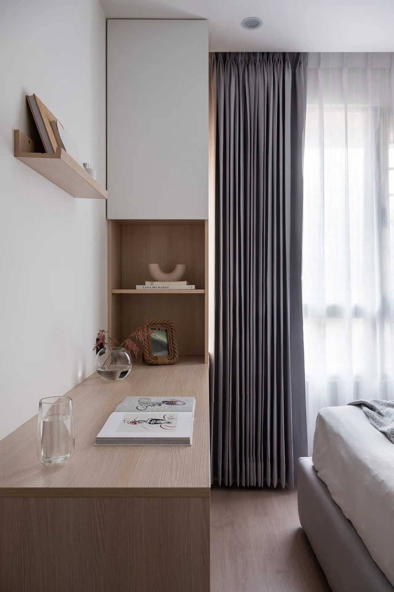 運用系統櫃做出閱讀空間,再加上和諧的配色與採光,營造出舒適的北歐自然氛圍,再搭配現代風的床頭板和座椅做出混搭,營造出不凡的品味。