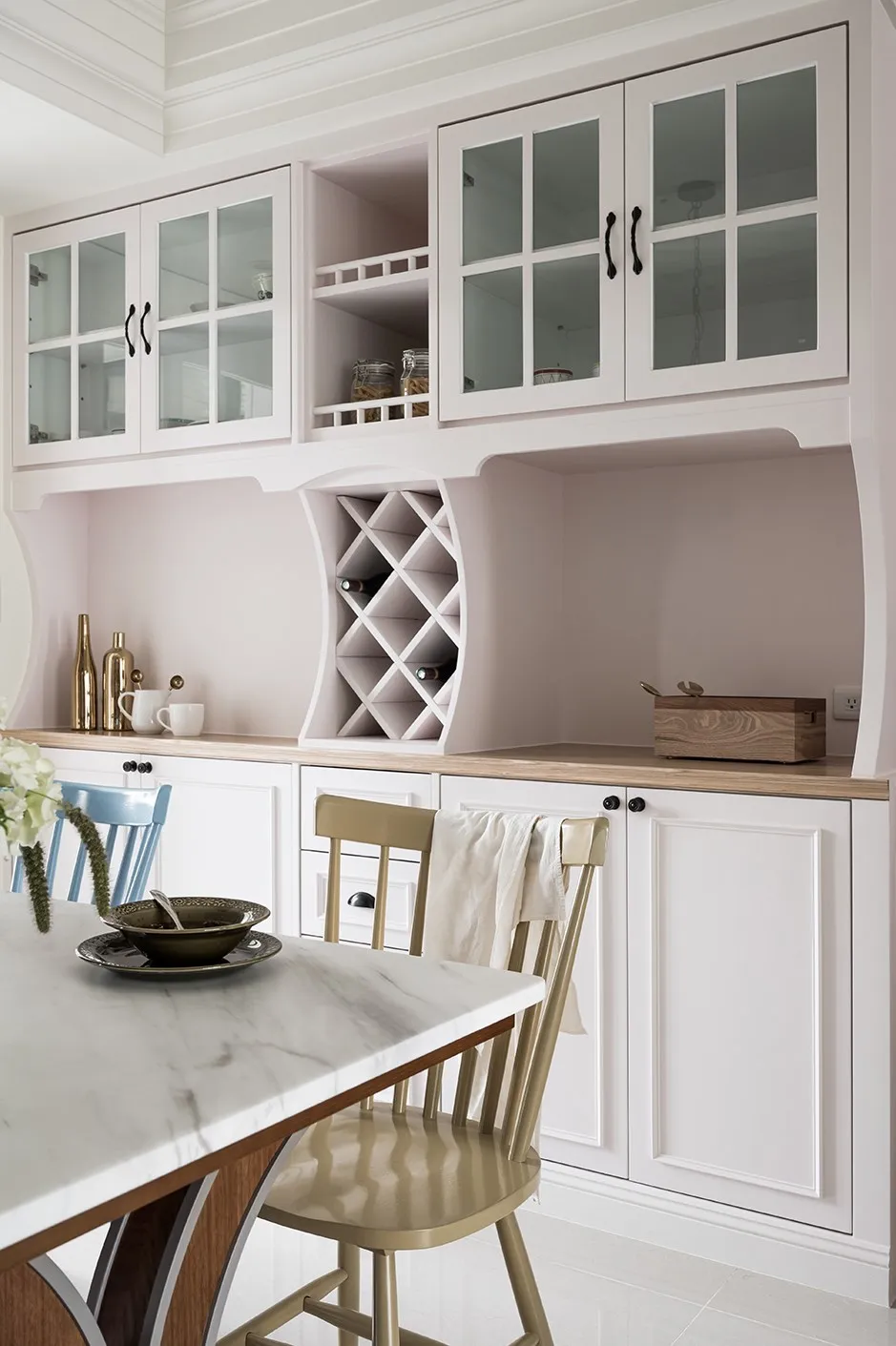 在餐廳的一面牆上設計創意收納牆,這面牆由不同尺寸的櫃子和架子組成,可以擺放裝飾品,也可以用來存放書籍和小型廚具用品,這樣的設計既實用又美觀,讓餐廳看起來更加有層次感和藝術性。