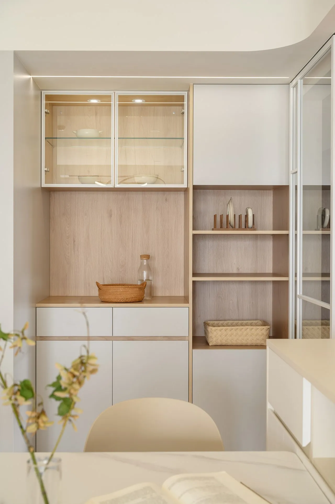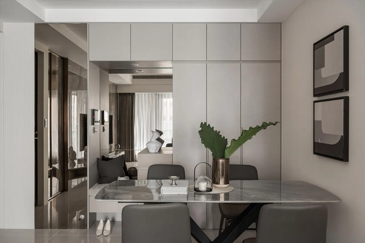 在小宅餐廳的一面牆上設計了一個內嵌式收納櫃,這個櫃子分為上下兩層,上層用來擺放精美的餐具和裝飾品,下層則作為餐具和廚具的儲物空間,櫃子的門板採用了隱形把手設計,外觀簡約大方,與整體空間完美融合。