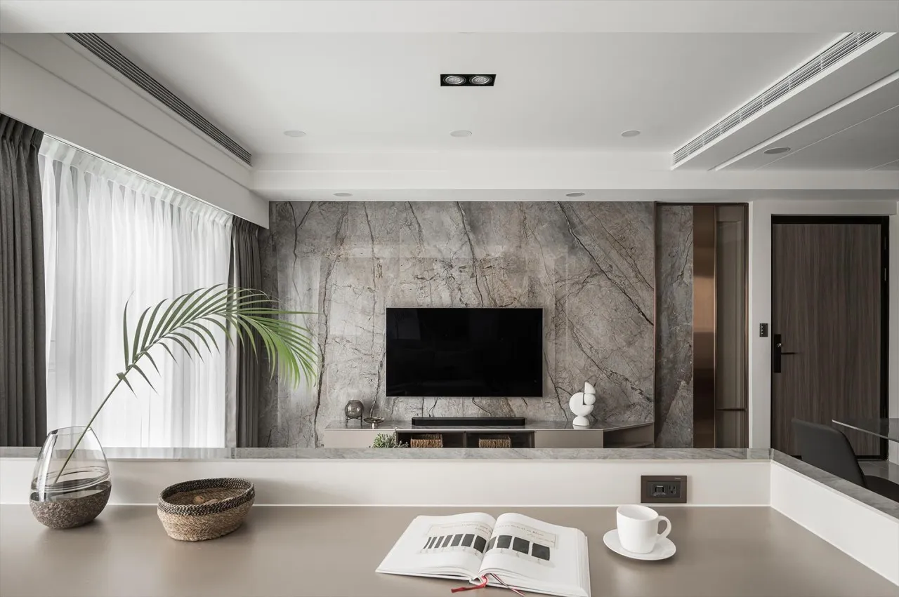 都會極簡風崇尚視覺上的潔淨與留白,讓空間保有「寬闊」的錯覺,對高端客戶而言,重點在於「奢材點綴」與「精緻比例」,可以透過珍稀的石材或金屬線條集中在局部,如:玄關地板、電視牆、吧台檯面,襯托出在白牆與淺色地板間的低調奢華。