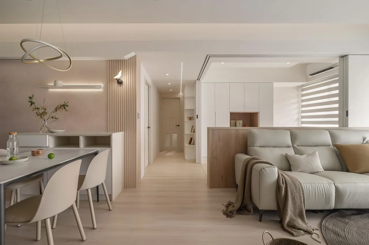 若想呈現都會極簡風的真正價值,建議屋主在整體裝修配色上保持「減法」態度,將大部分區域以淺白、灰米…等淡色作基底,來保留原本留白的優勢,在少數焦點位置「加法」奢材或大地色塊,如此一來,每當日光落下或燈光轉換,空間的純淨感與頂級奢華感便能交織出一種專屬於成功人士的優雅氣韻。