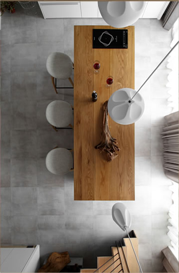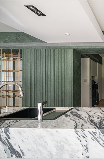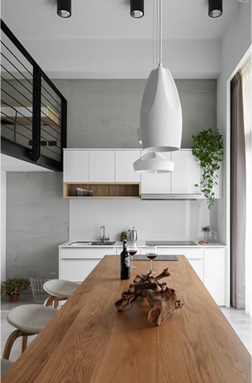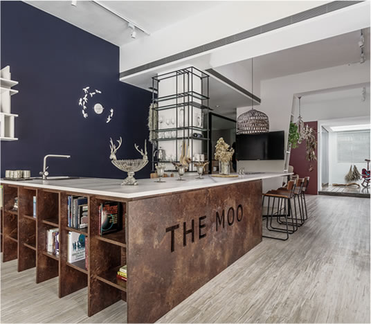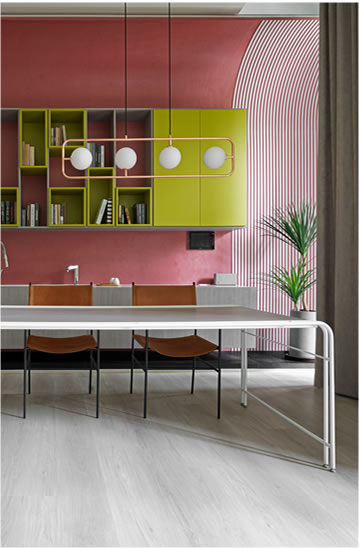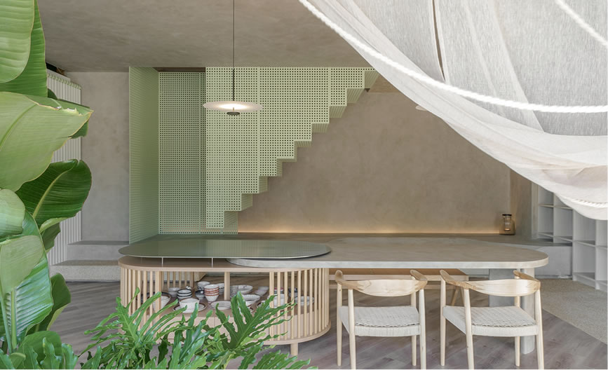 中島長桌、質樸樂土牆與變奏的柱體,