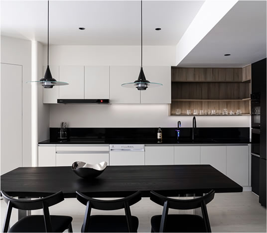 光線在留白牆面與霧黑櫃體間遊走,