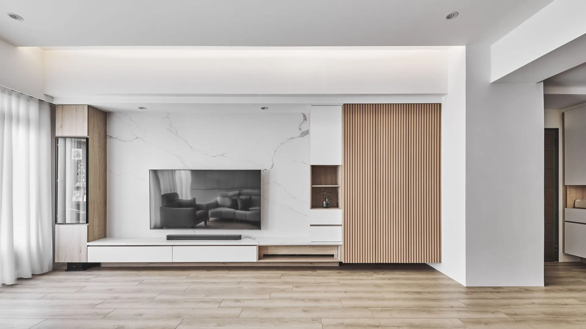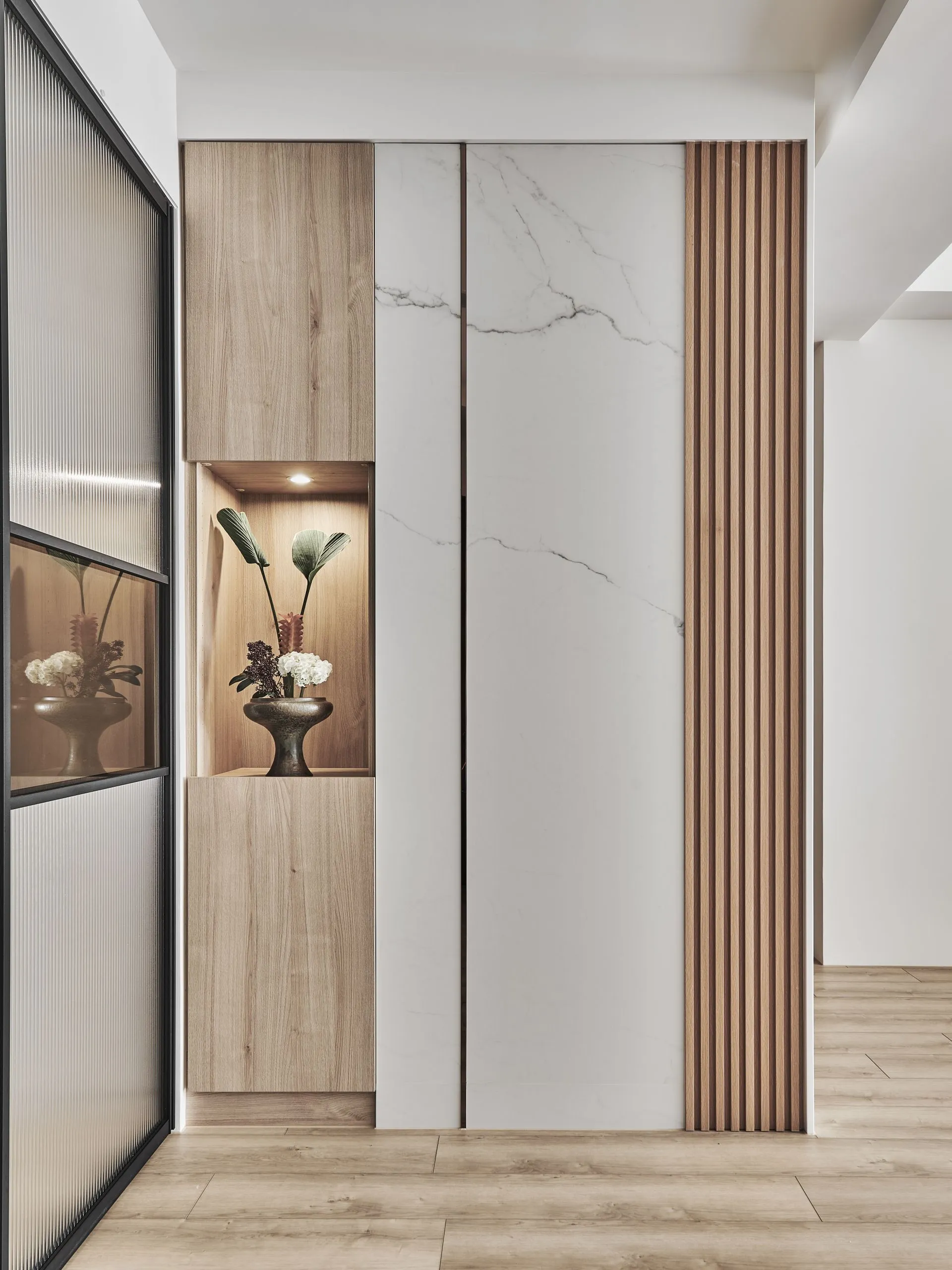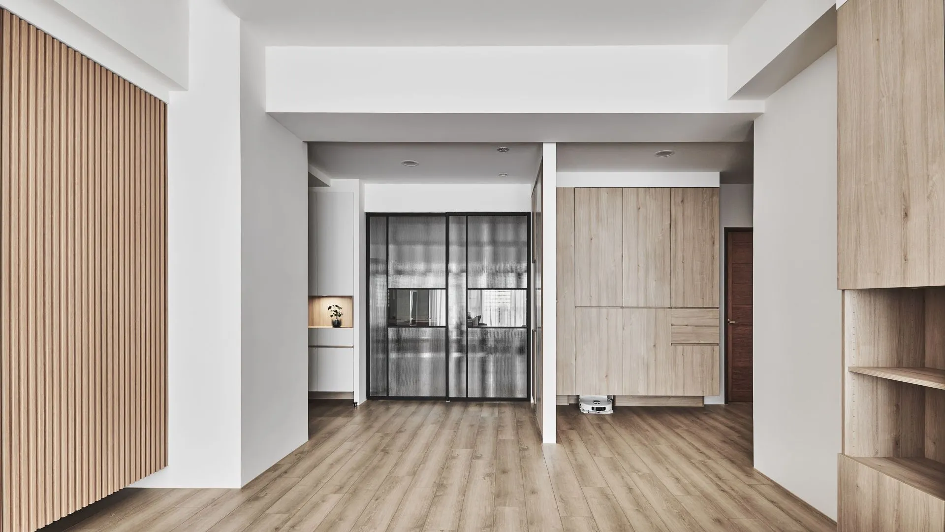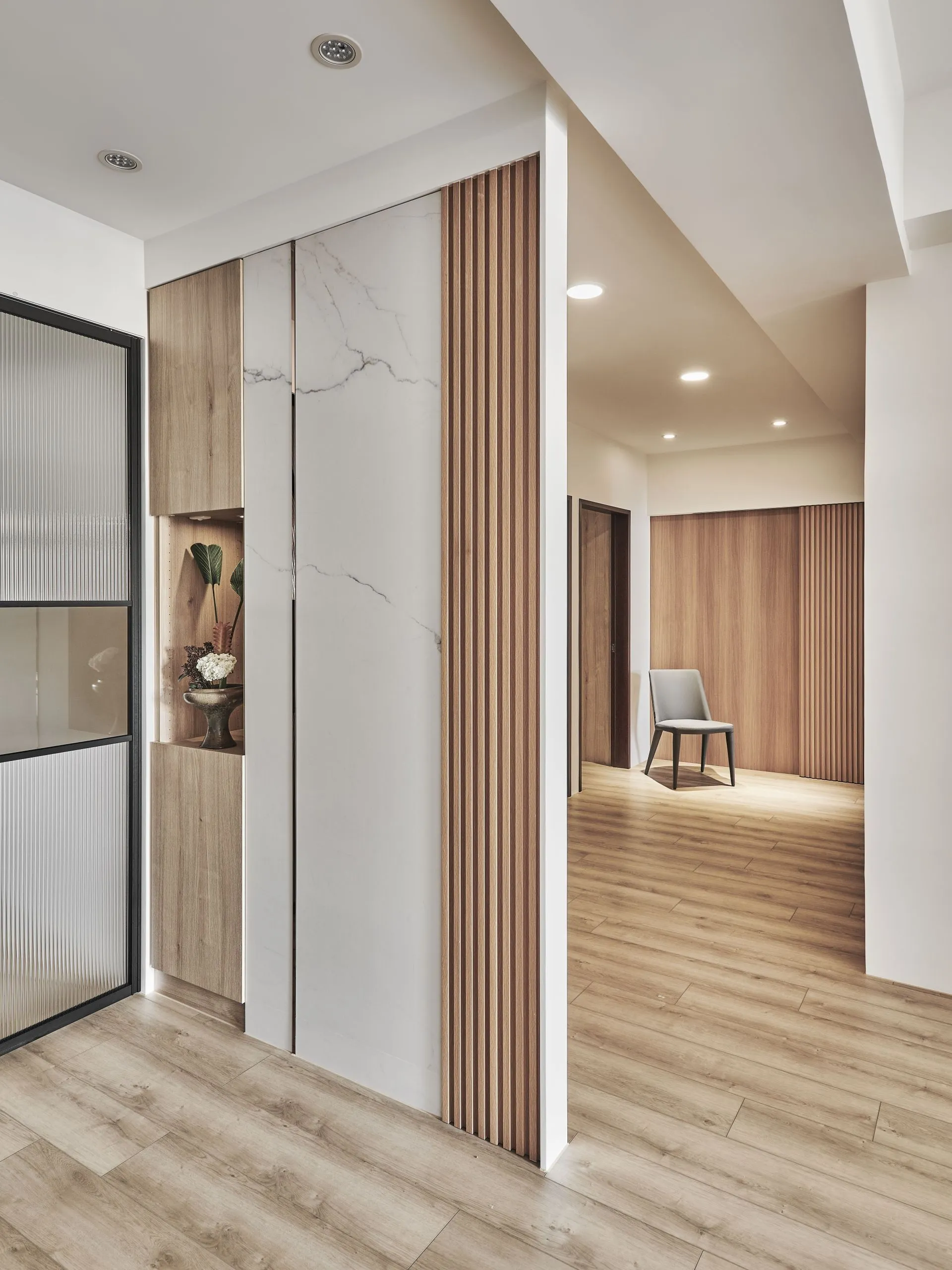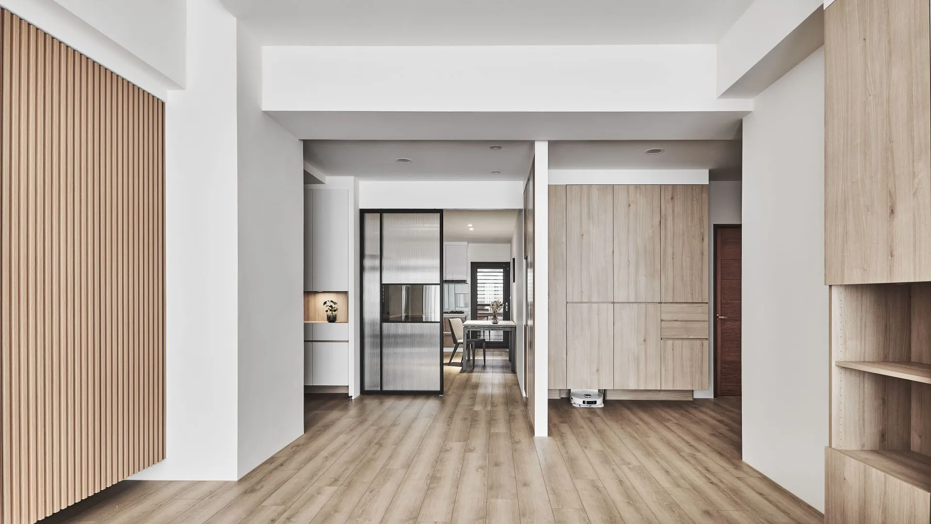 精緻的格柵飾條和木製格柵推拉門增添了設計的層次感