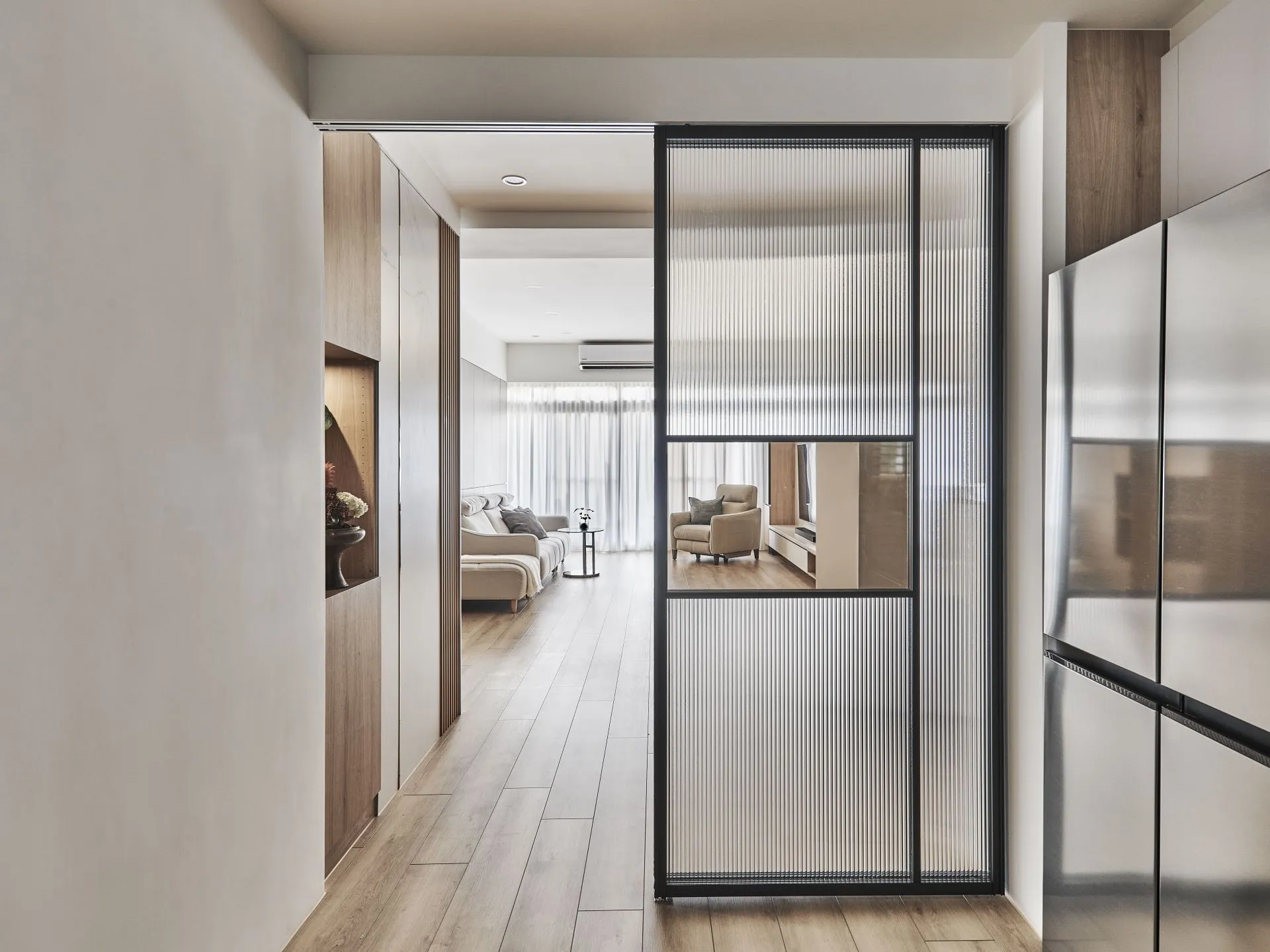 客廳和廚房之間使用鋁框推拉門