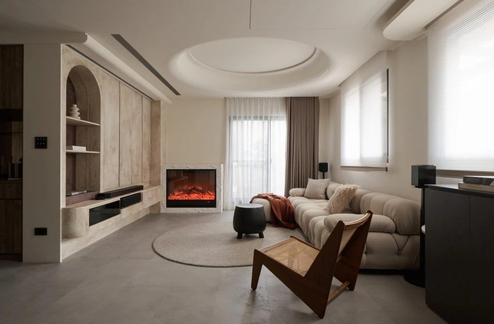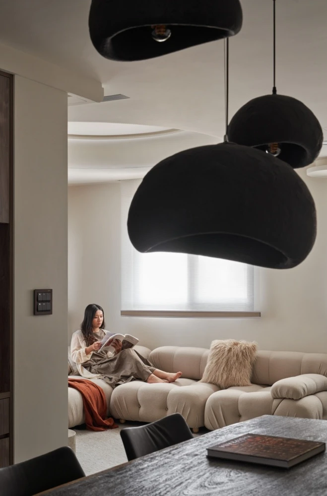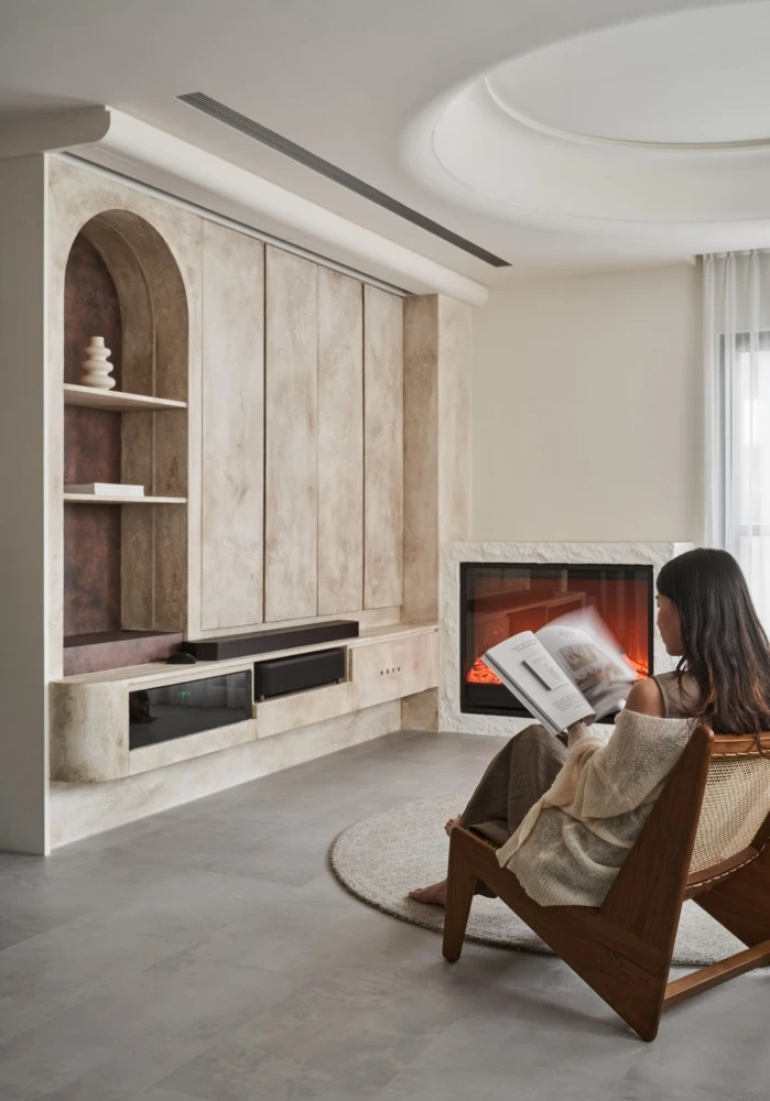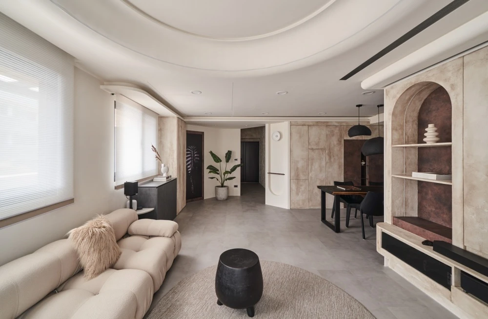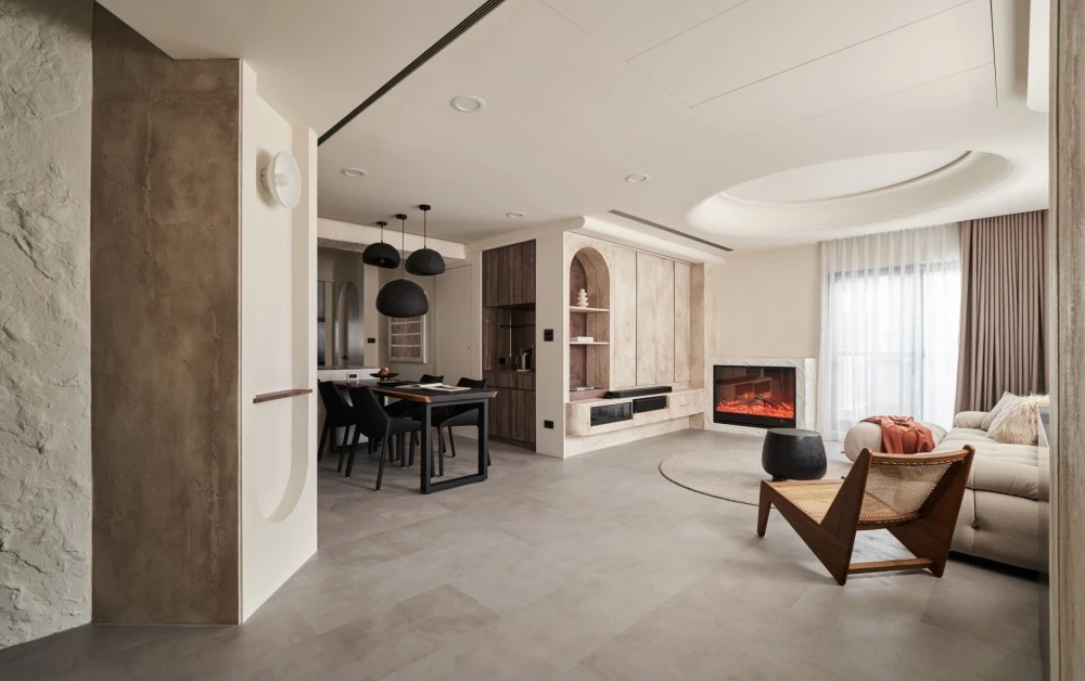 在動線格局上,將公領域空間重新分配,將玄關作為一個引景,盡頭別有洞天,同時滿足著收納視聽娛樂需求,由天然石灰岩揭開序幕,曙光乍現準備迎接永恆之光到來,預告著跨越時間之外的存在,用塗料製造仿舊感,呈現的是內蘊的英式氣質,在色調乾淨的純米白空間,觀看一場新與舊的碰撞衝擊視覺享受。