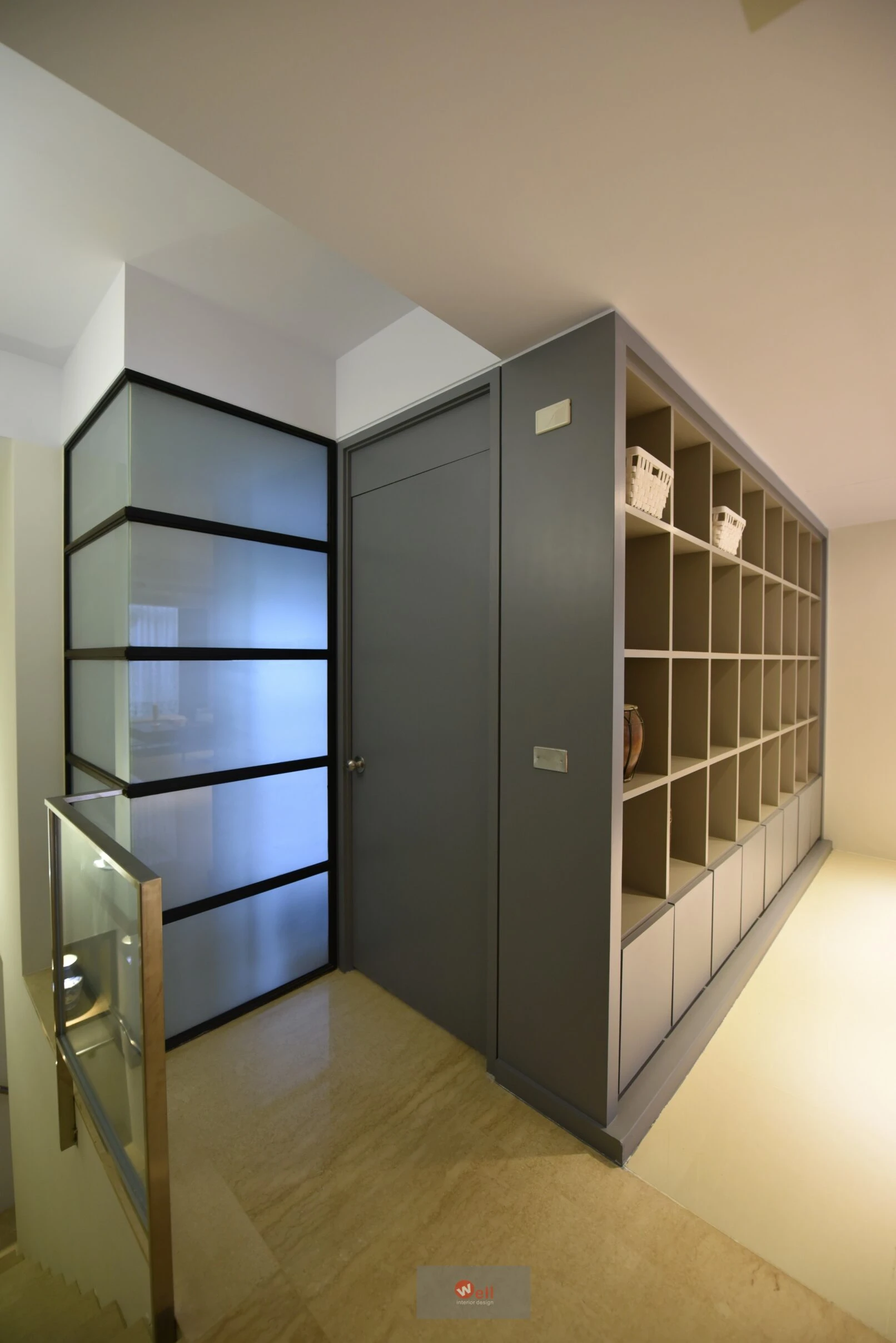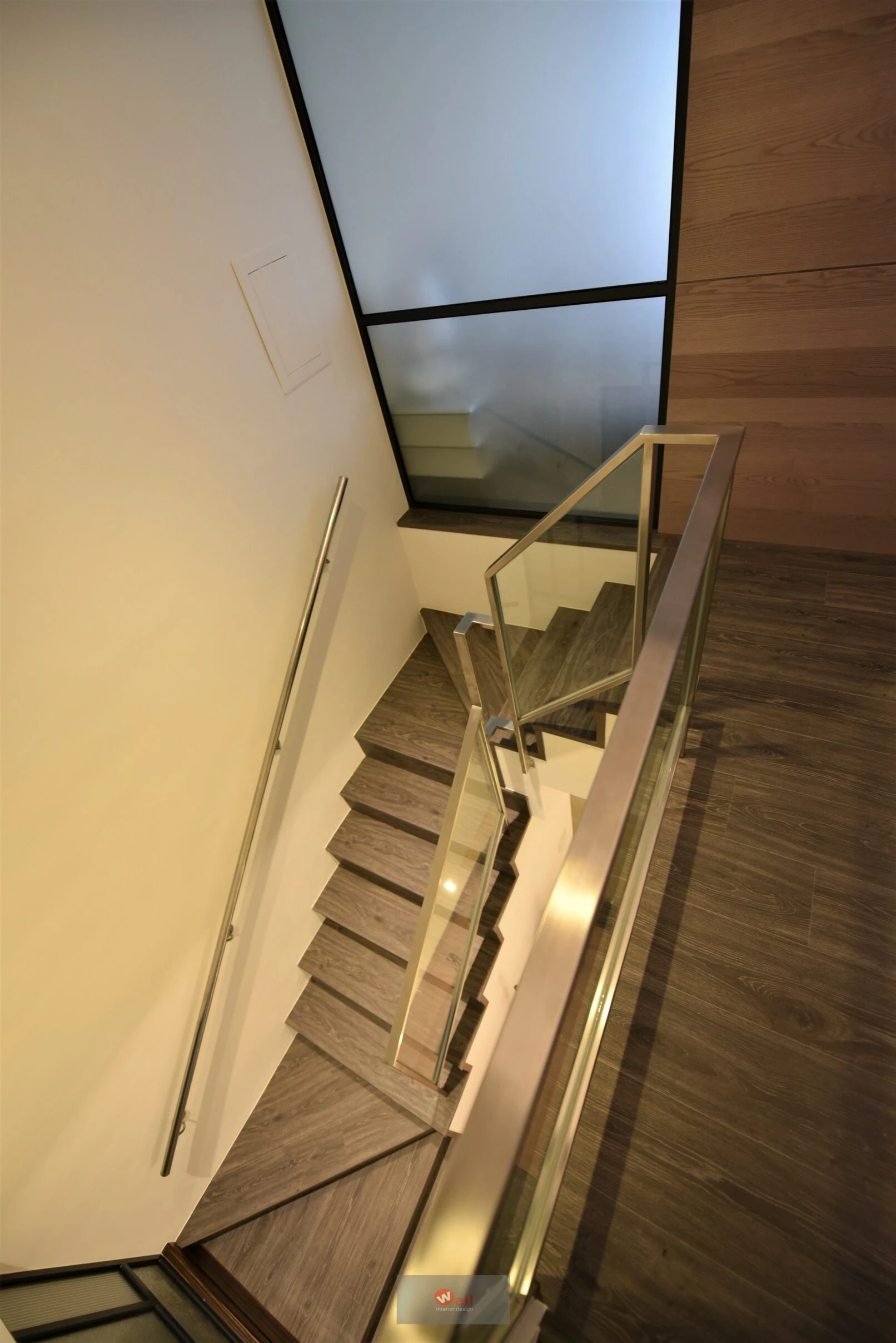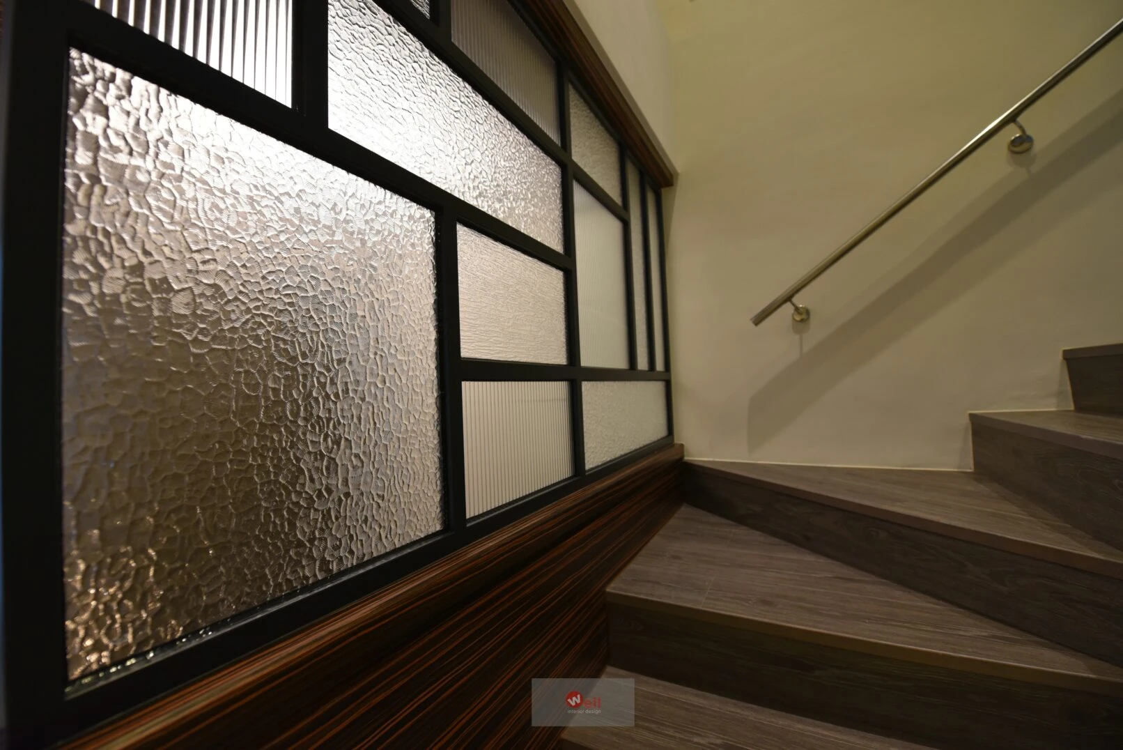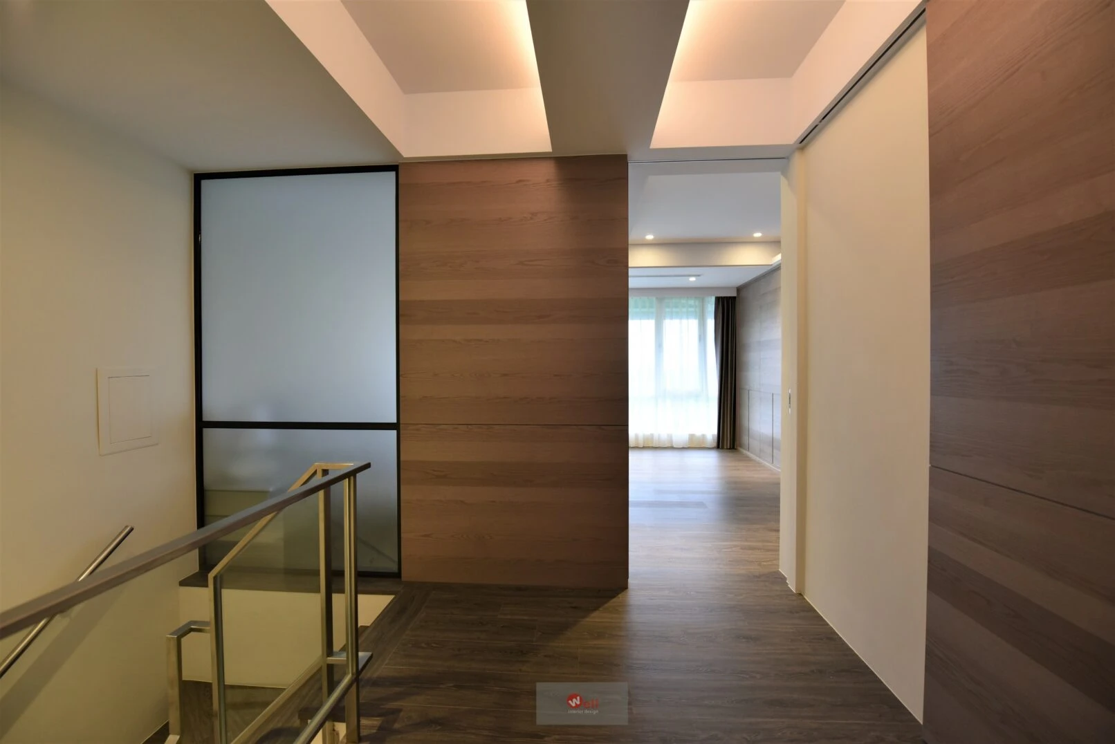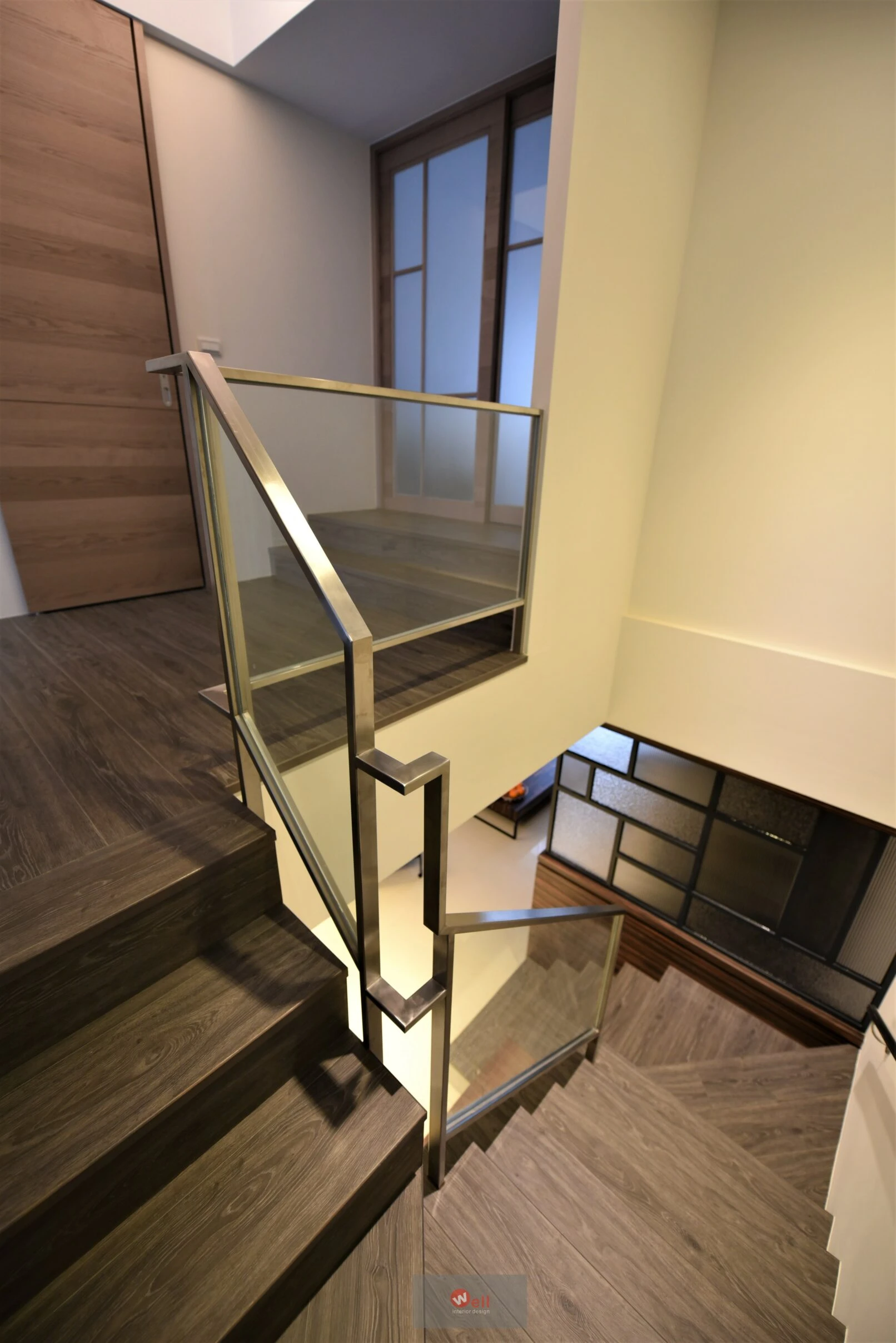 樓梯地坪選用耐磨木地板,柔化石材的冷冽質感,並強化日常行走的舒適度。整體色彩收斂於低彩度範圍,讓材質本身成為主角,而非過度裝飾的視覺焦點。