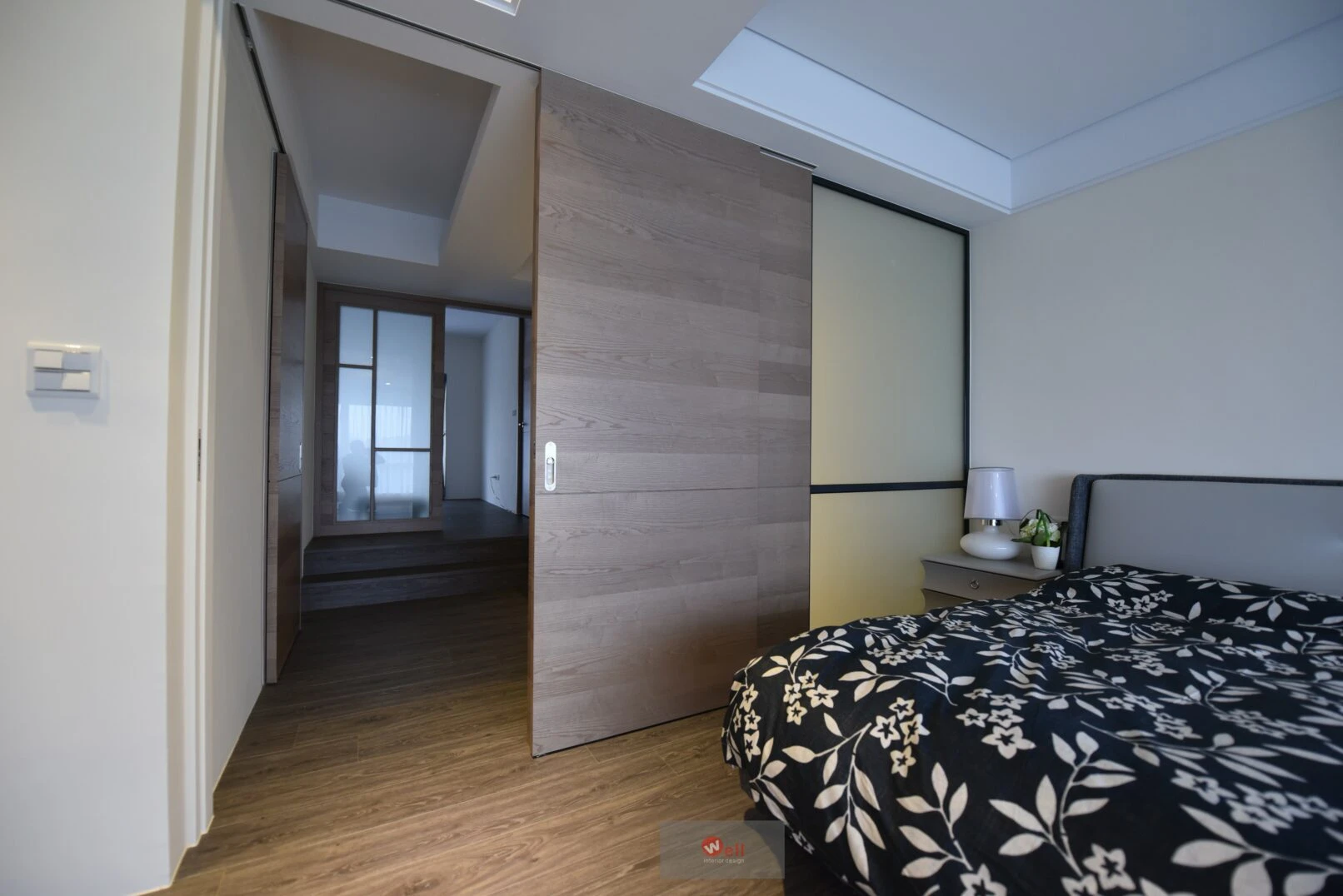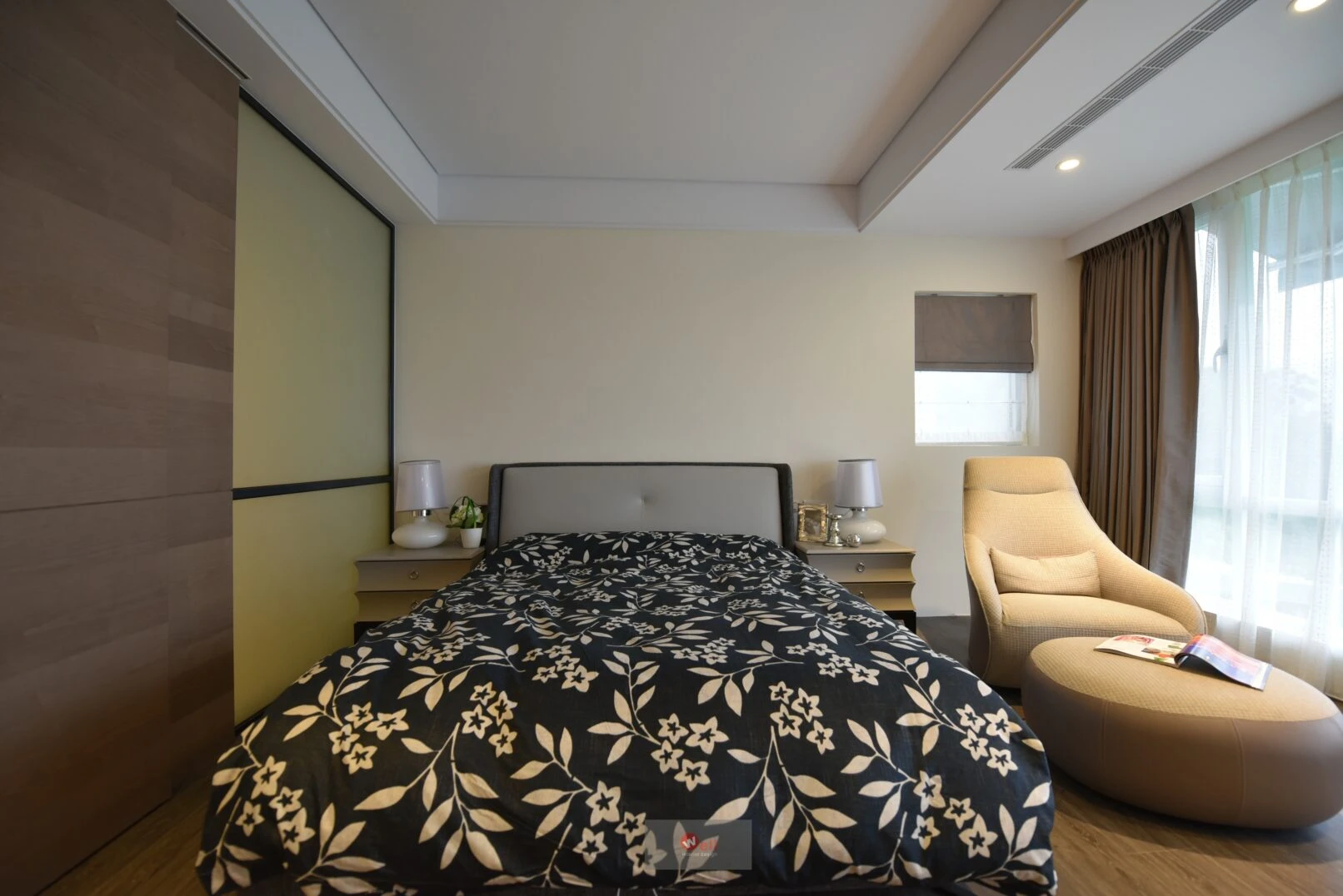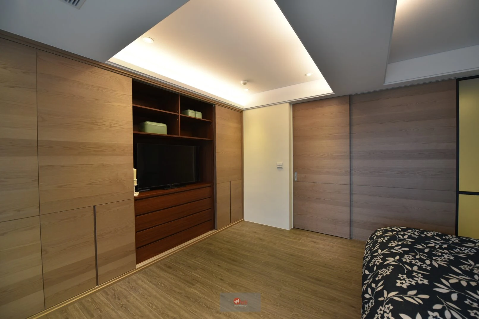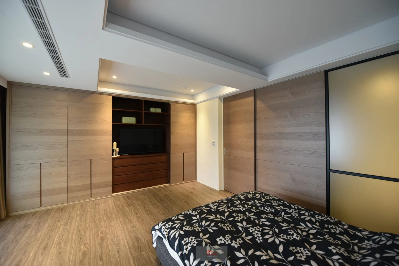 相較於公共區域的開放與流動,主臥空間則轉向更沉靜的氛圍營造。 透過色調的收斂與材質觸感的調整,構築出專屬於夫妻二人的休憩場域。機能收納隱於立面之中,降低視覺干擾,使空間回歸單純與放鬆。
