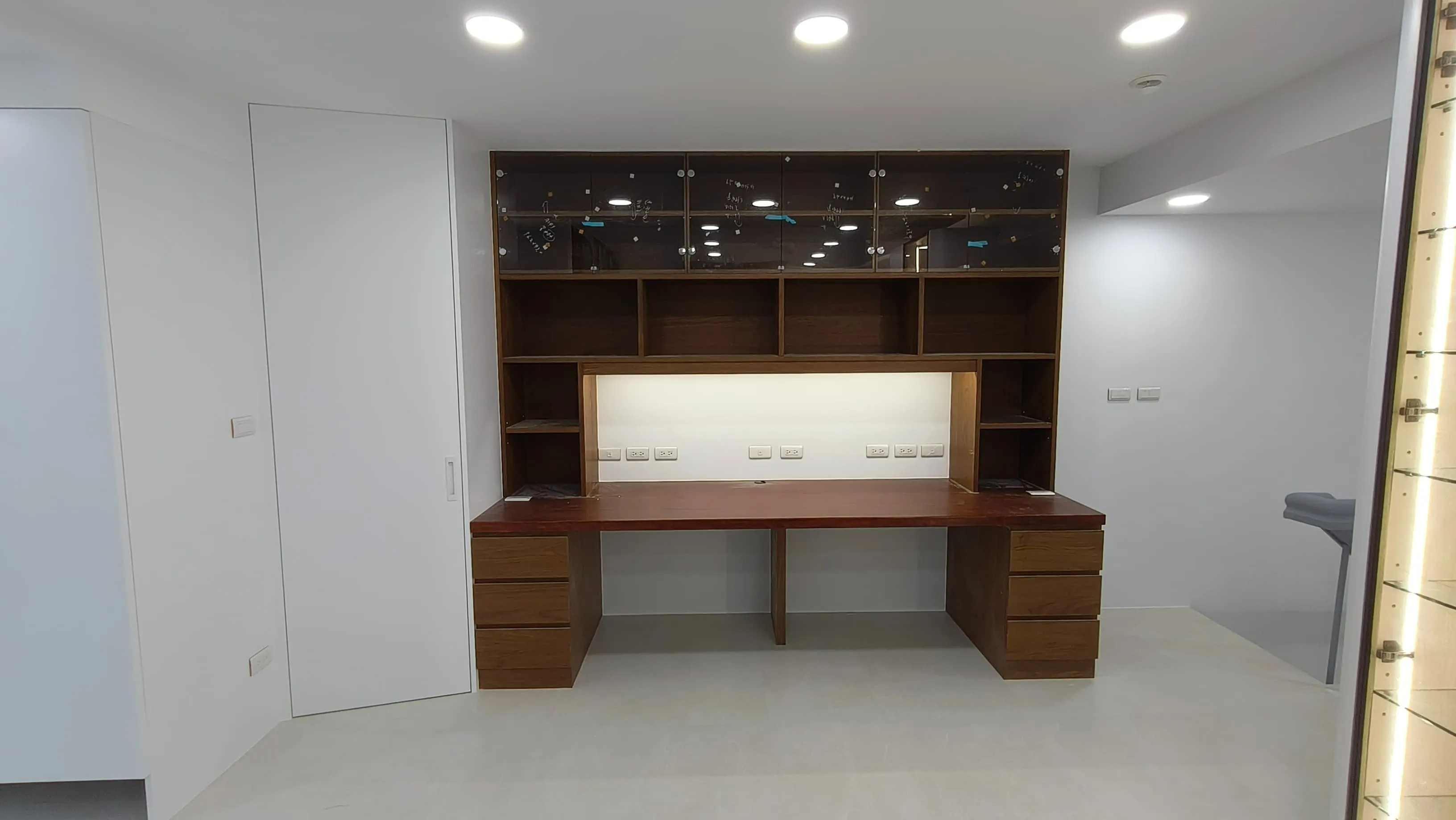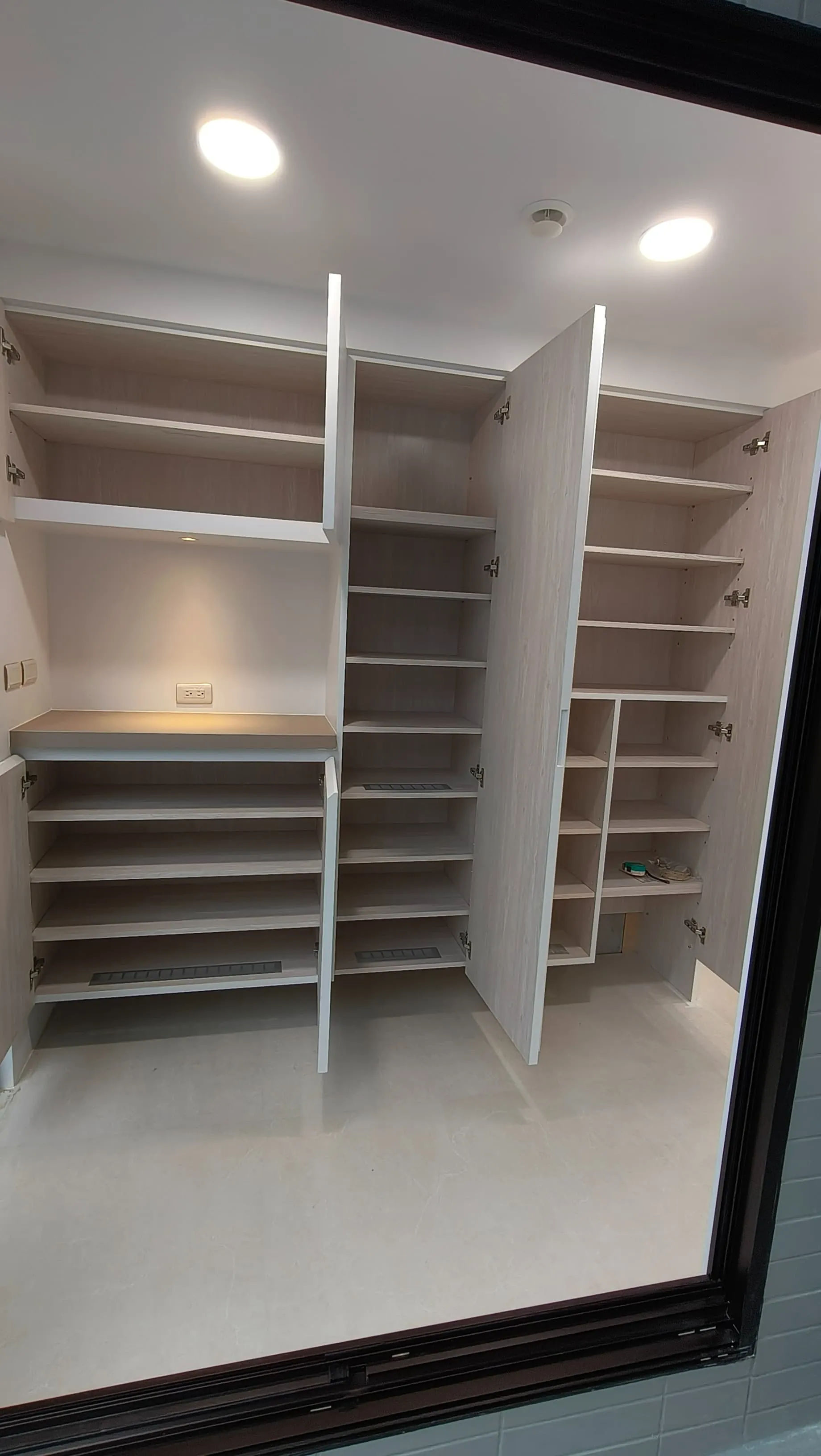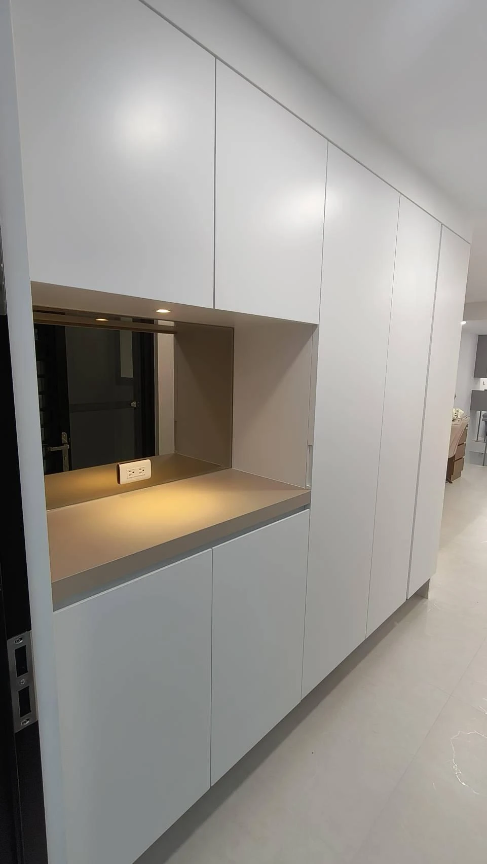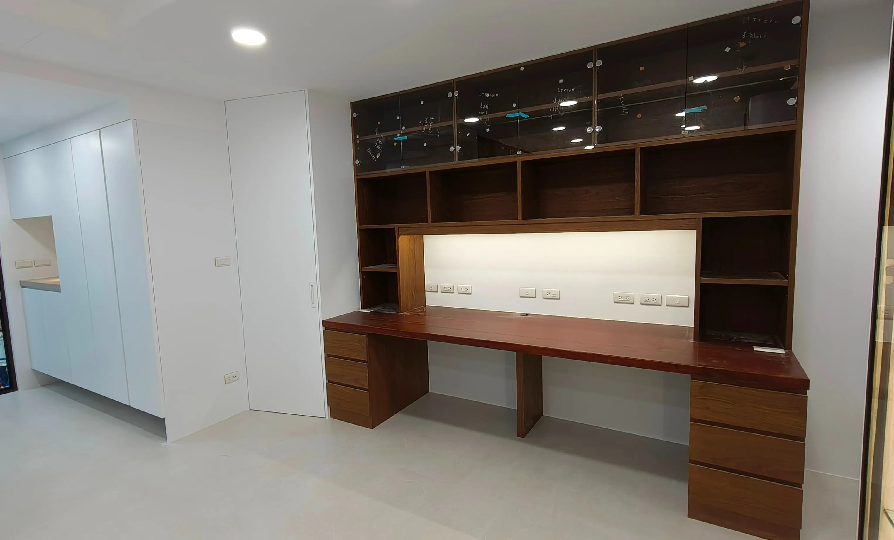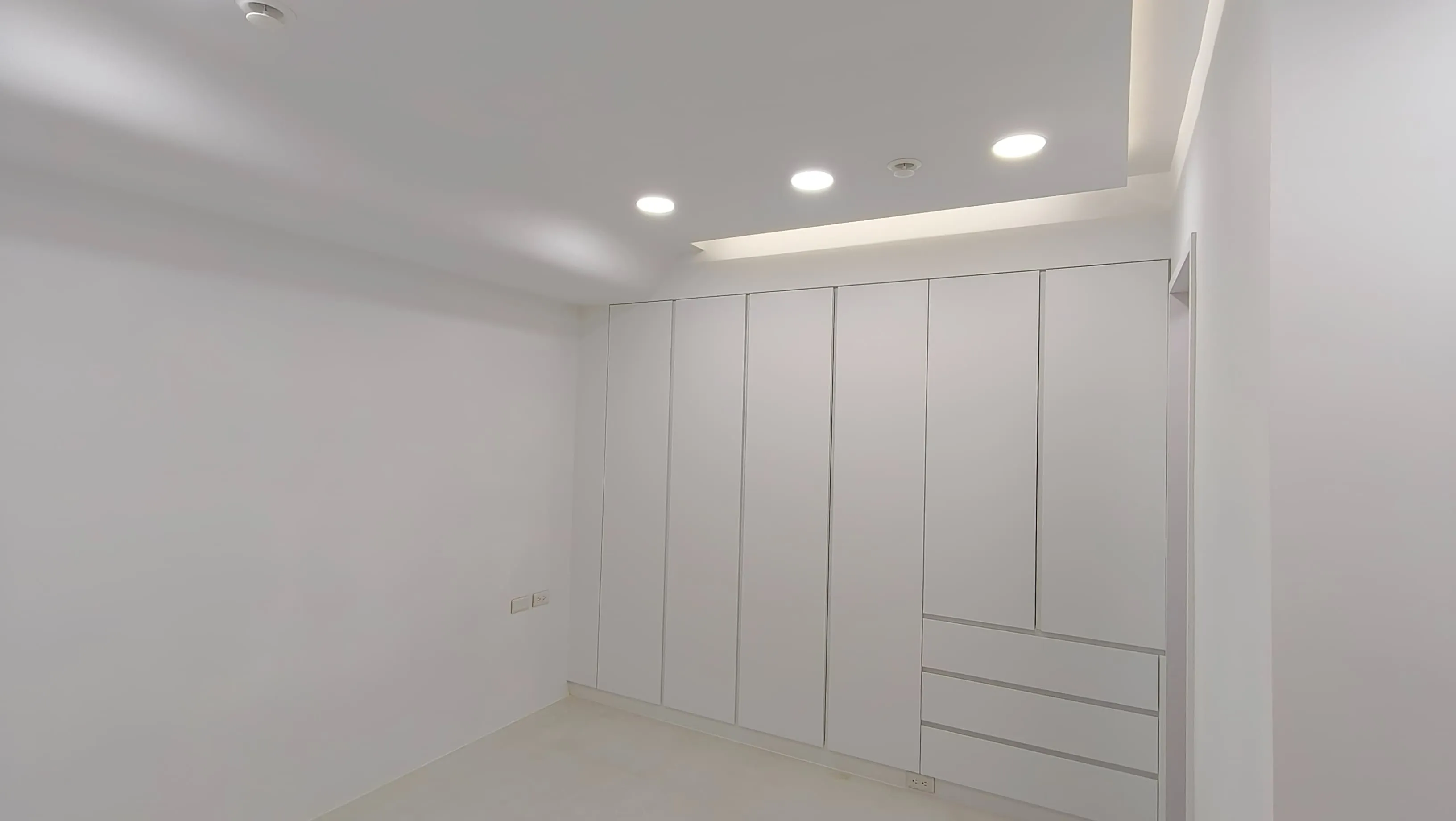 櫃體工程是整個裝修過程中的一大挑戰。木工訂製的櫃體由於設計複雜,耗時較長。原本計劃使用木皮的櫃體門片最終改為冷烤噴漆,這一變更增加了製作難度。噴漆過程中,噴塗的質量與均勻性是關鍵,使用了班傑明摩爾的水性冷烤漆,以確保環保和美觀。