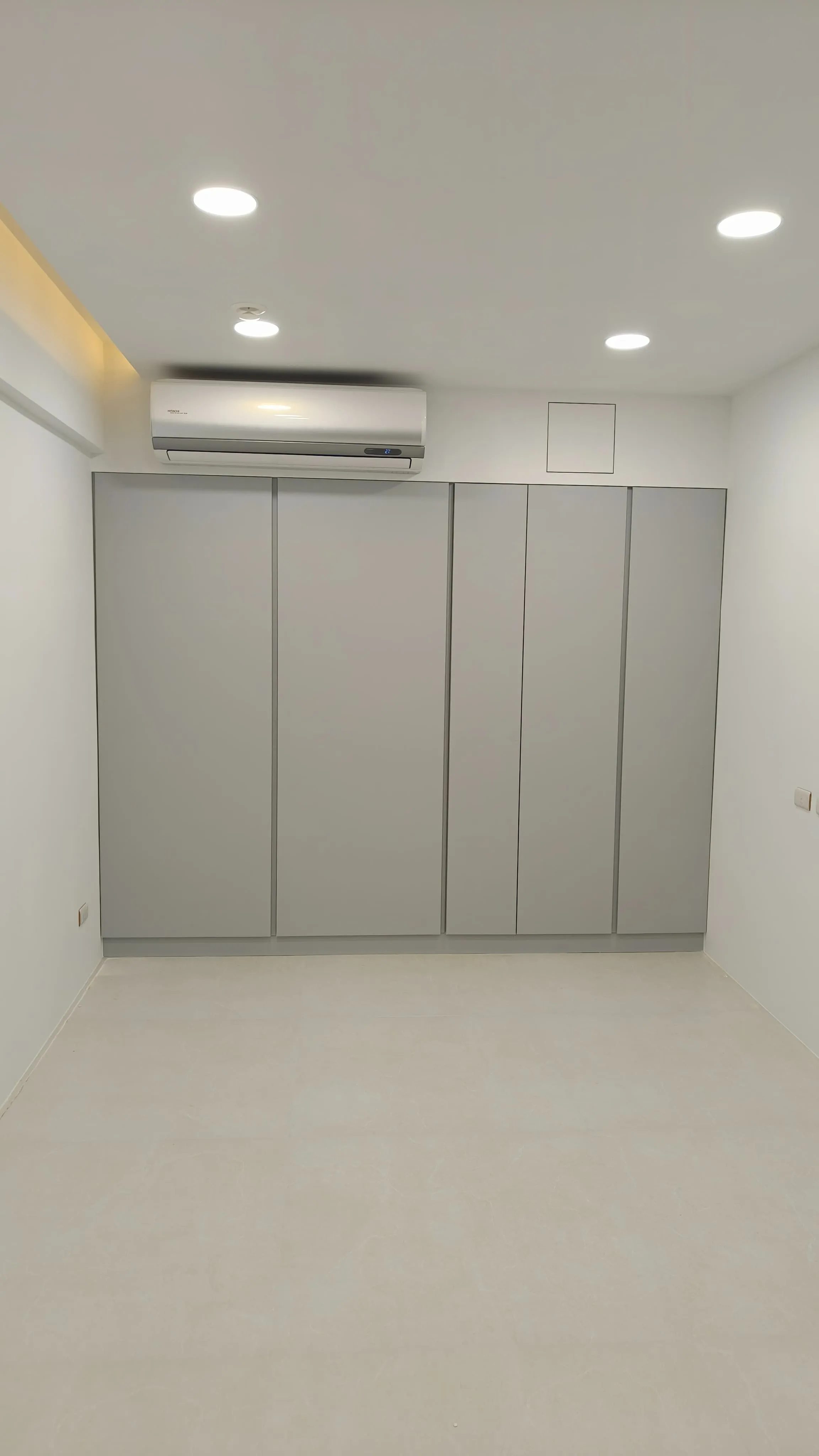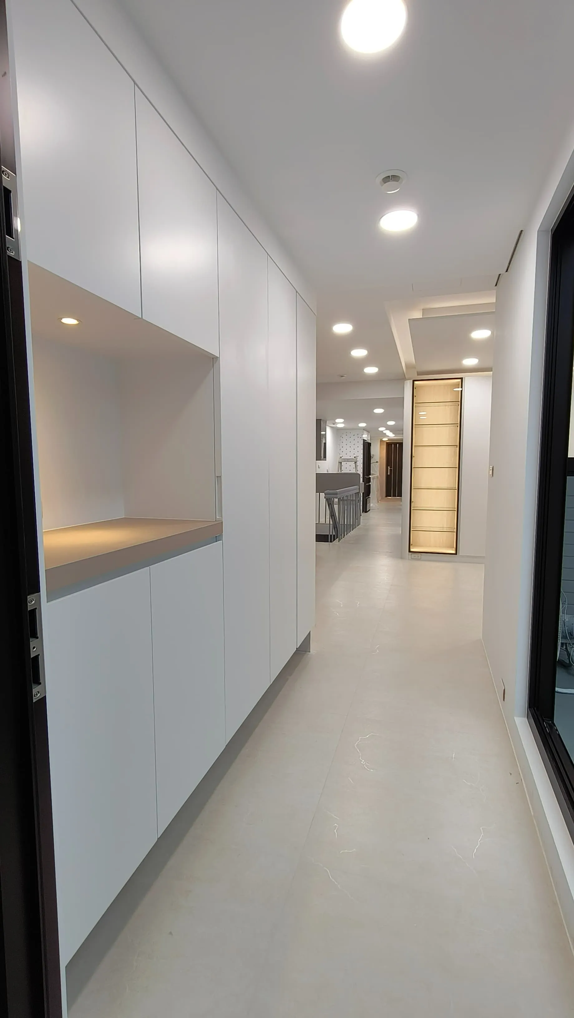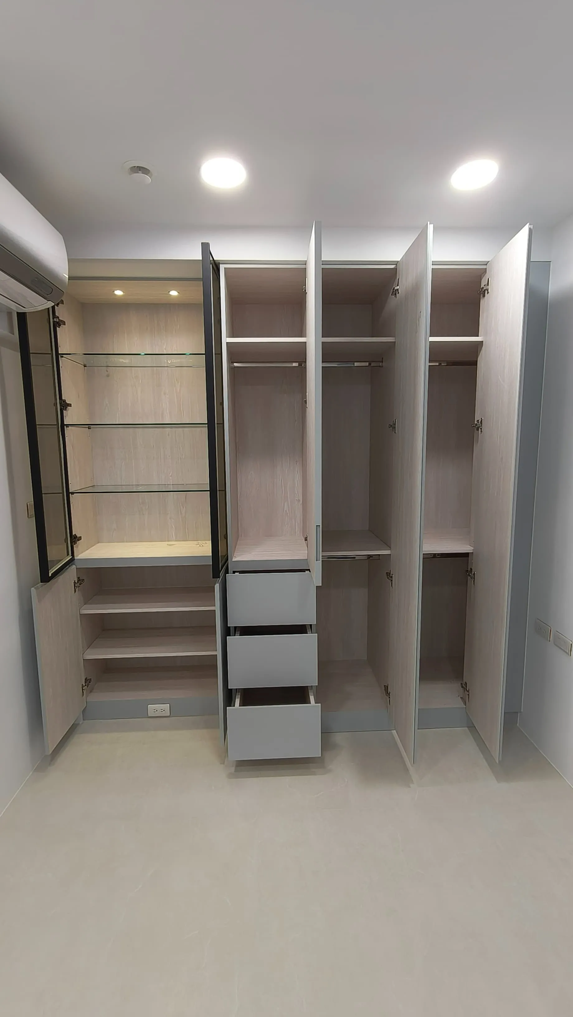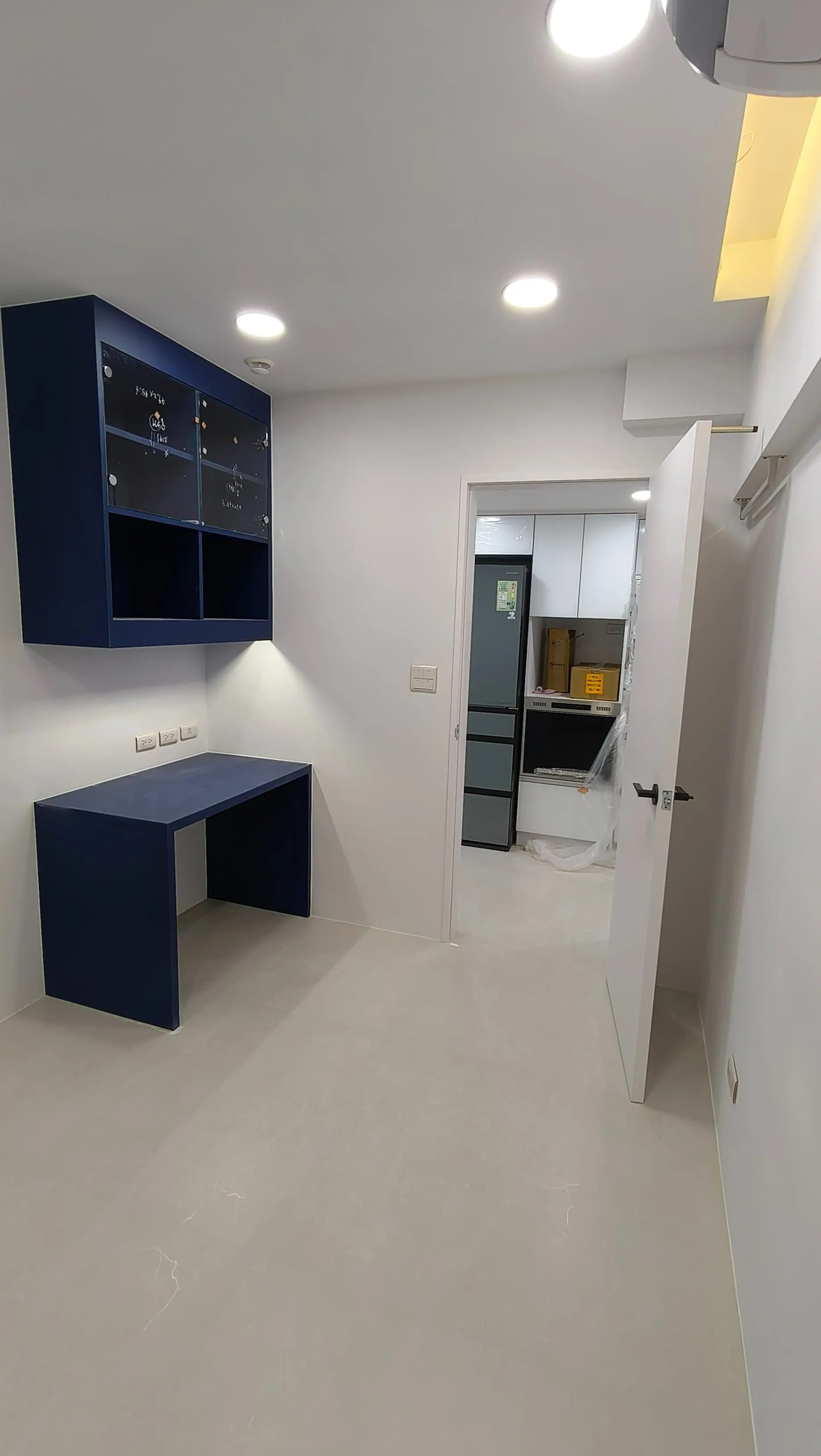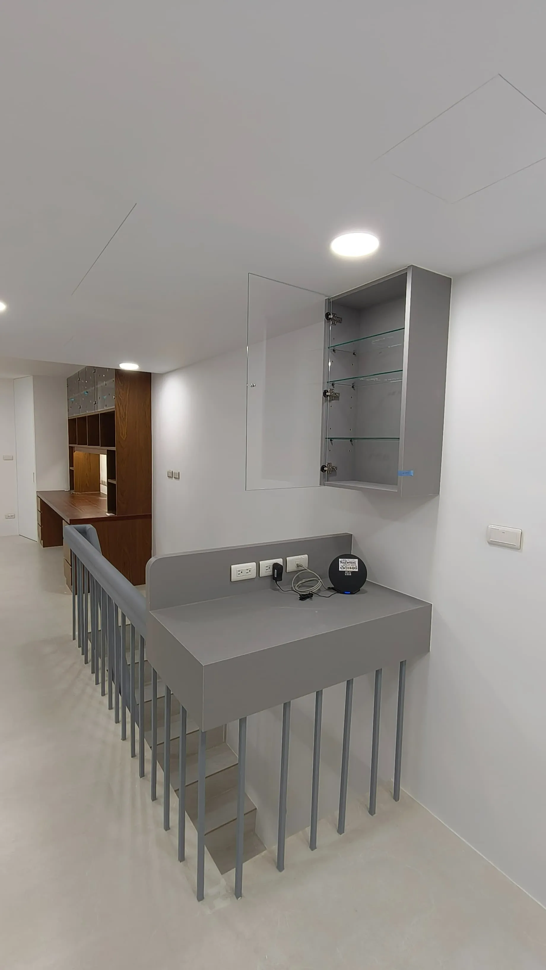 櫃體工程是整個裝修過程中的一大挑戰。木工訂製的櫃體由於設計複雜,耗時較長。原本計劃使用木皮的櫃體門片最終改為冷烤噴漆,這一變更增加了製作難度。噴漆過程中,噴塗的質量與均勻性是關鍵,使用了班傑明摩爾的水性冷烤漆,以確保環保和美觀。
