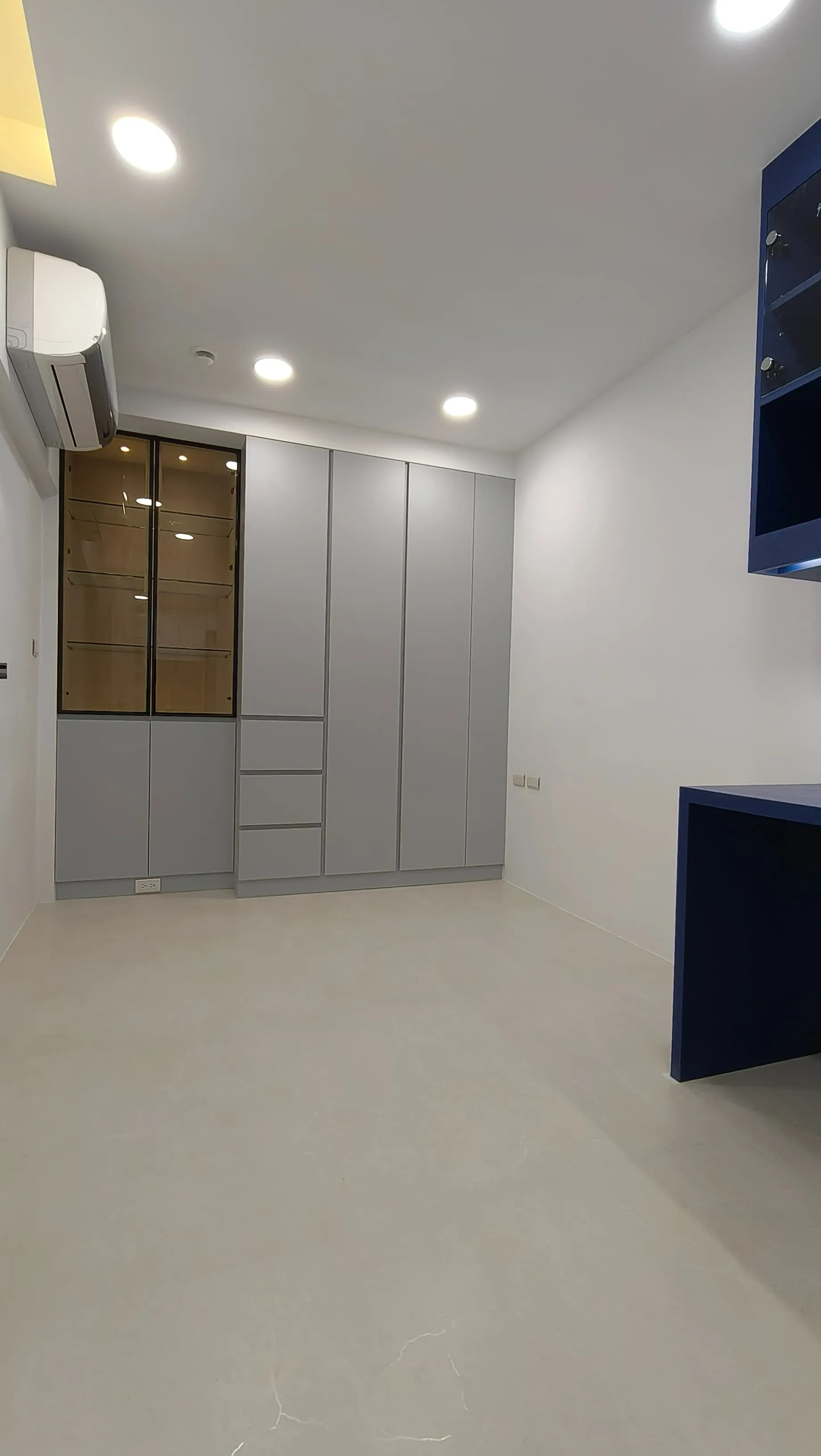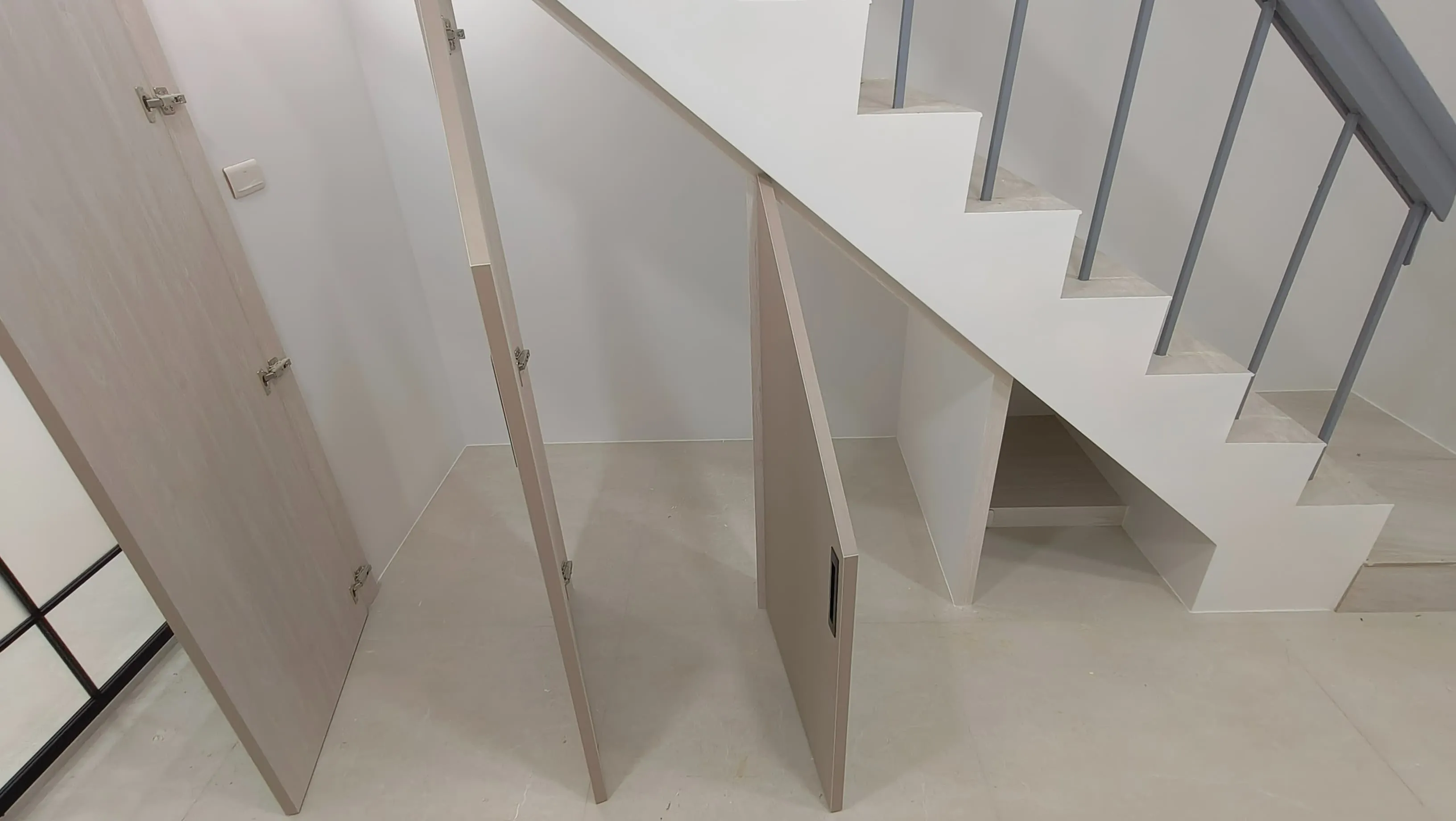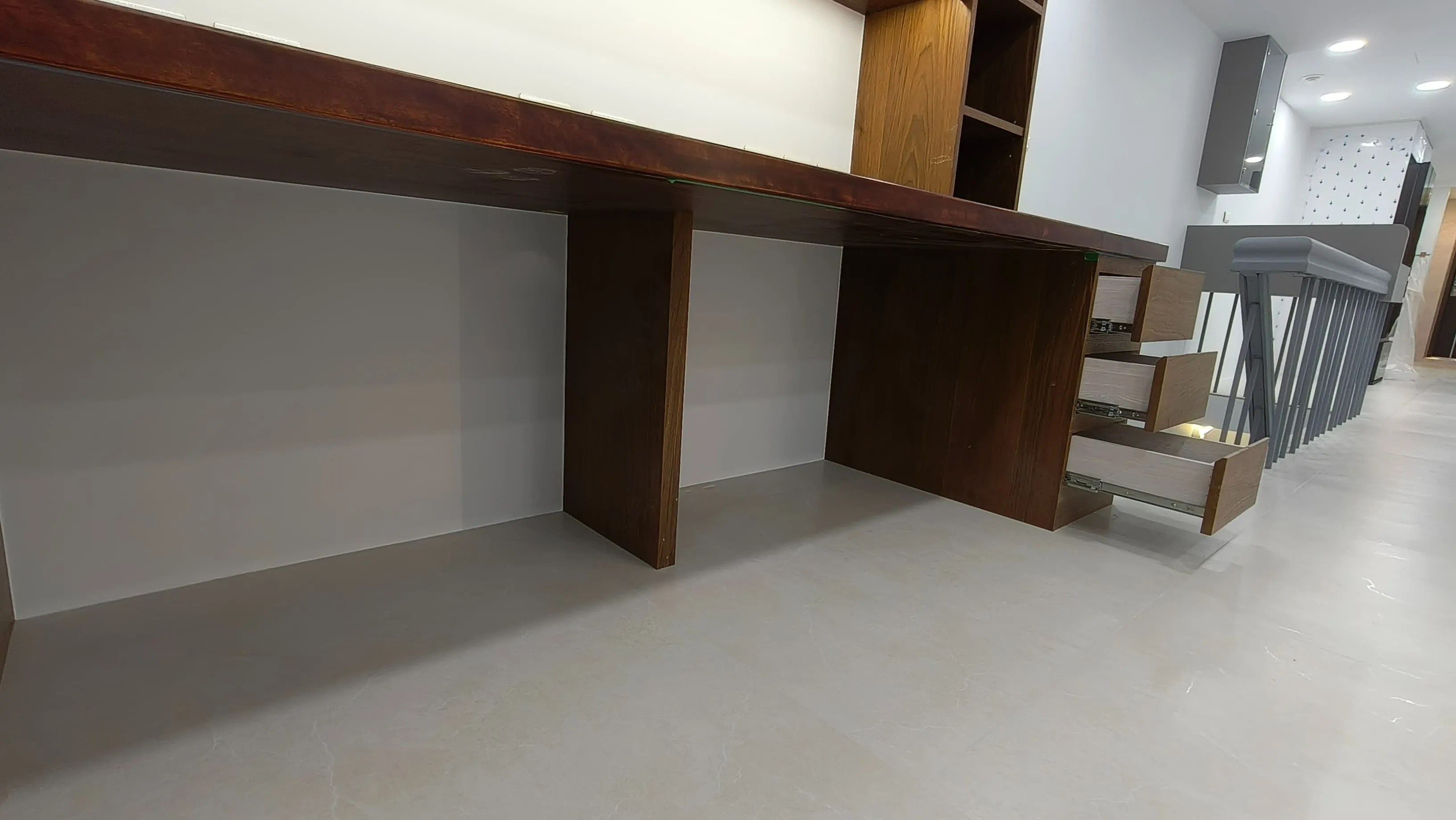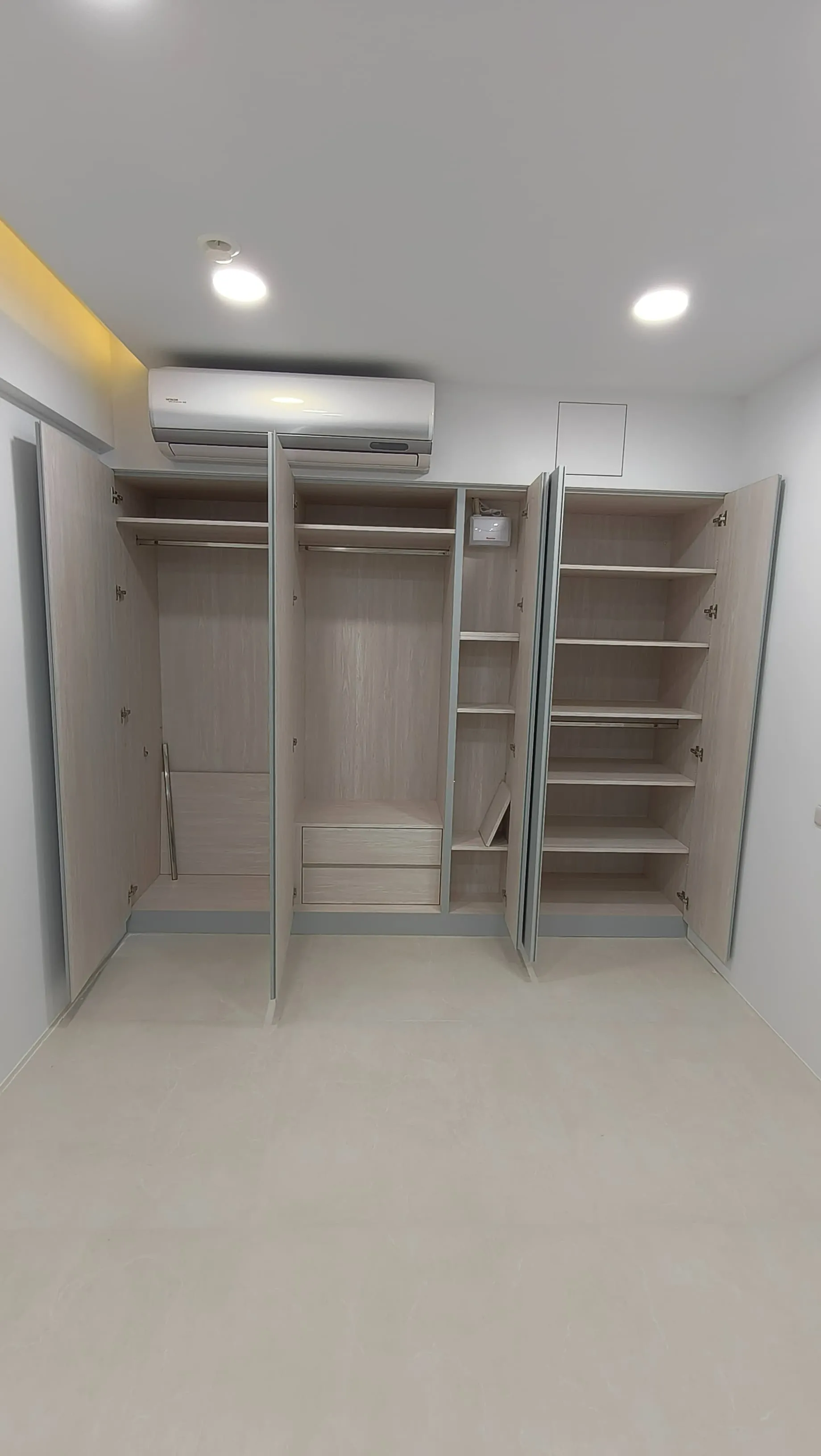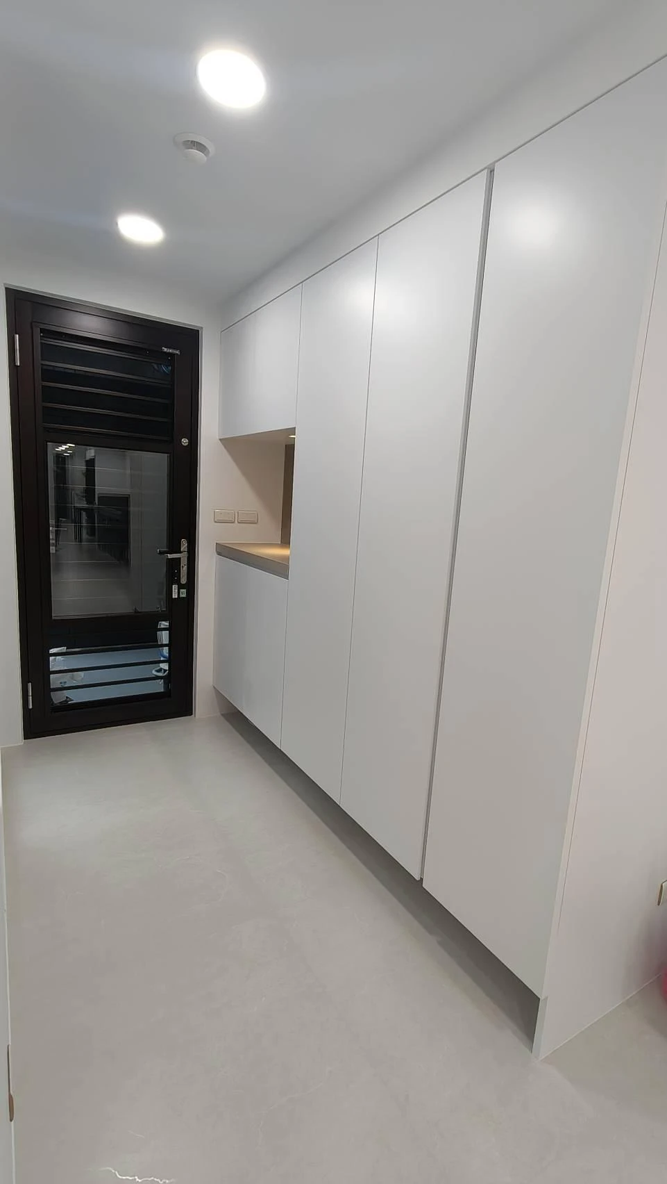 櫃體工程是整個裝修過程中的一大挑戰。木工訂製的櫃體由於設計複雜,耗時較長。原本計劃使用木皮的櫃體門片最終改為冷烤噴漆,這一變更增加了製作難度。噴漆過程中,噴塗的質量與均勻性是關鍵,使用了班傑明摩爾的水性冷烤漆,以確保環保和美觀。