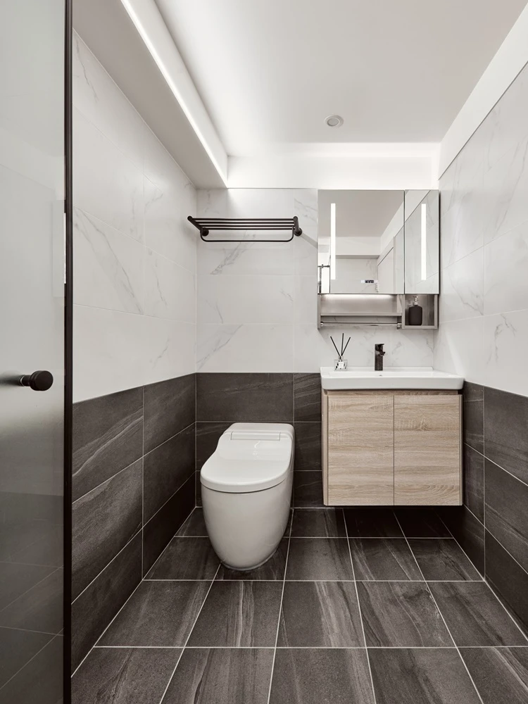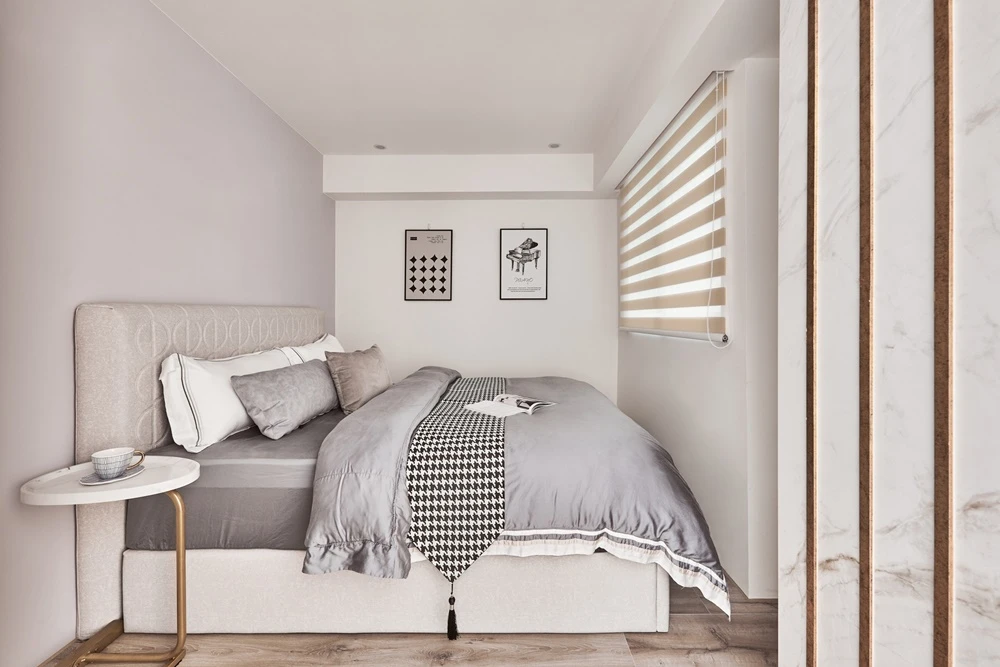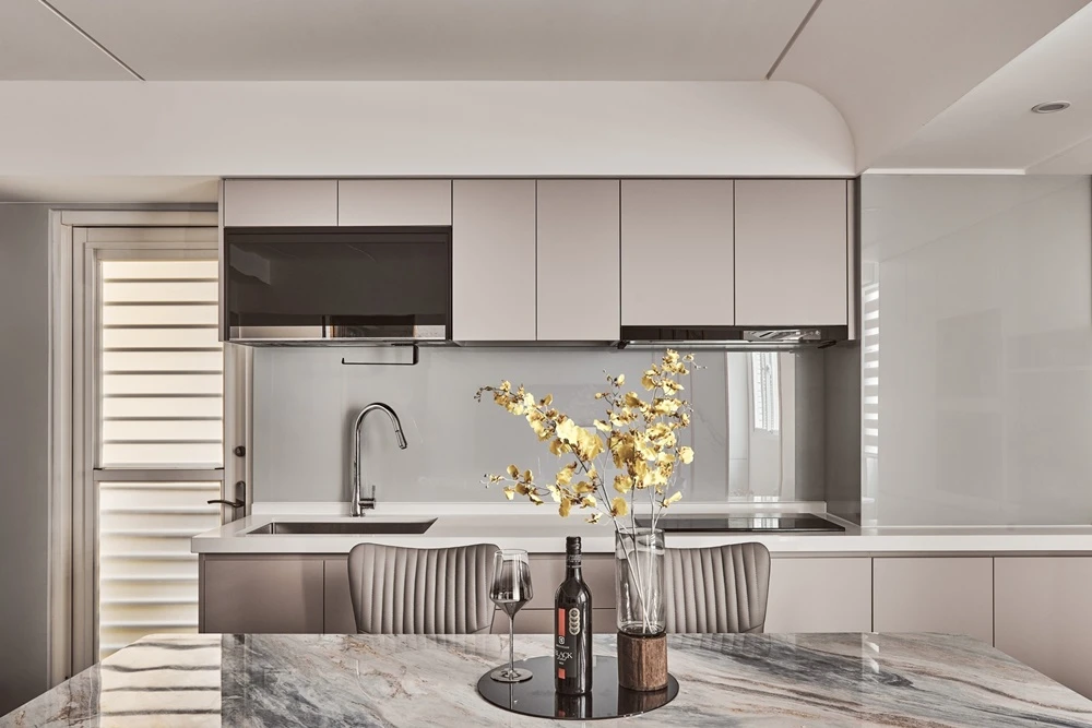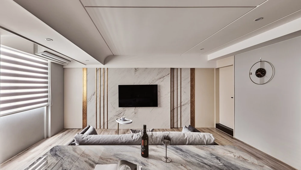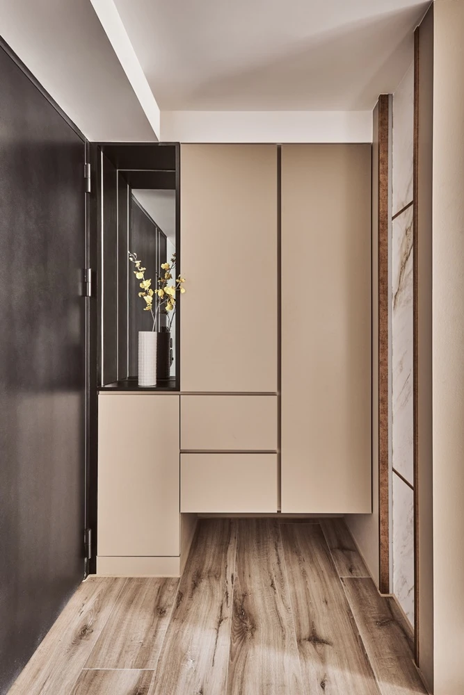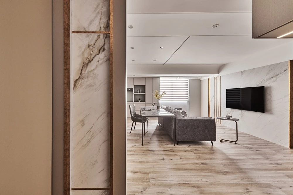 運用石材紋理作為玄關端景,不僅止於風水考量,更使空間張力得以展現,並沿伸至室內,電視牆的連貫與金邊交錯,營造出奢華的氣勢,一旁的灰與鵝黃,安靜沉穩的襯托著主角的姿態。淺色系的色彩搭配,圓弧與線條感的交錯堆疊 ,伴隨著沙發上姊妹的嬉笑、酒杯的清脆碰撞,充斥著空間的維度與虛實。廁所的黑白對比、燈光營造,不僅讓人忘卻建築結構的既定限制,更較於公領域營造出不同的感官體驗。