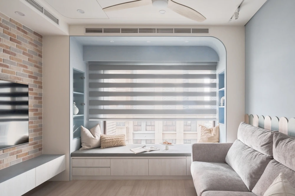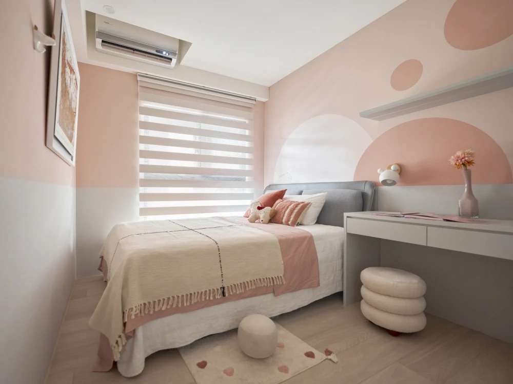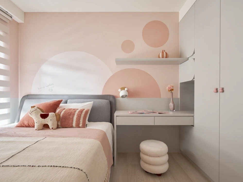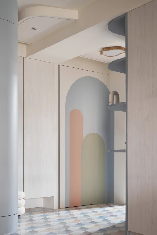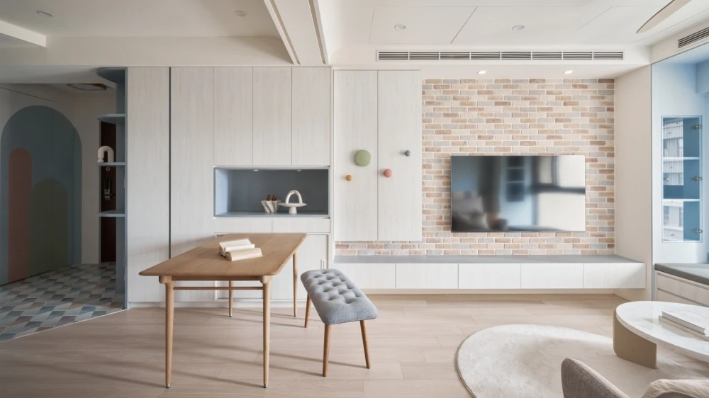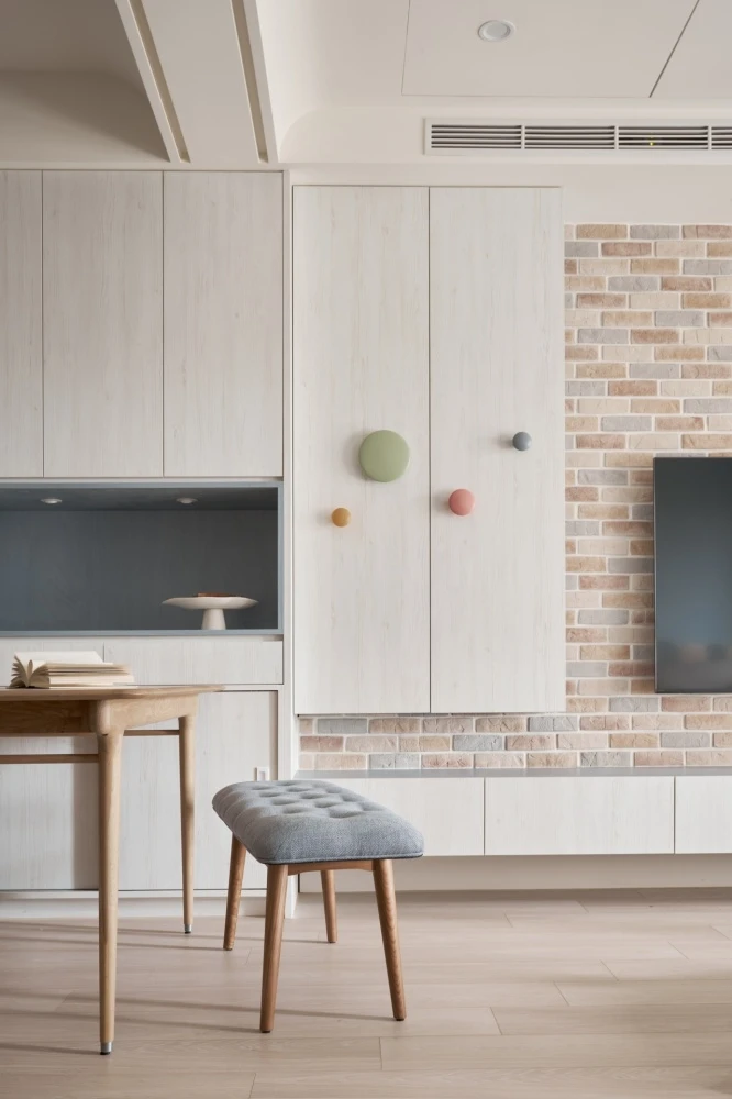 繽紛的色彩象徵著家庭成員之間的互動與參與,每一道色彩都像是他們生活中的一部分,彼此交織著。而純潔的白色,則如同包容一切色彩的大海,讓每個家庭成員在這個空間中都感到自在和融洽。