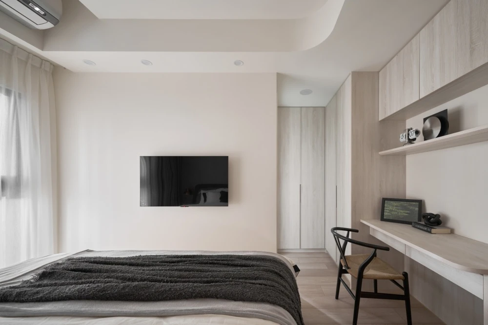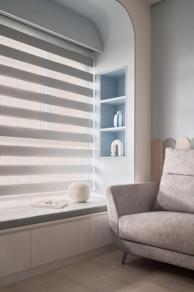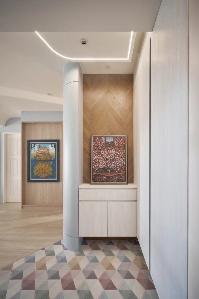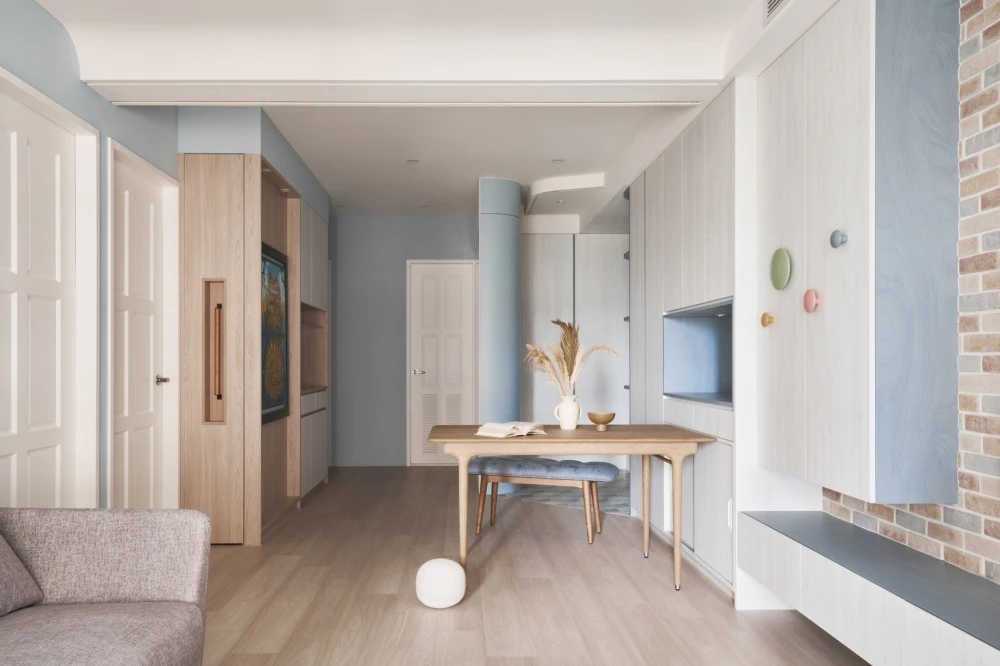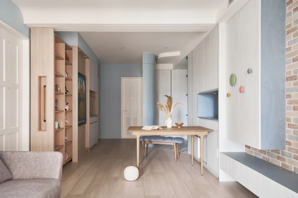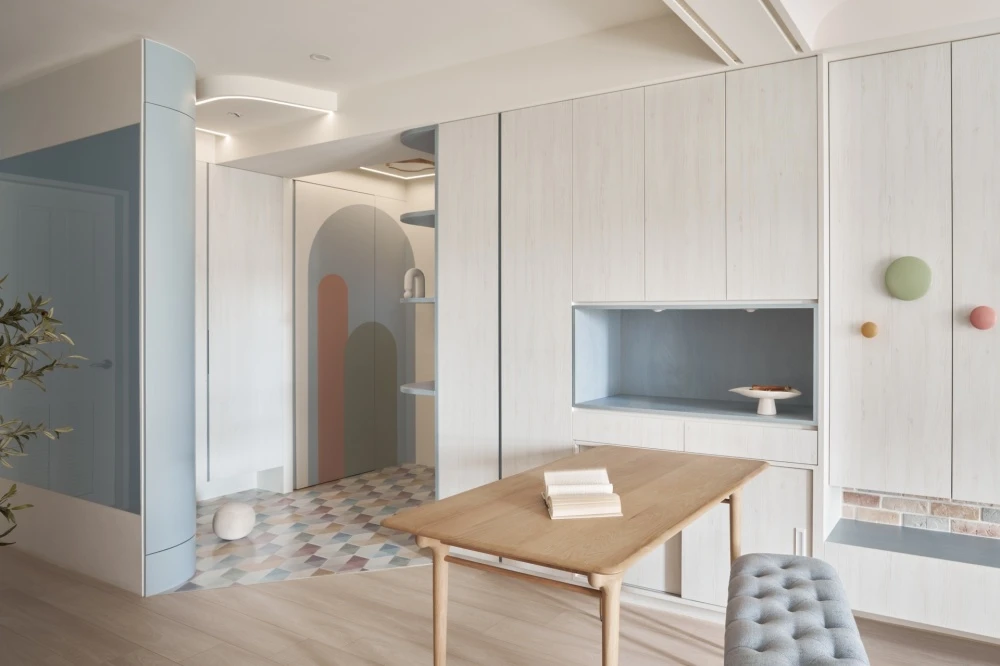 淺淺的木紋增添了房屋的溫暖氛圍,它們的紋路和質感彷彿在述說著家庭的故事。弧形的櫃體不僅引導著視線和走向,更是家庭成員之間互動的象徵,每一個轉角都是一場新的探索和共享的開始。