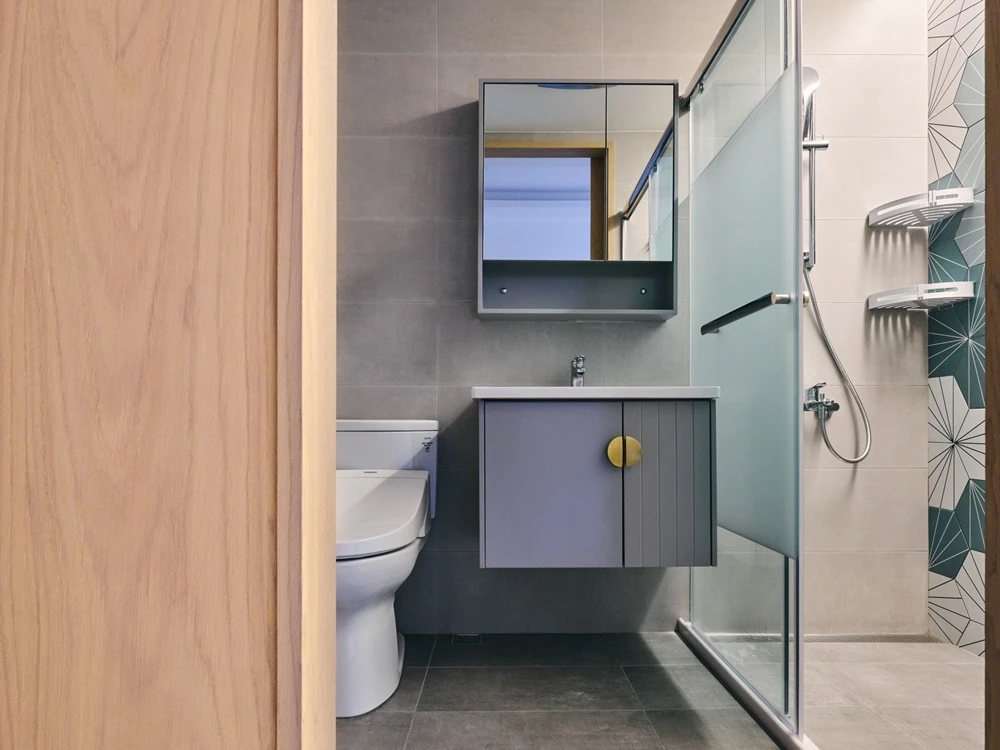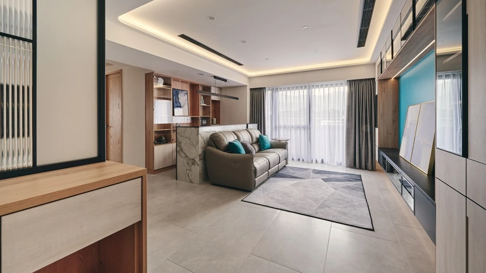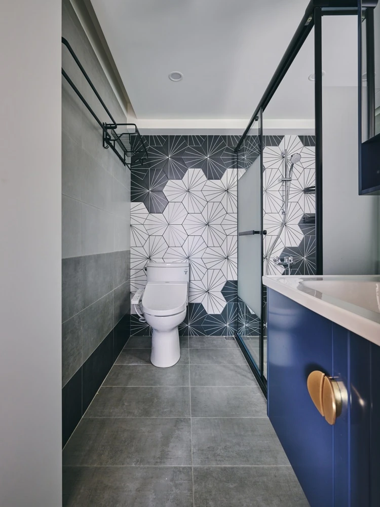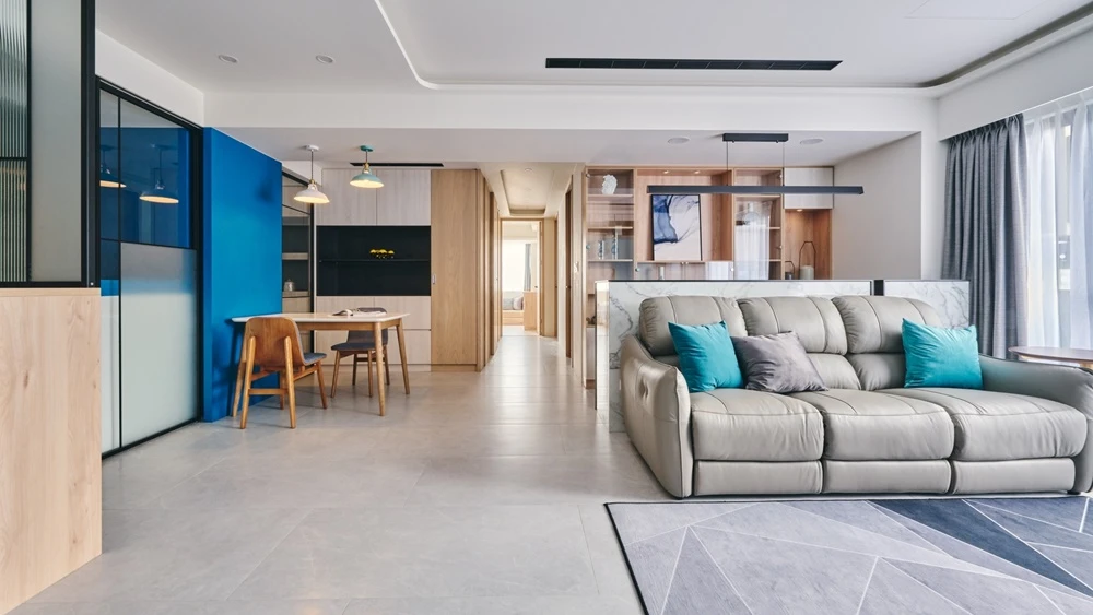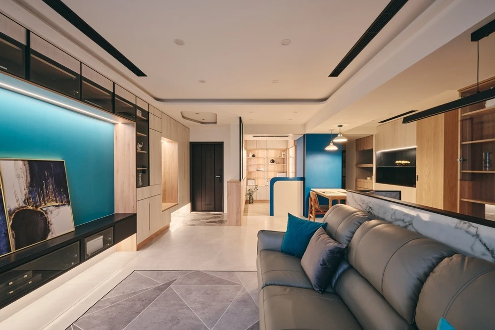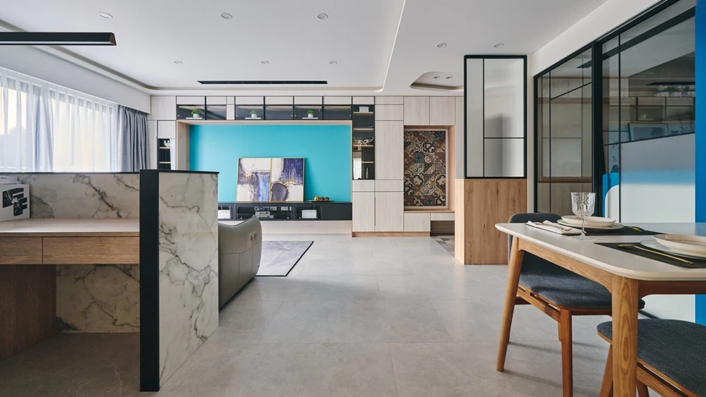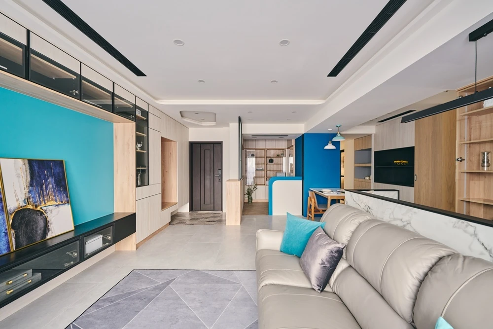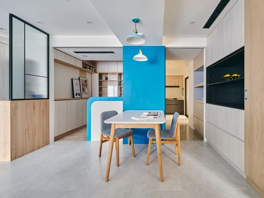 藍色系的色彩為空間帶來活潑的氣息,與眾不同的大膽色彩設置,讓空間因色彩而自然分區。