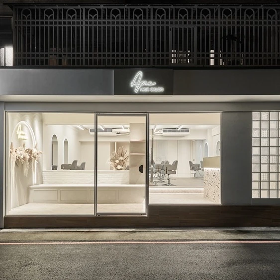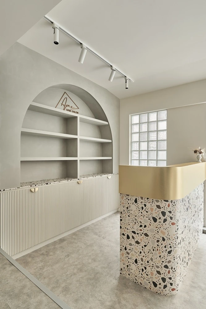 由於業主希望可以讓人經過就看到這間店,所以我們整個設計重點都放在門面上,從大門整面鐵框玻璃門可以一眼看到內部,除了可以直接看到金屬搭配水磨石櫃台之外,還可以看到造型網美牆以及展示牆,甚至還可以看到內部剪髮區,讓人一眼就知道這是一間網美美髮店。