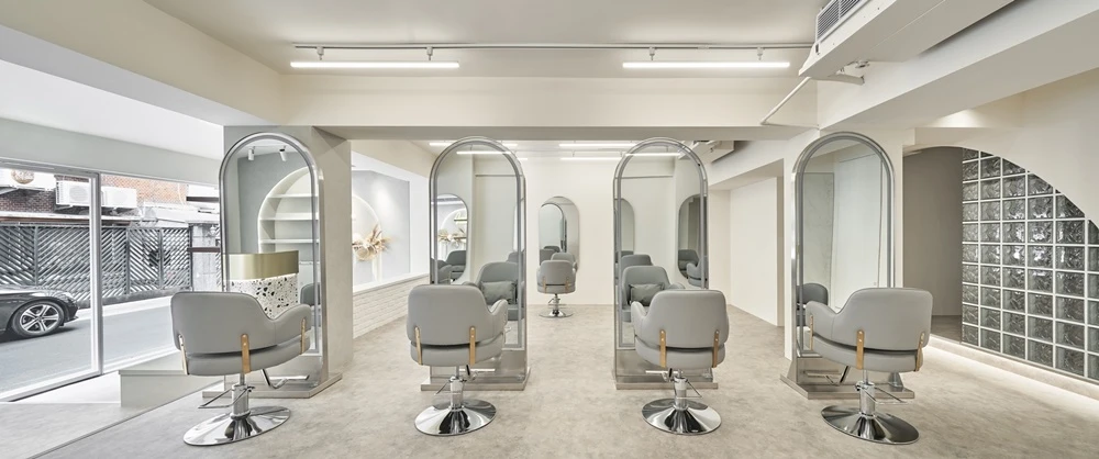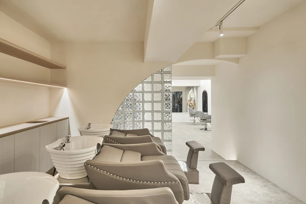 整體造型我們都以半圓弧設計為主,因為這間店的客人大部分是女性,所以希望用圓弧形設計讓空間看起來柔和一點,局部隔間使用玻璃磚豐富牆面設計還可以讓光穿透到內部~在櫃檯旁邊可以引進光源但又不完全透視保有隱私。為了符合客人氣質,我們也使用局部的金屬及石紋搭配,讓整體的質感提升,並且利用不同的燈光營造空間氛圍感,希望來到這間店的客人無論到哪一個空間,都可以放鬆舒適,無論坐在那裡,都可以拍網美照