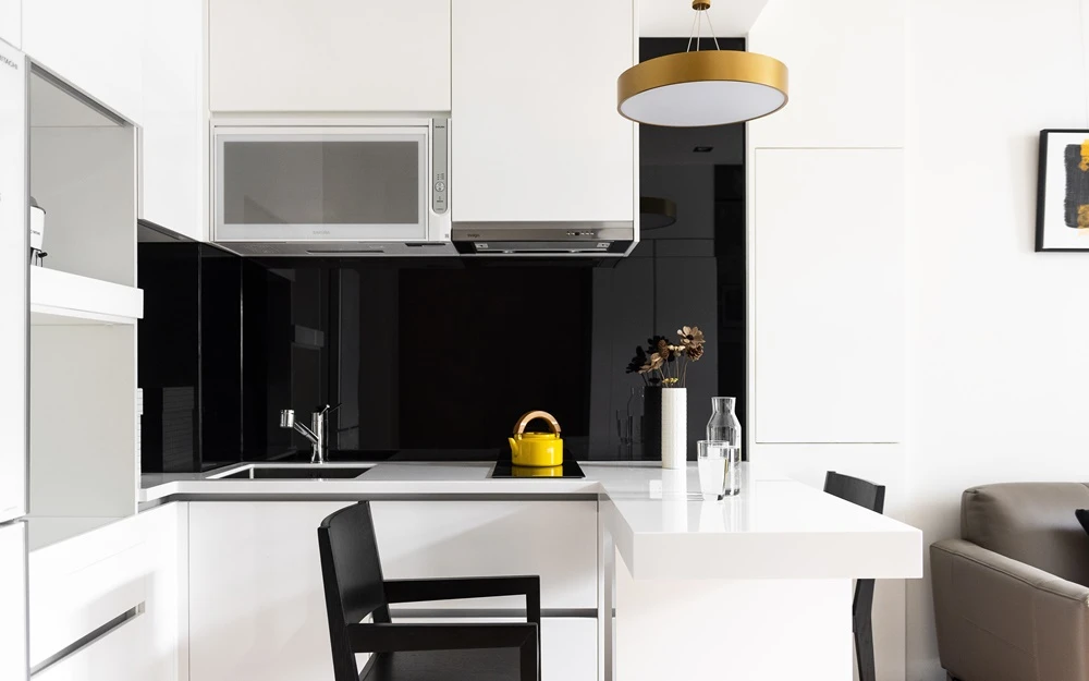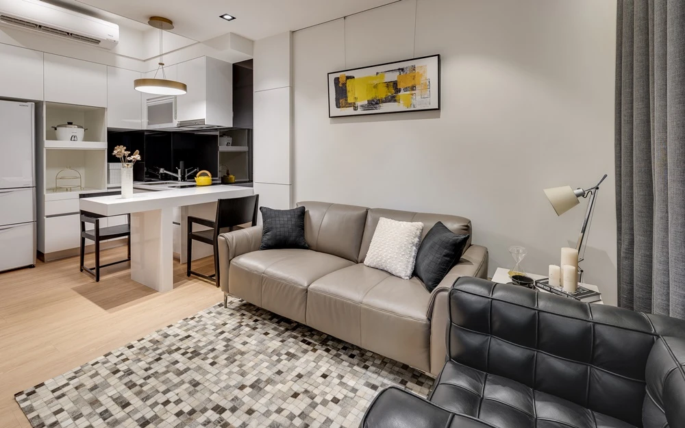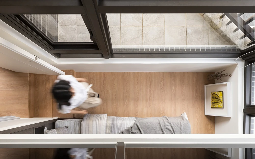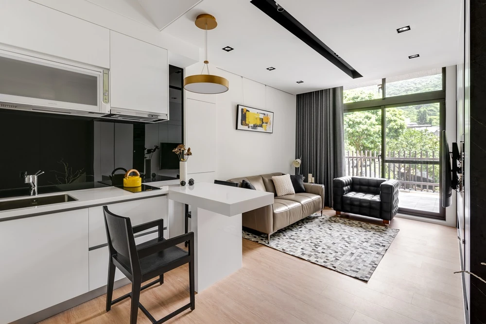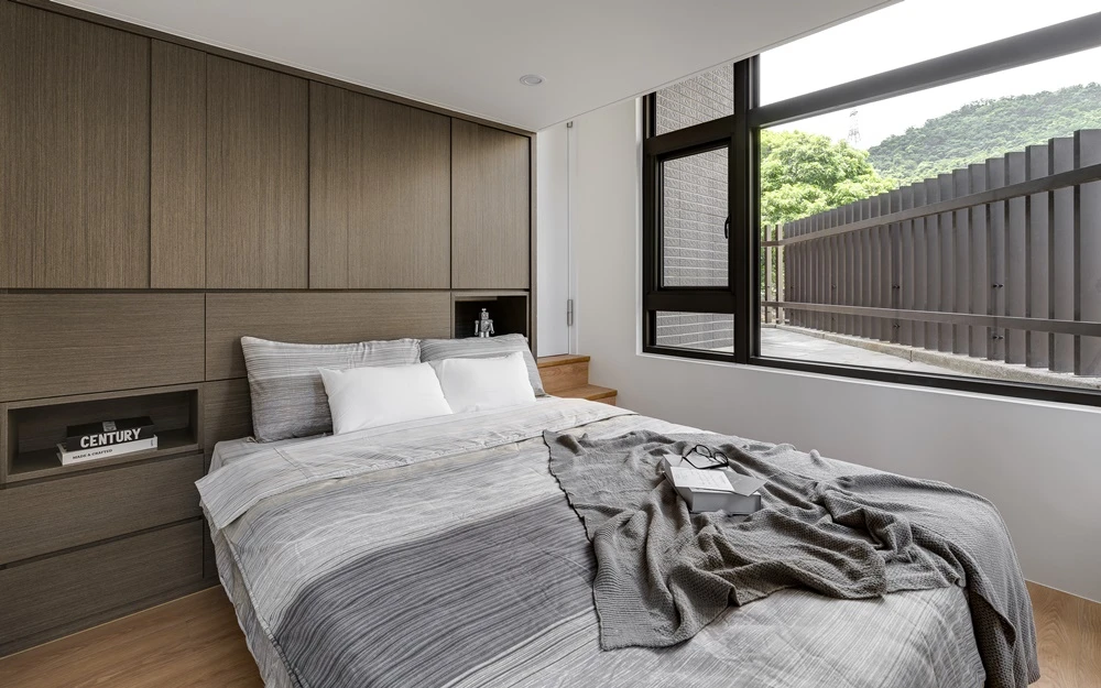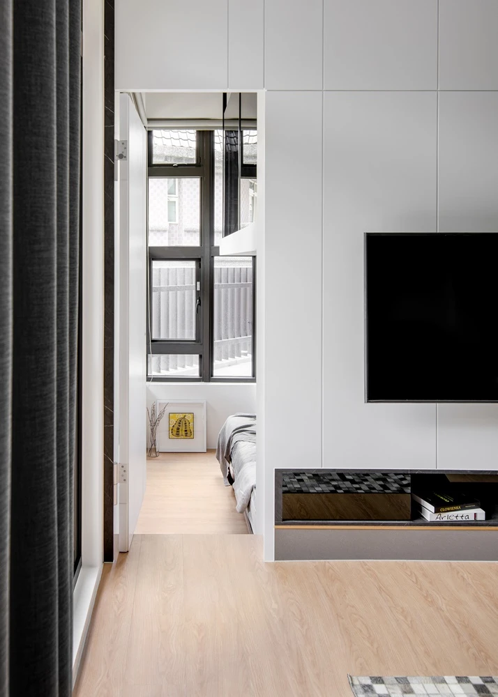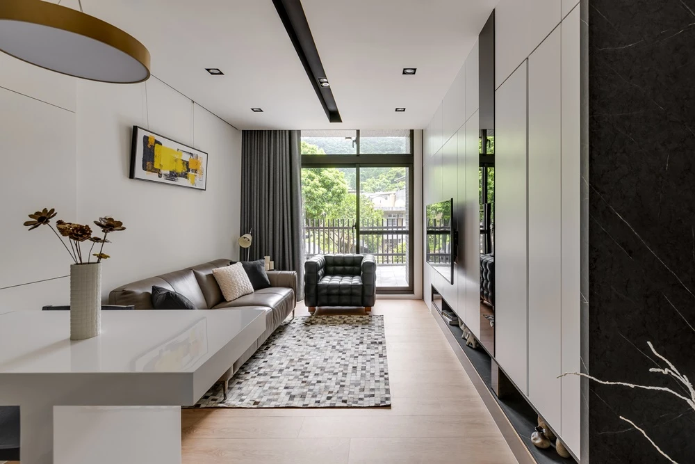 客廳搭配大面積的開窗作為中介引領自然光的流潟照射,光合作用靜俏俏的在發酵,讓人彷彿悠閒置身於度假天堂,一眼望去電視牆好比是一片沙灘,抬頭望層層海浪打向書櫃激盪出的浪花,搭配自然光線,無形中打造出空間和人的互動連結。