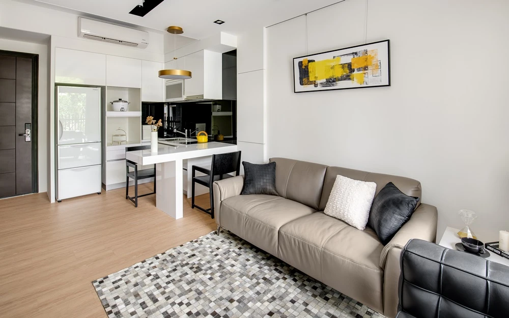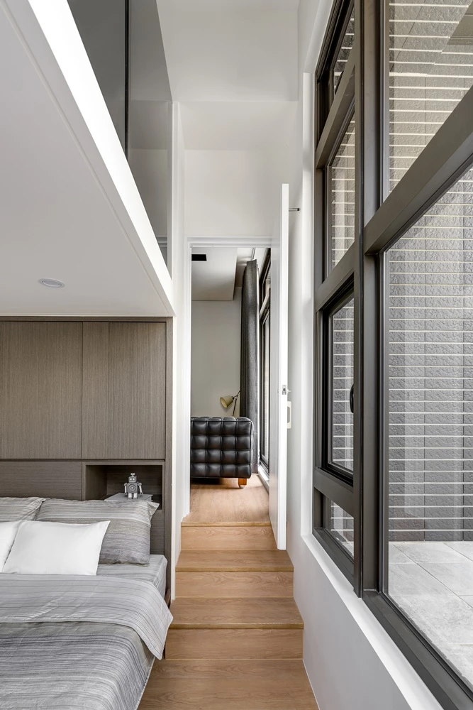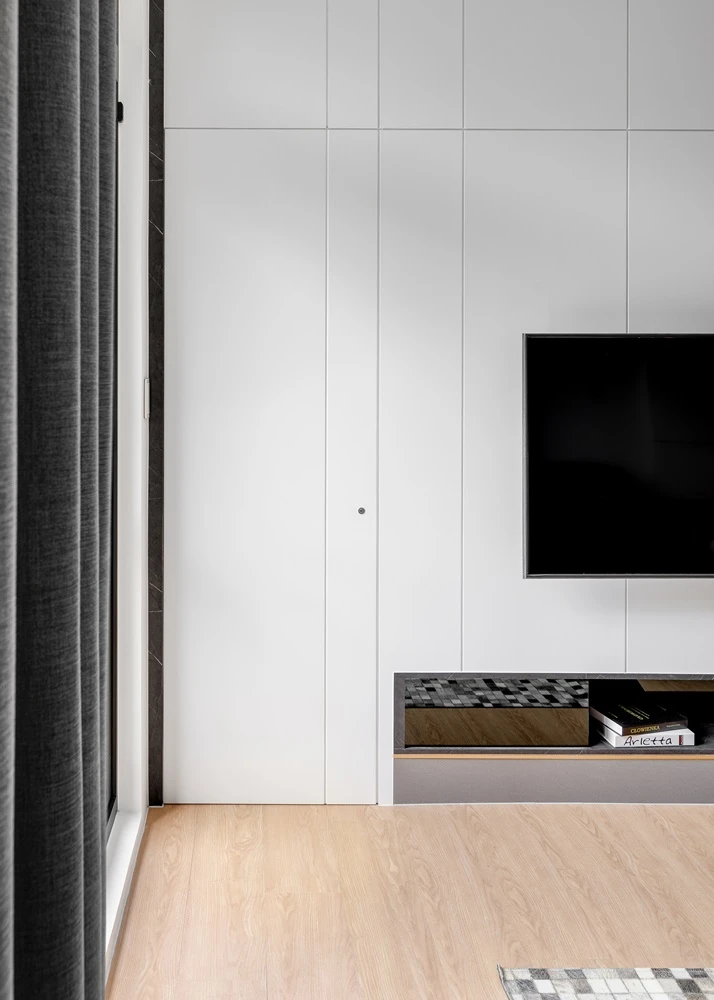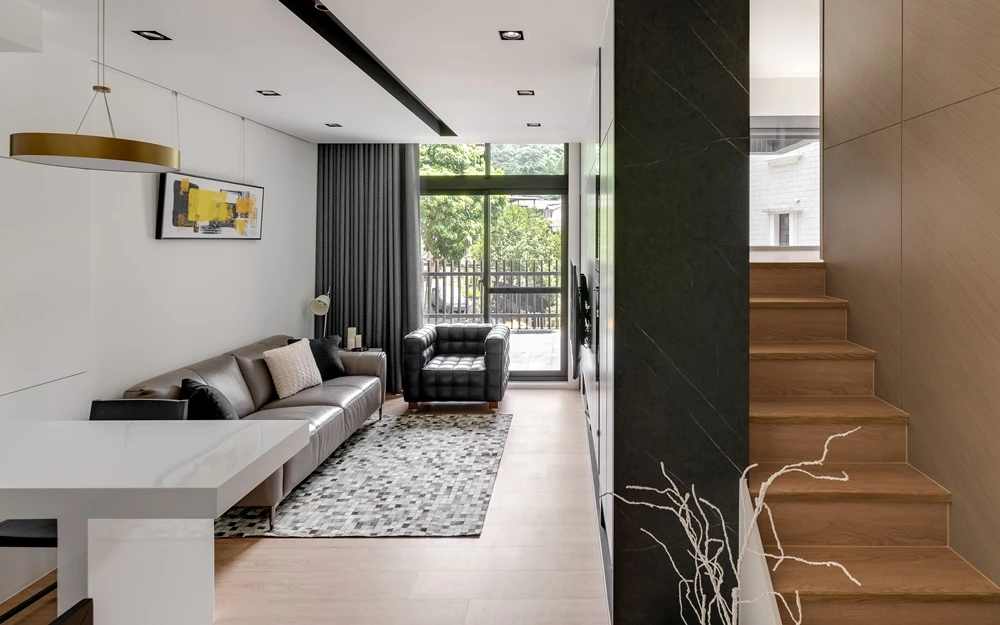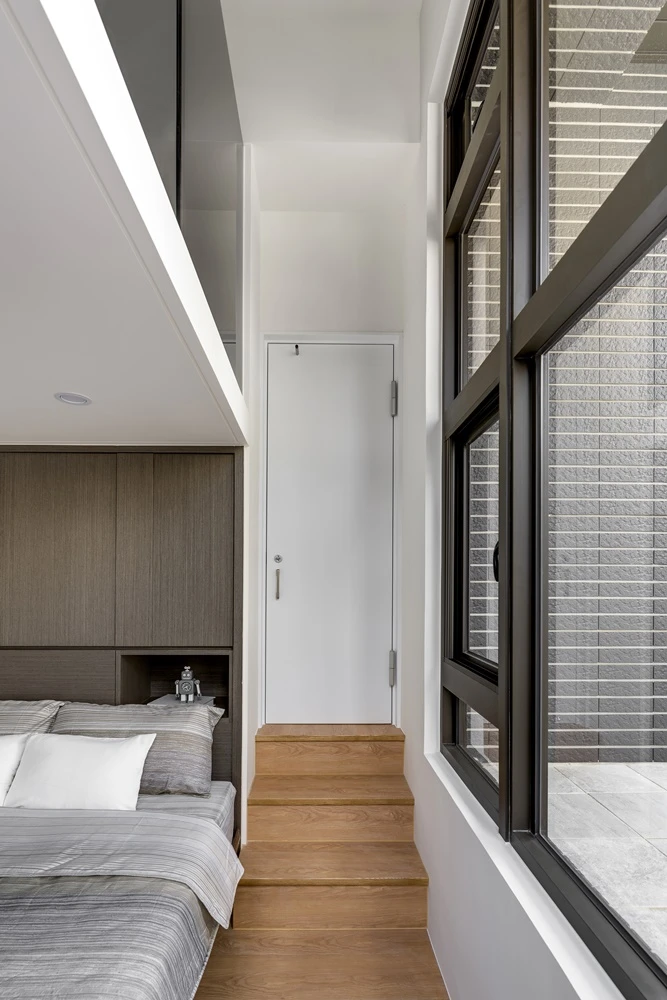 天井造就出光景,室內衍生出層層律動的波濤語彙,彷彿感覺著生命氣息正在流動,好比如人生的石階,一層一層往上爬,看到的美景也是一層一層的升高。實木釋出空間的友善環境理念和訴求乾淨簡潔的室內環境,玄關入口暗藏巧思,在入口兩側轉角勾勒出圓弧狀,就像是給家人的擁抱,回歸到家的初衷,打造出空間和人的互動對話。