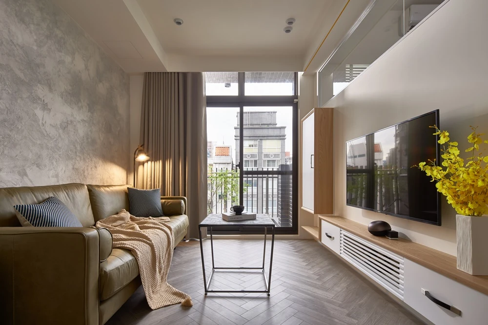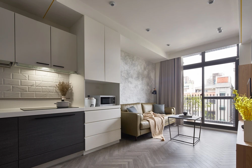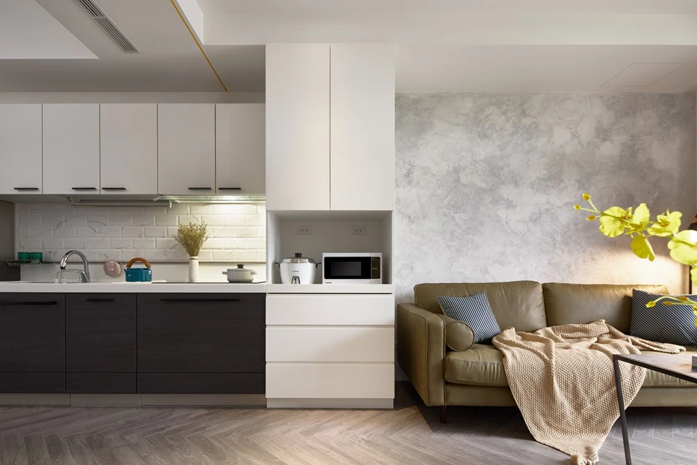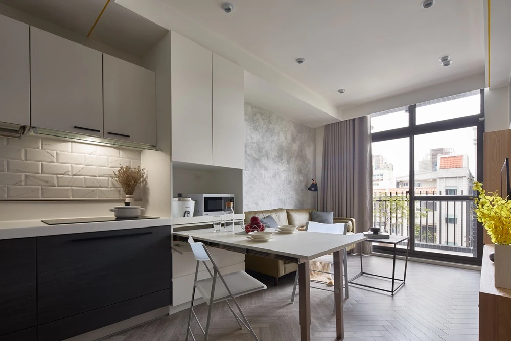 在有限的空間,不僅將色彩輕柔的帶入居家環境內,還加入了大量收納櫃,另規劃了「隱形餐桌」讓客餐廳隨時保持使用彈性的開放空間,解決居家小坪數常見的空間受限、收納不足問題。