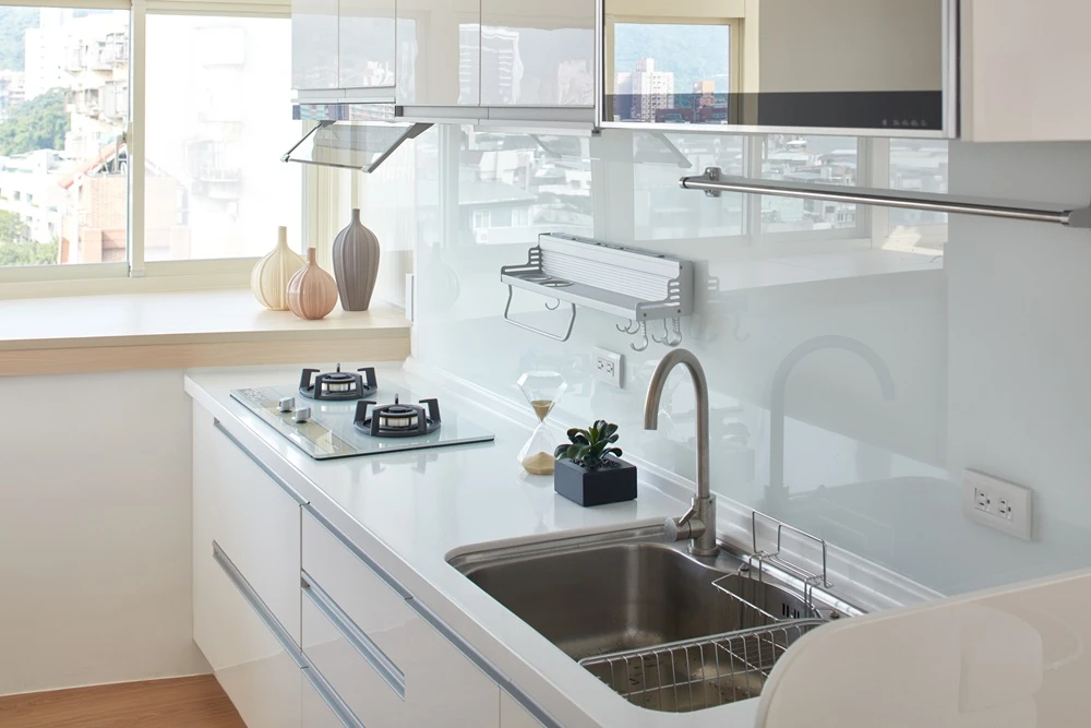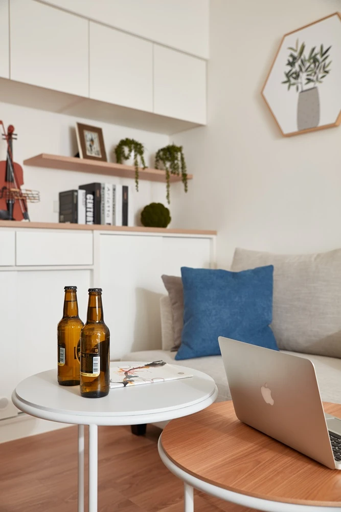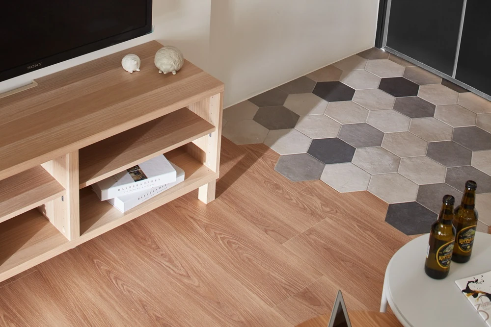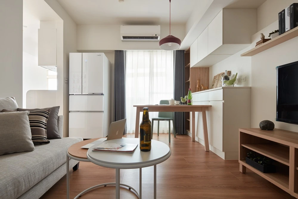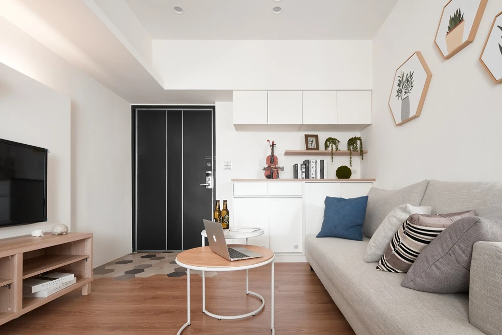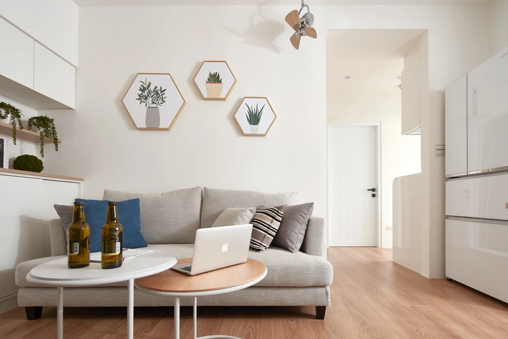 因女屋主工作壓力大,希望回到家可以徹底放鬆,優尼客空間設計特地以「無印良品風」為定調,透過輕淺明亮的色調,鋪陳一室簡約清爽的居家氛圍。而在細節之處也能看見創意巧思,像是玄關地坪採用六角磚拼貼,使落塵區跳脫制式框架,並與沙發背牆上的六角型畫框相呼應,為居家空間增添活潑表情。