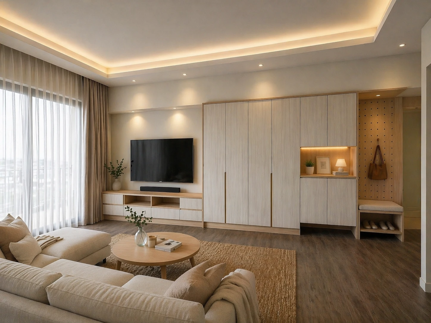電視牆規劃低檯度電視櫃,搭配整面系統收納櫃與展示空間,兼具美觀與實用,提升空間整體整潔度。