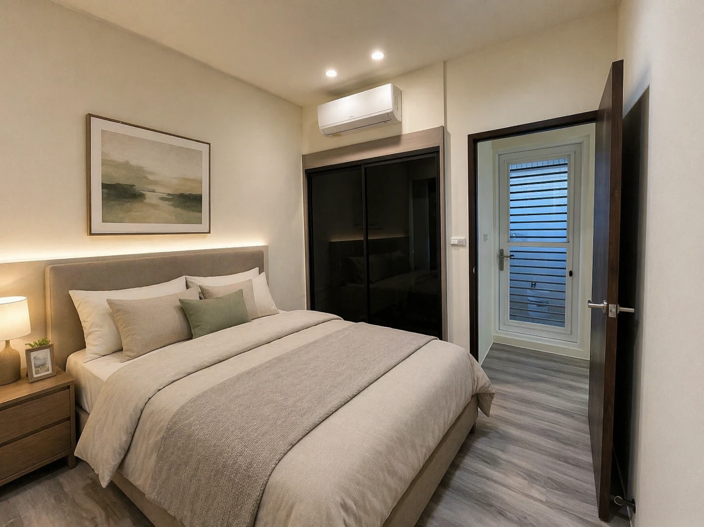 窗邊規劃整面窗簾系統,選用具紋理感的布料,平衡採光與隱私需求。自然光於日間透入,與室內暖色溫照明交織,營造出日夜皆宜的光環境層次。