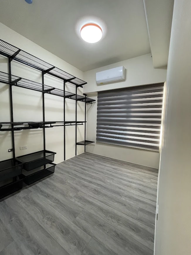 空間規劃上,採開放式客餐廳配置,透過電視主牆作為視覺核心,串聯整體動線。立面選用低彩度灰米色塗料,搭配隱藏式間接照明,柔化牆面量體,同時提升空間縱深感。懸浮式電視櫃延伸水平視覺,降低壓迫感,並整合收納機能,使立面更顯俐落純粹。