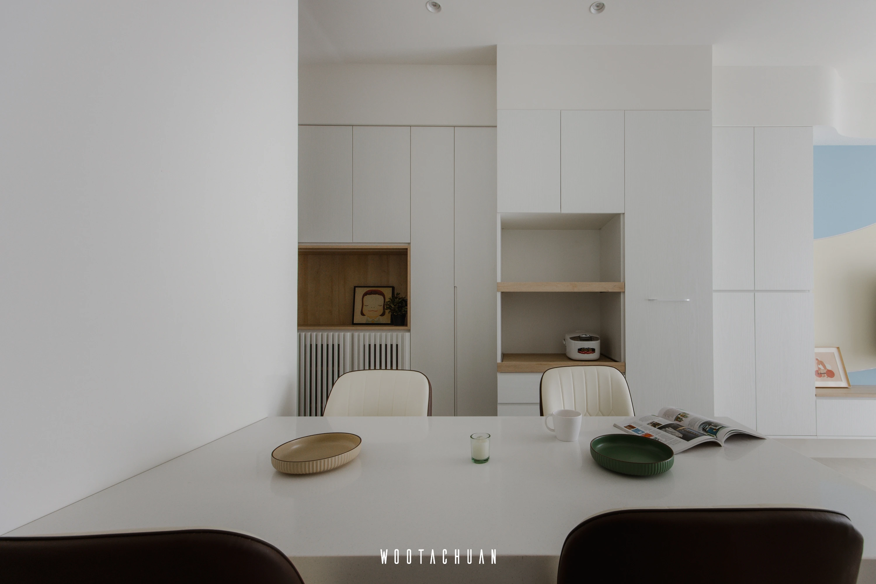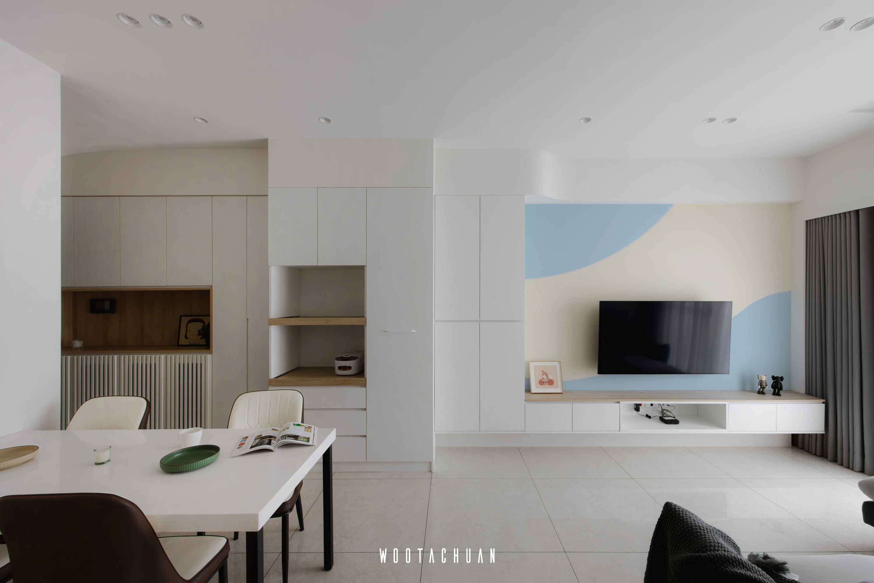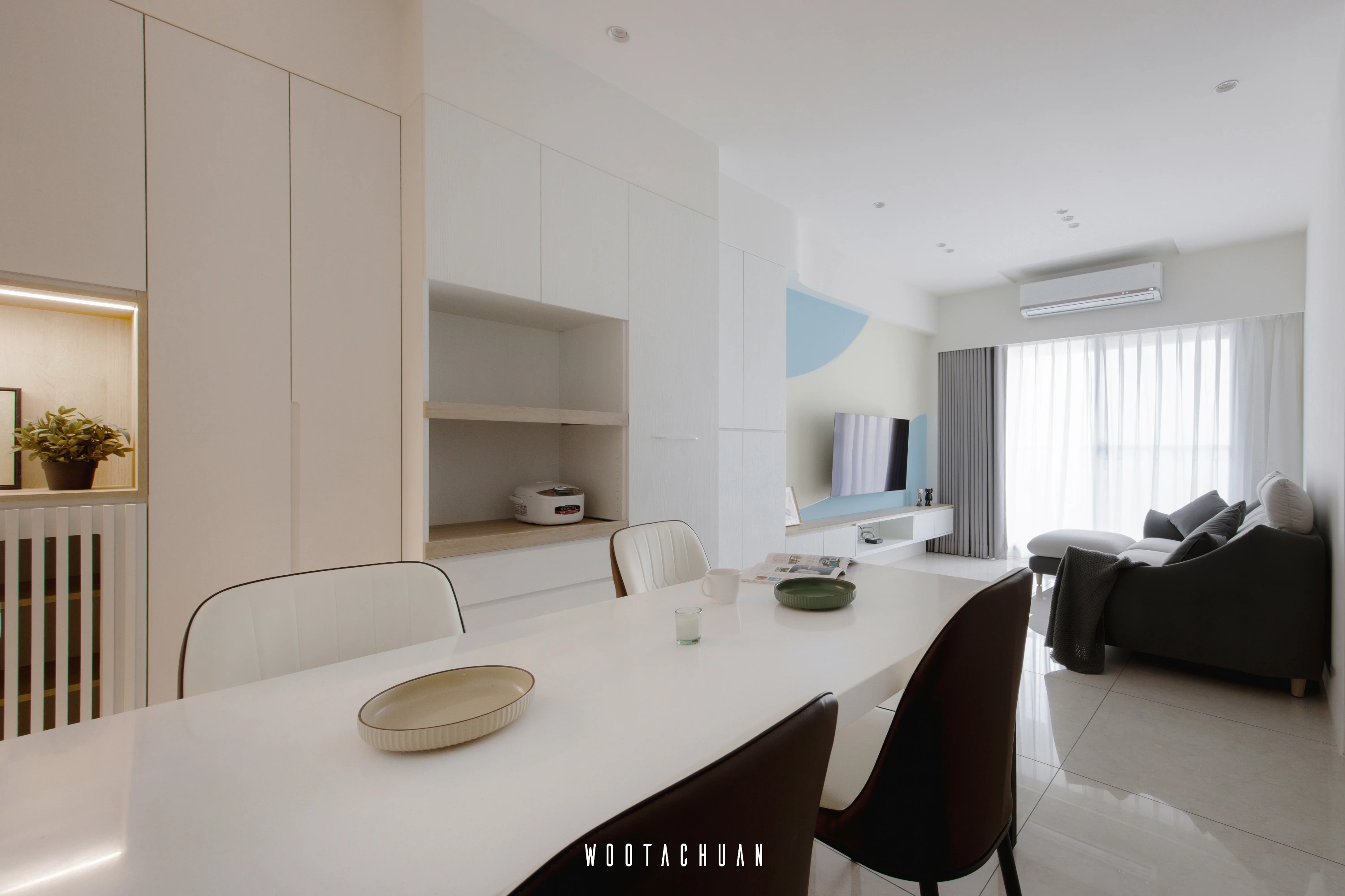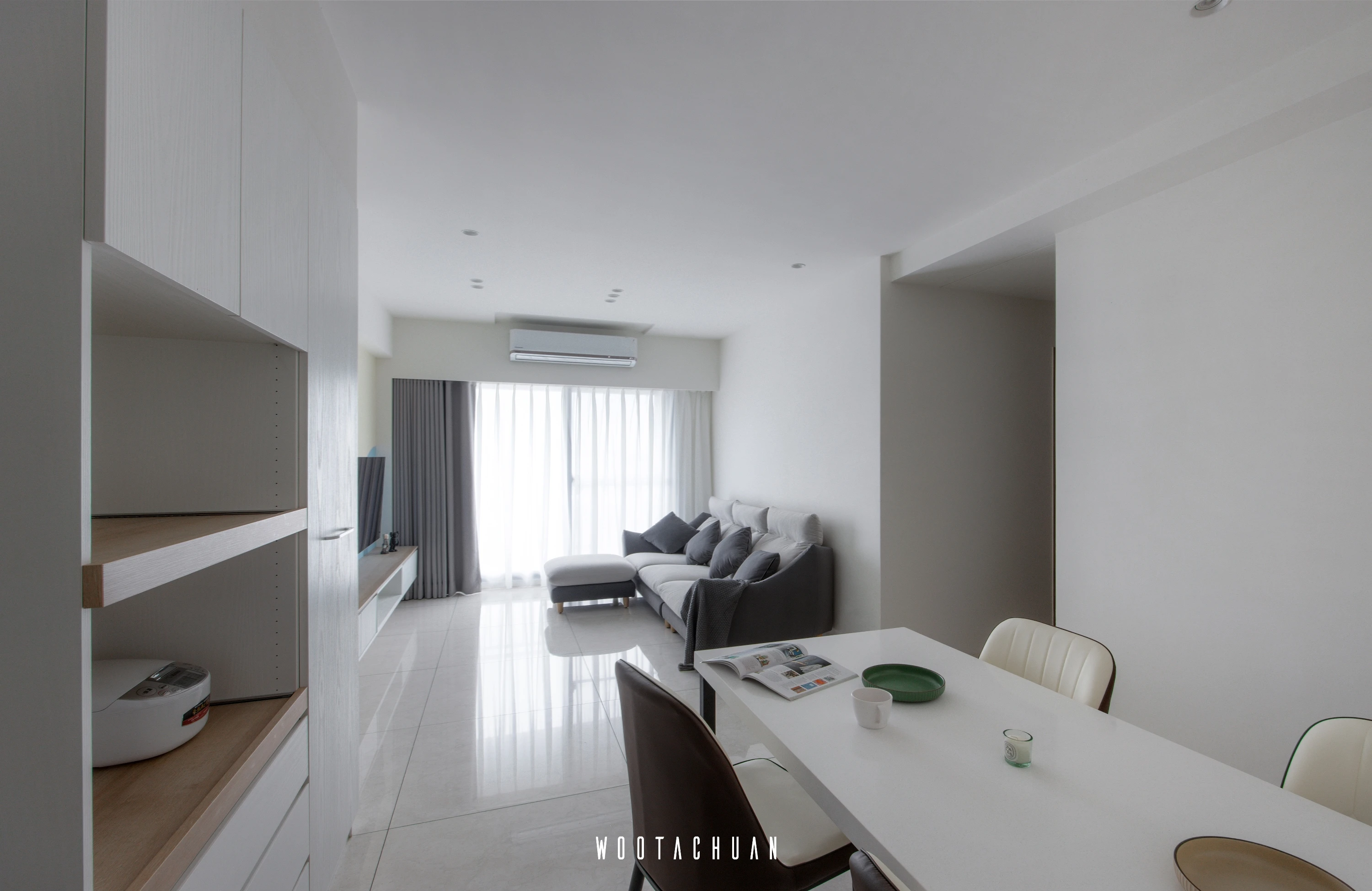 巨⼤的玻璃窗⼾讓陽光穿透 映照出柔和的光影 彷彿雲朵在輕輕飄動 。