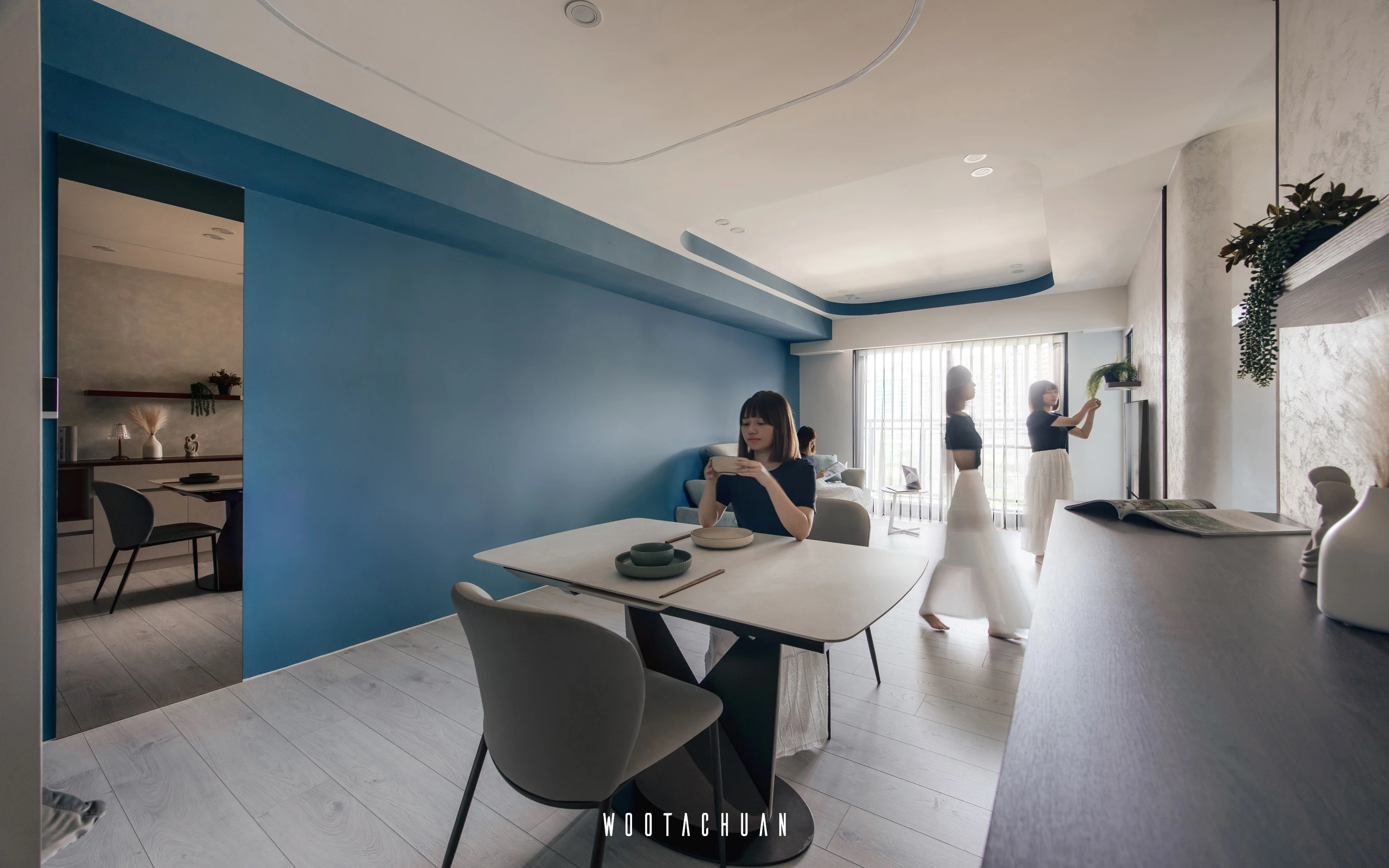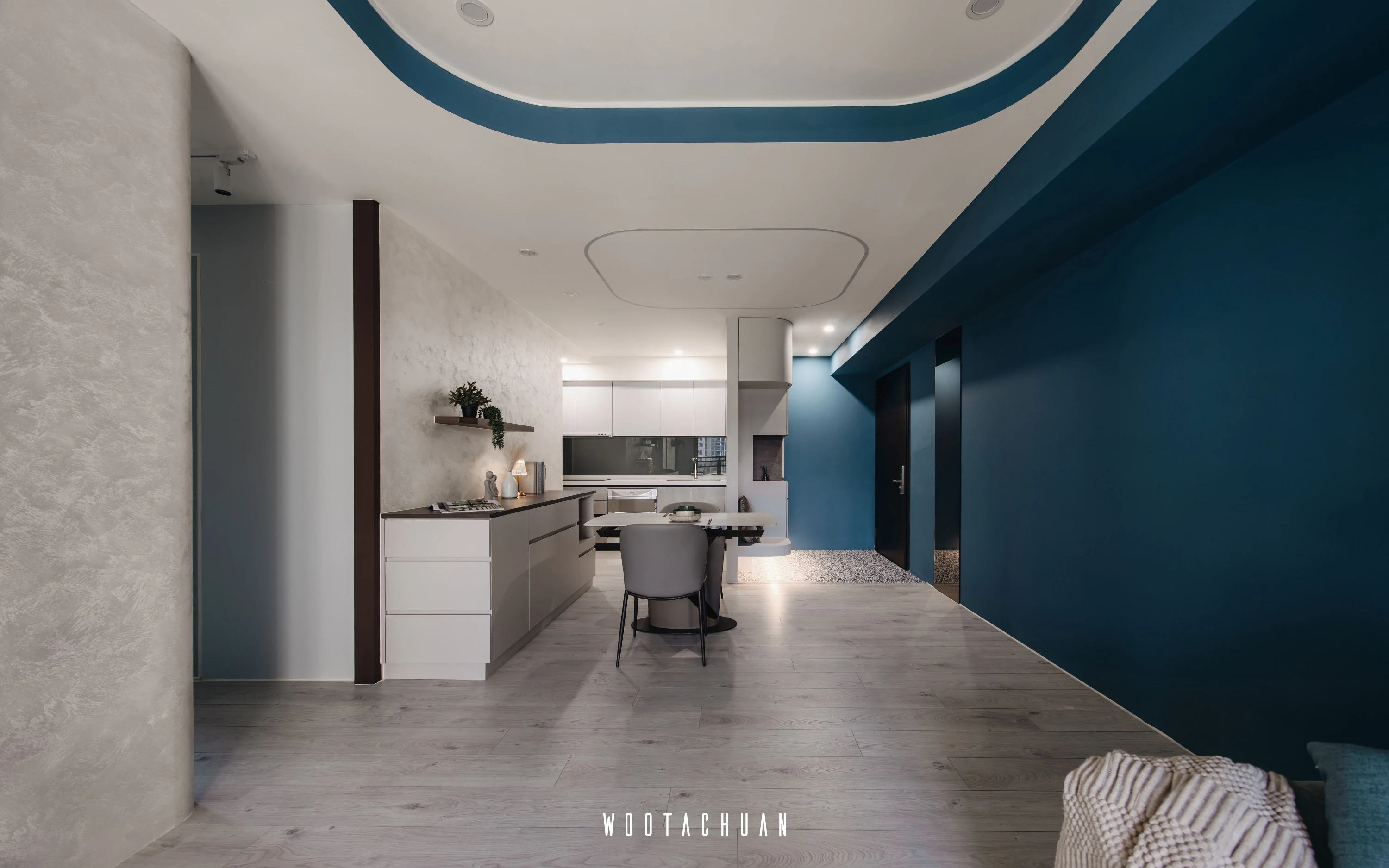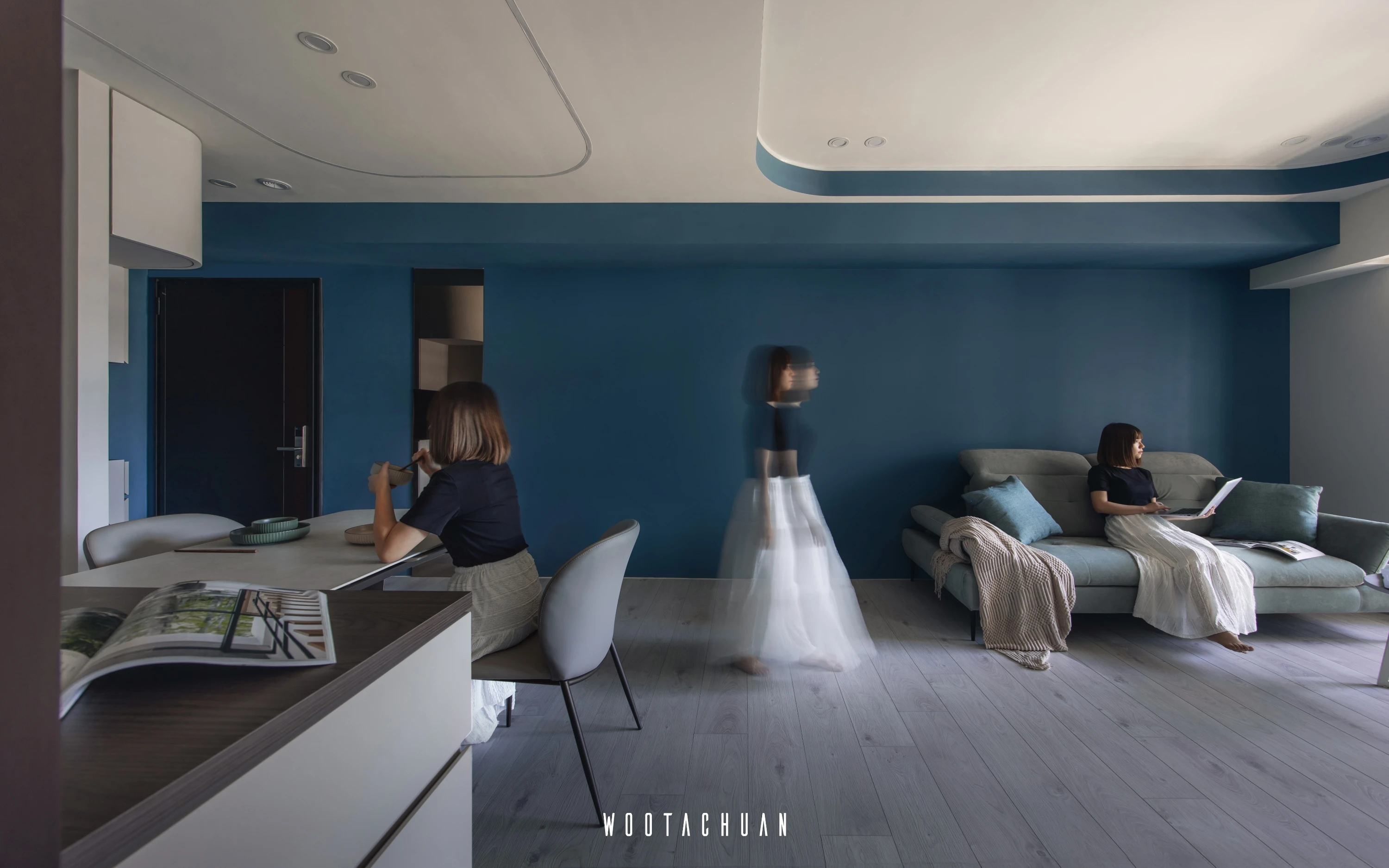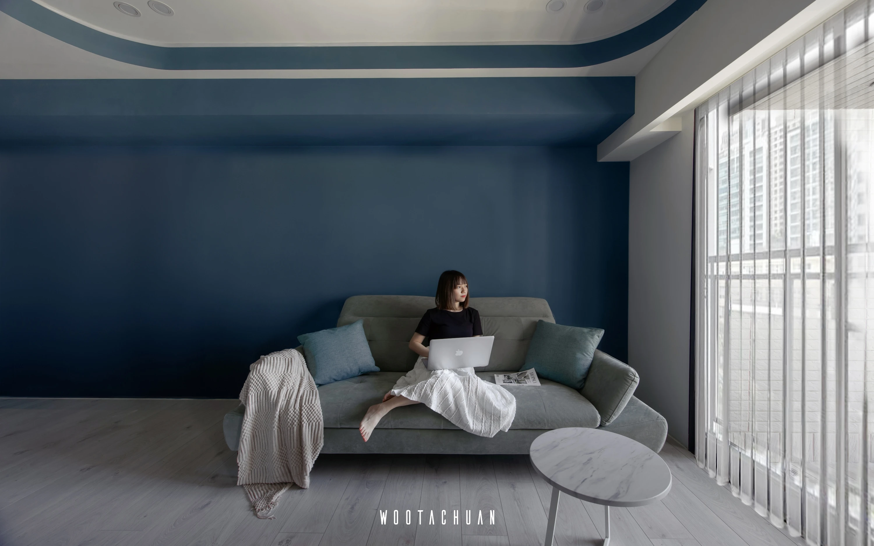 調簡約與質感的融合 。 整⾯蔚藍的沙發背牆成為空間的視覺焦點 搭配質感藝術漆
