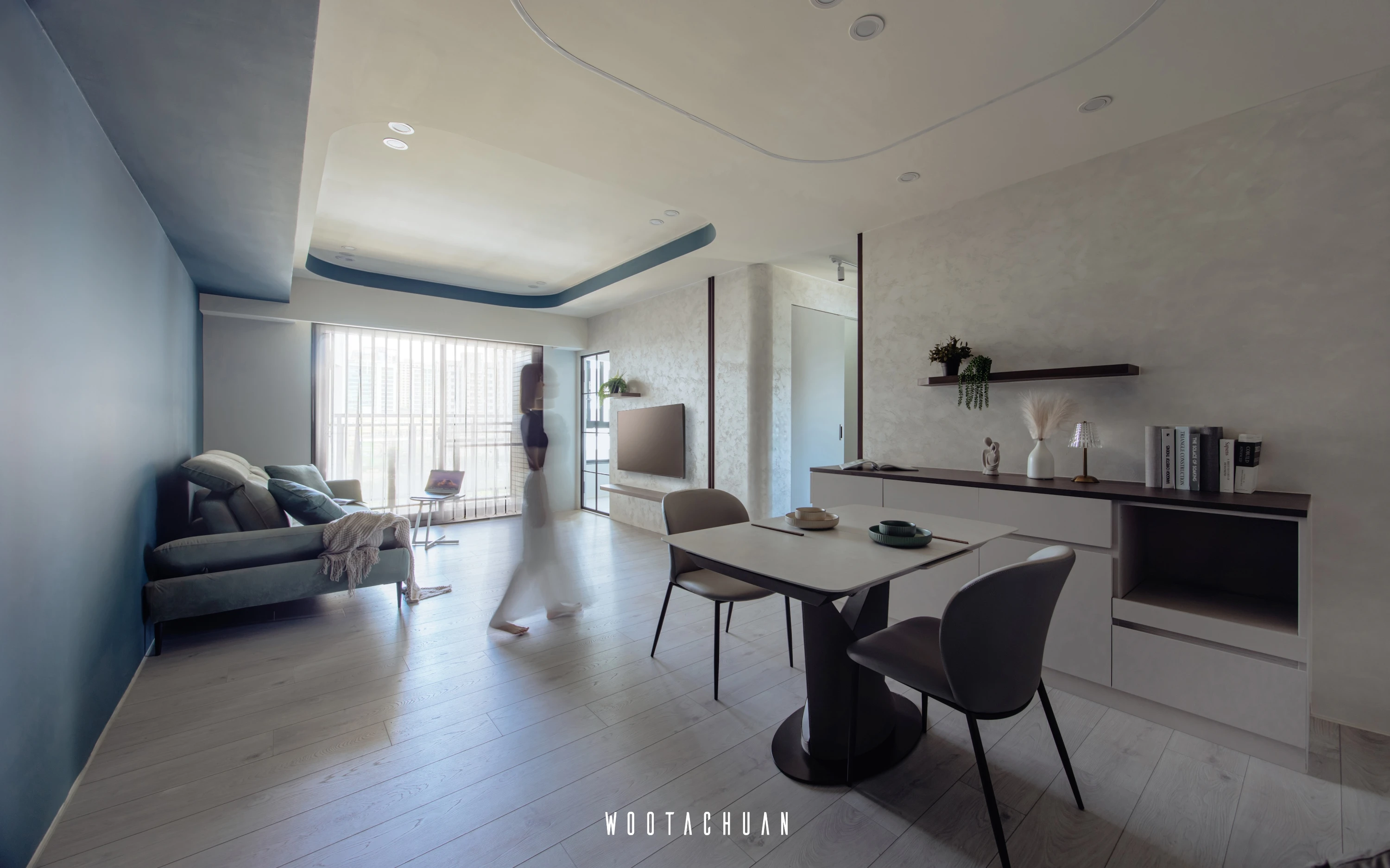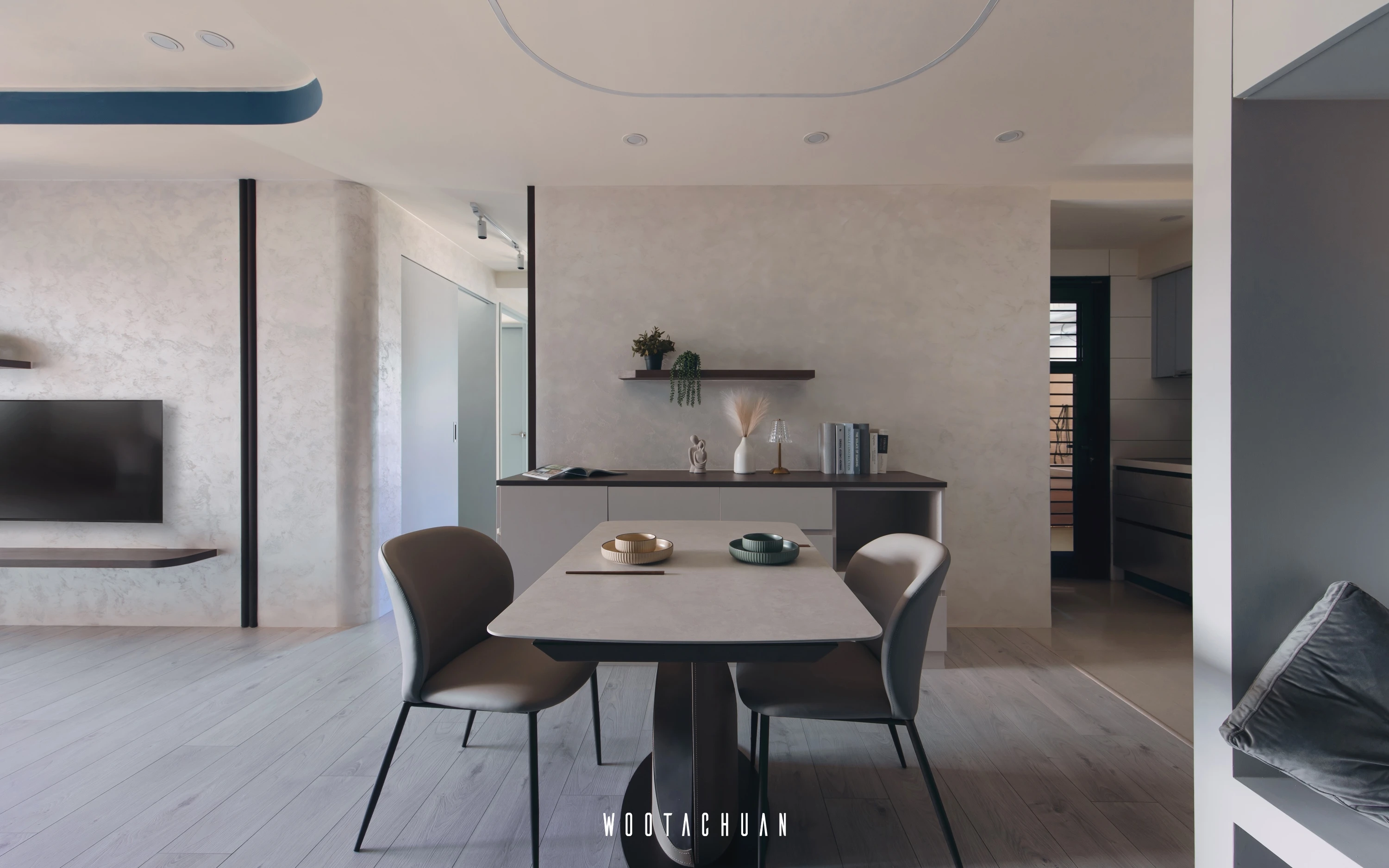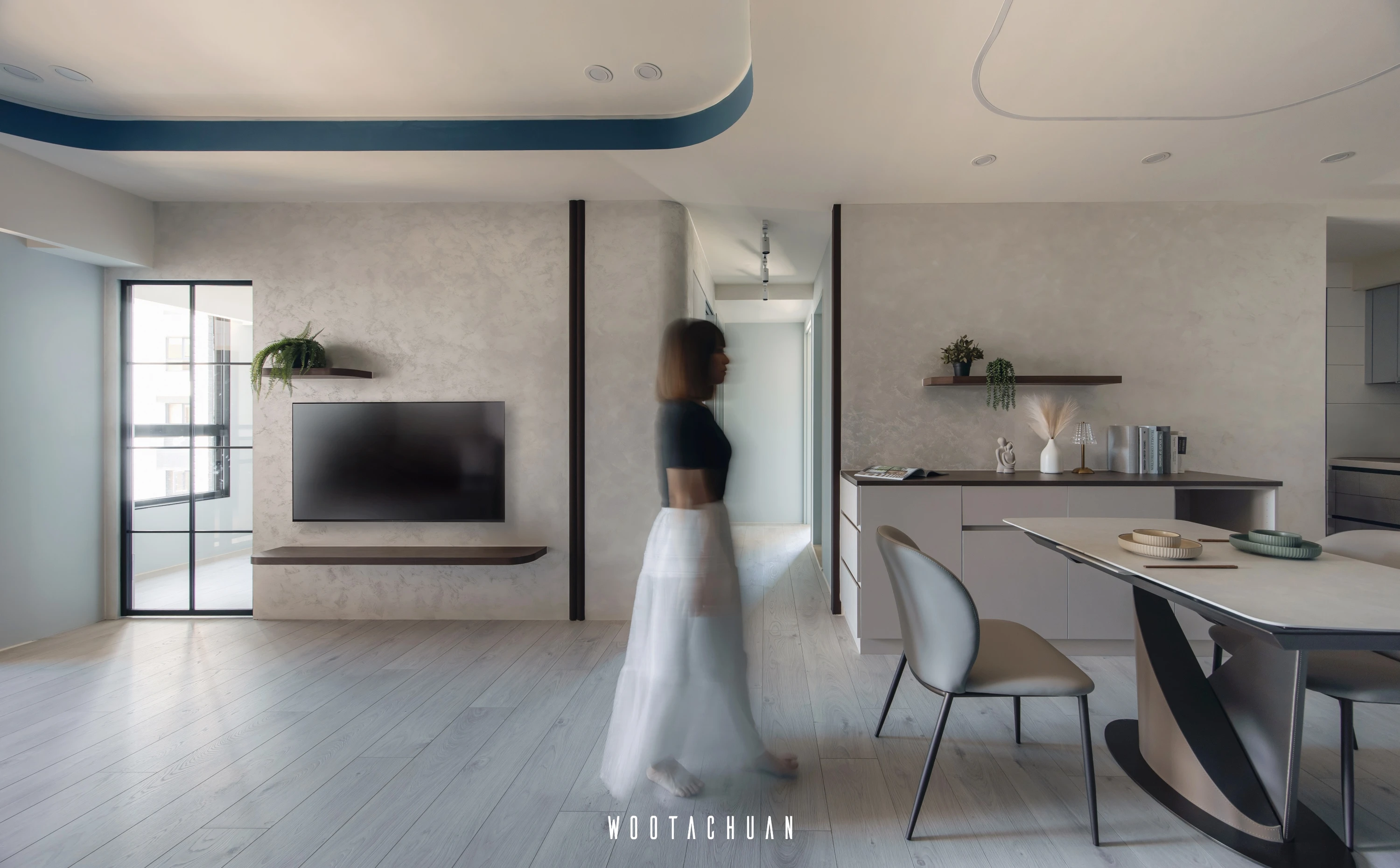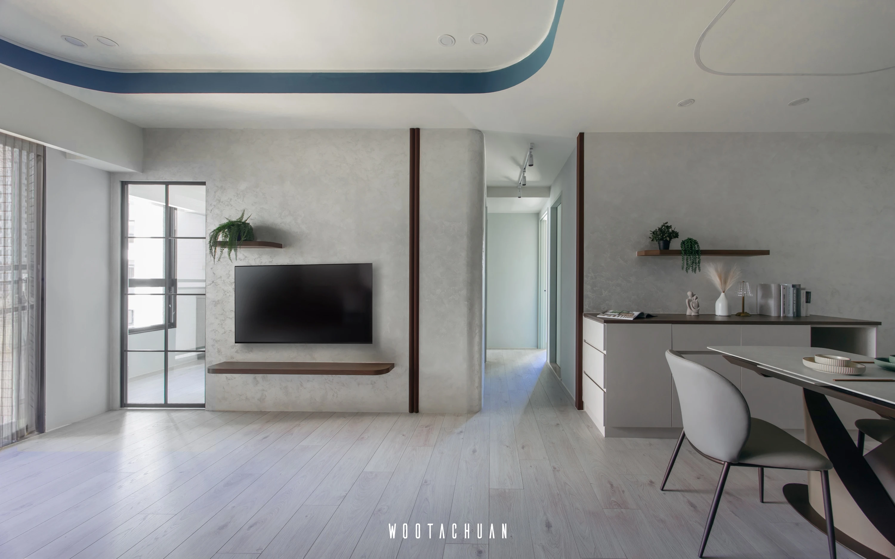 調簡約與質感的融合 。 整⾯蔚藍的沙發背牆成為空間的視覺焦點 搭配質感藝術漆