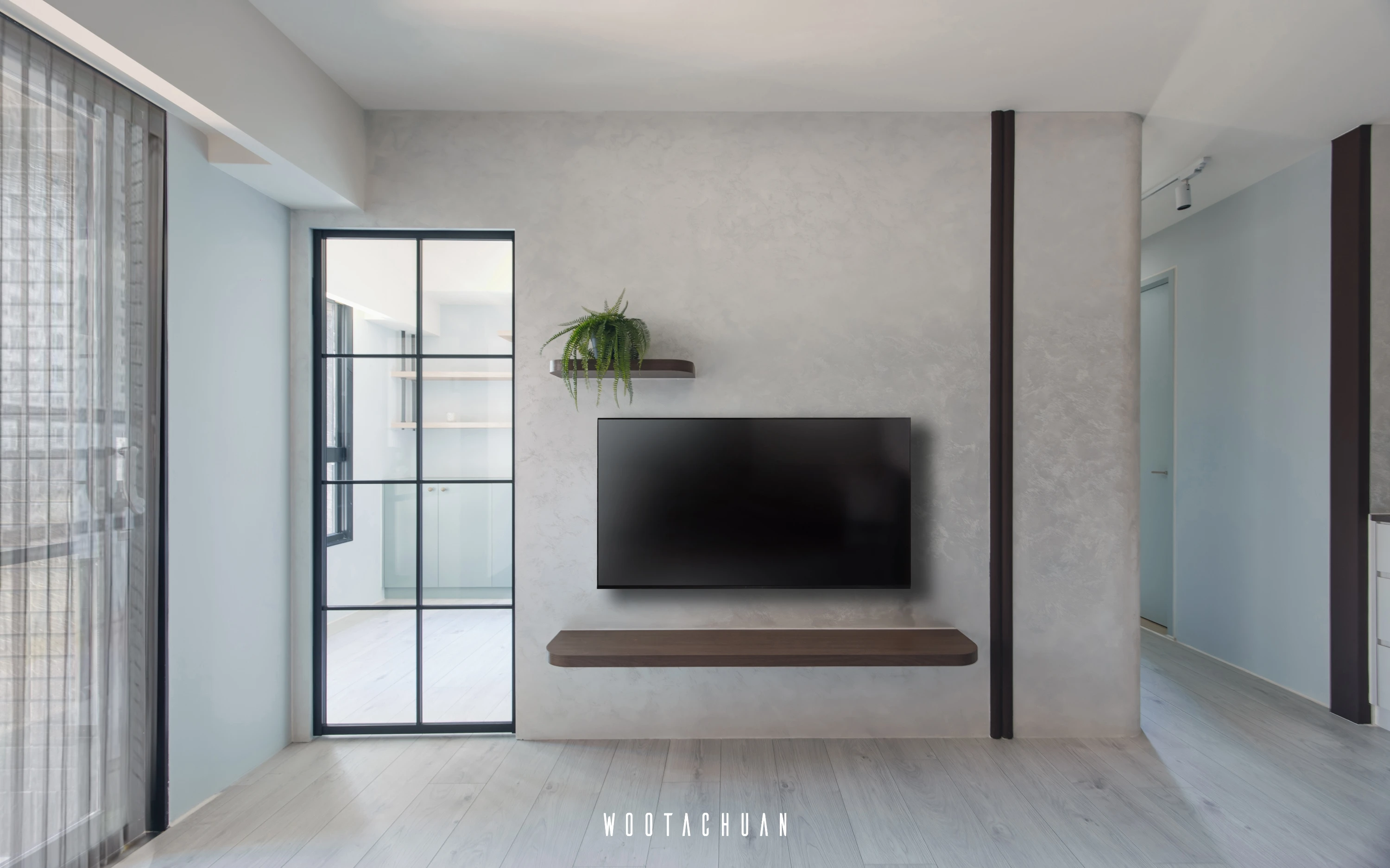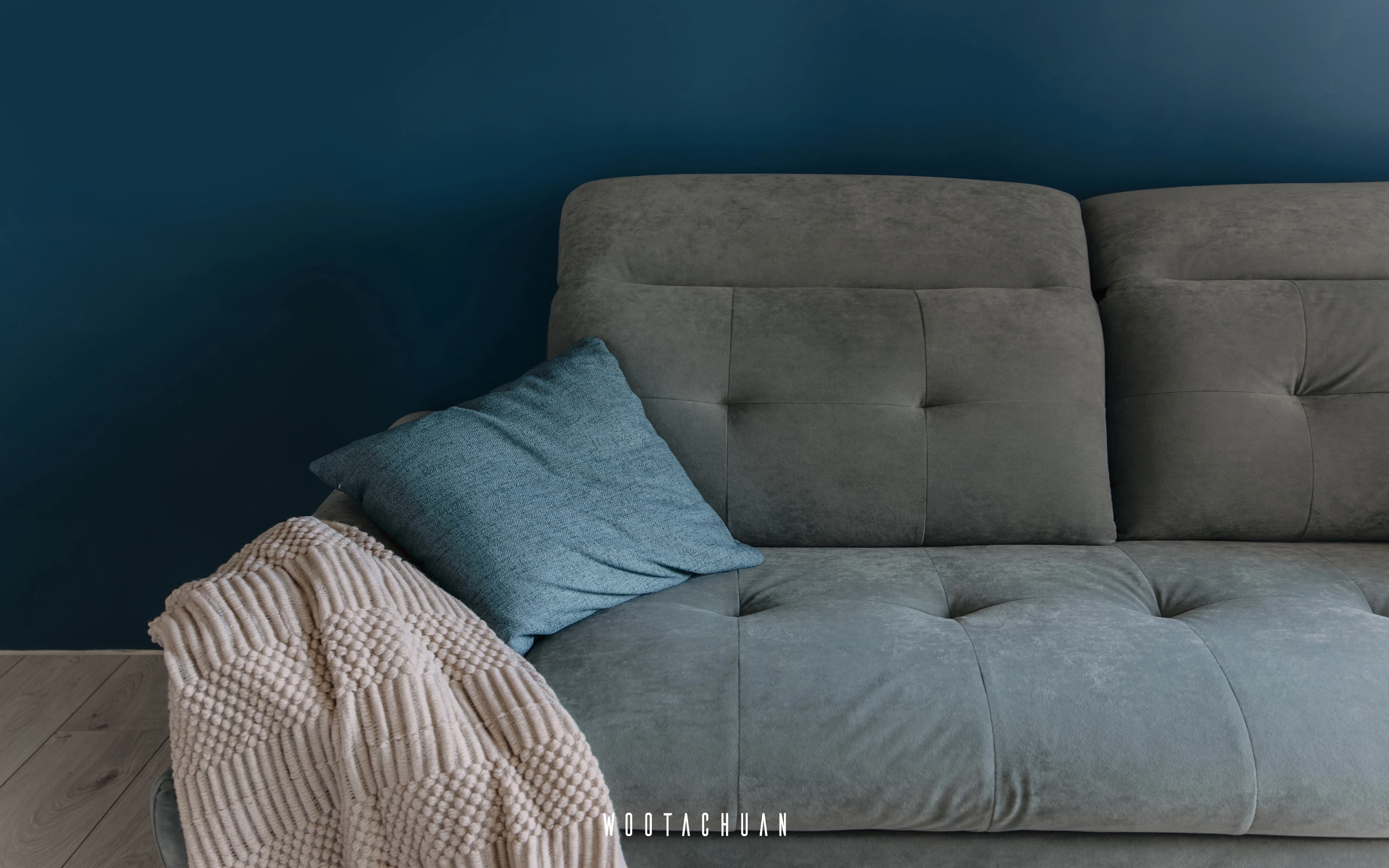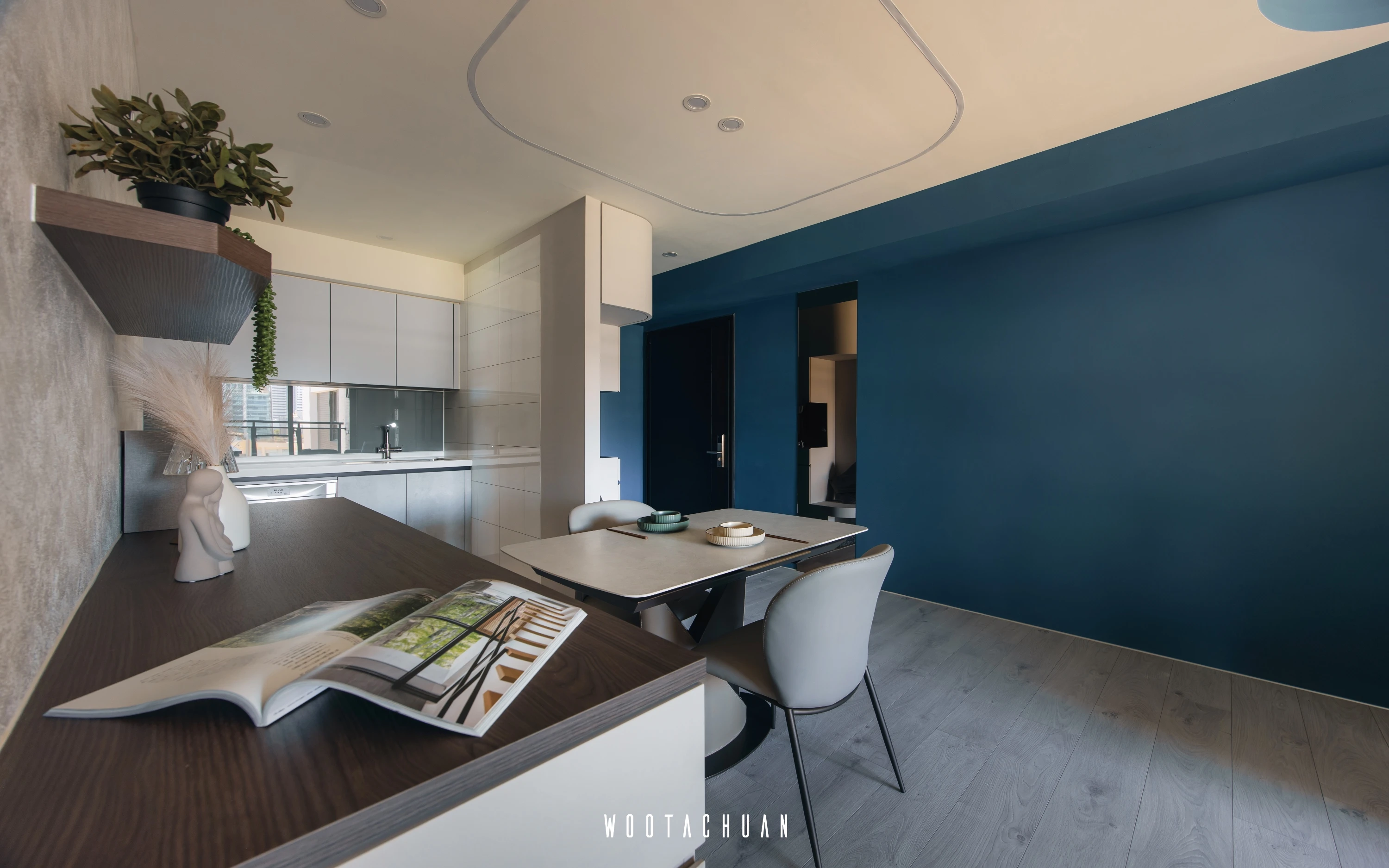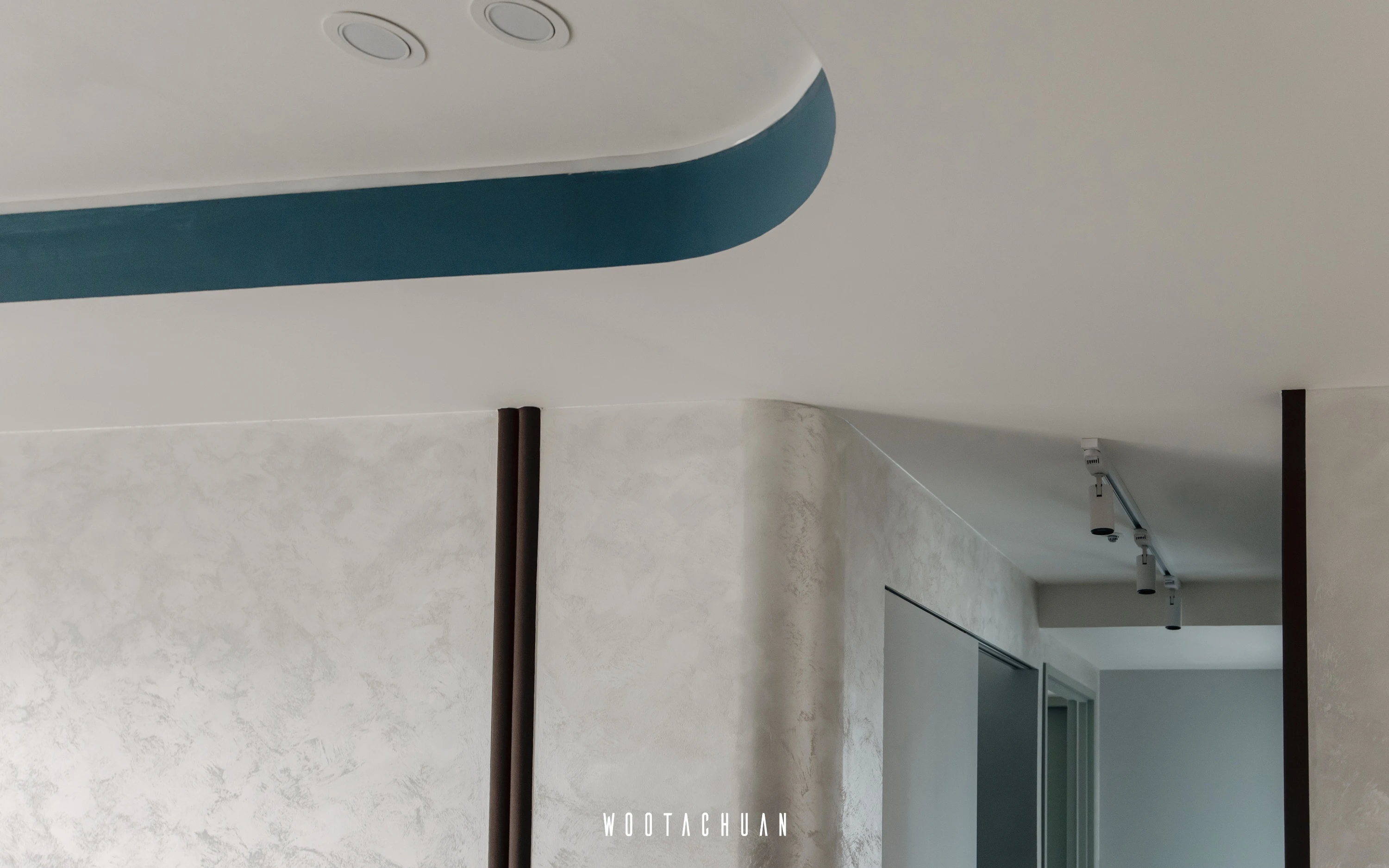 調簡約與質感的融合 。 整⾯蔚藍的沙發背牆成為空間的視覺焦點 搭配質感藝術漆